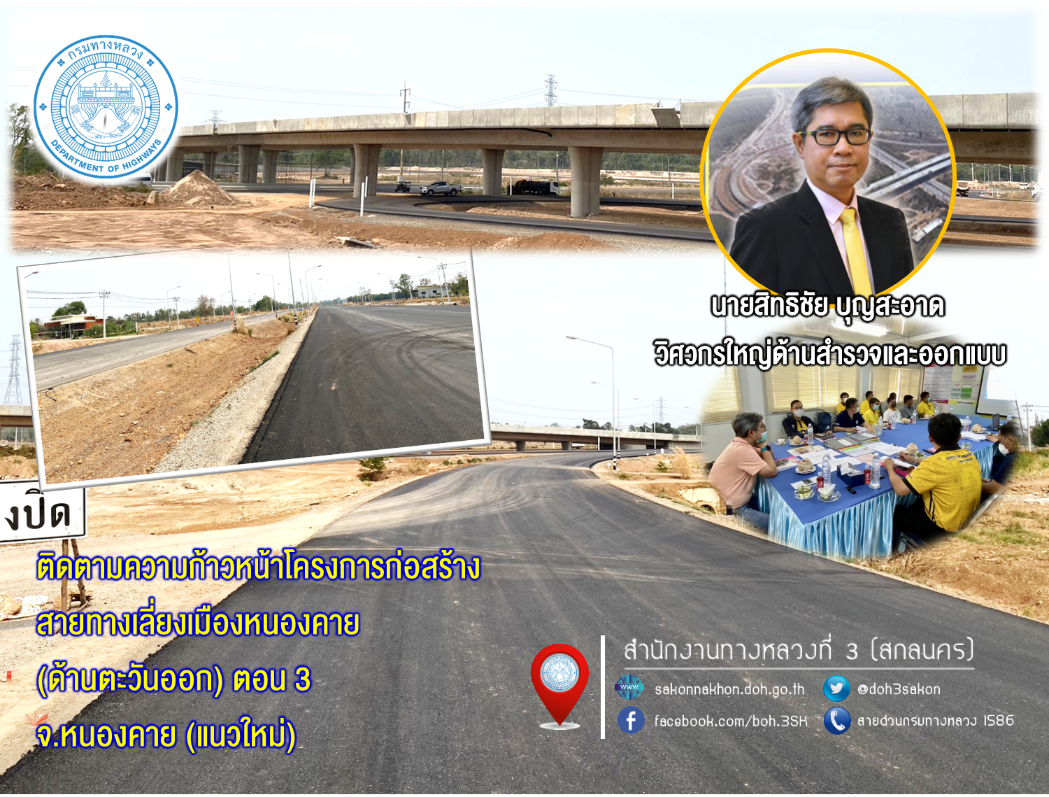 นายสิทธิชัย บุญสะอาด วิศวกรใหญ่ด้านสำรวจและออกแบบ ประธานกรรมการตรวจรับพัสดุ พร้อมด้วยนายพัลลภ จันทร์งามปภากูล ผู้อำนวยการสำนักงานทางหลวงที่ 3 กรรมการตรวจรับพัสดุ และคณะกรรมการตรวจรับพัสดุ ลงพื้นที่ติดตามความก้าวหน้าโครงการก่อสร้างสายทางเลี่ยงเมืองหนองคาย (ด้านตะวันออก) ตอน 3 ในท้องที่ ตำบลหาดคำ อำเภอเมือง จังหวัดหนองคาย (แนวใหม่) ระหว่าง กม.11+000 - กม.16+127.164 ระยะทางรวม 4.527กม. วงเงินงบประมาณ 678,236,300 บาท (ตรวจรับงานงวดที่ 12 ) โดยมี บริษัท วนิชชัยก่อสร้าง (1979)จำกัด เป็นผู้รับจ้าง เพื่อให้การดำเนินงานก่อสร้างทางหลวงแผ่นดินได้ตามแบบมาตรฐานของกรมทางหลวง พร้อมรับฟังบรรยายสรุปผลการดำเนินงานของโครงการฯ ณ สำนักงานชั่วคราวของโครงการฯ ควบคุมการก่อสร้างโดยสำนักก่อสร้างทางที่ 2