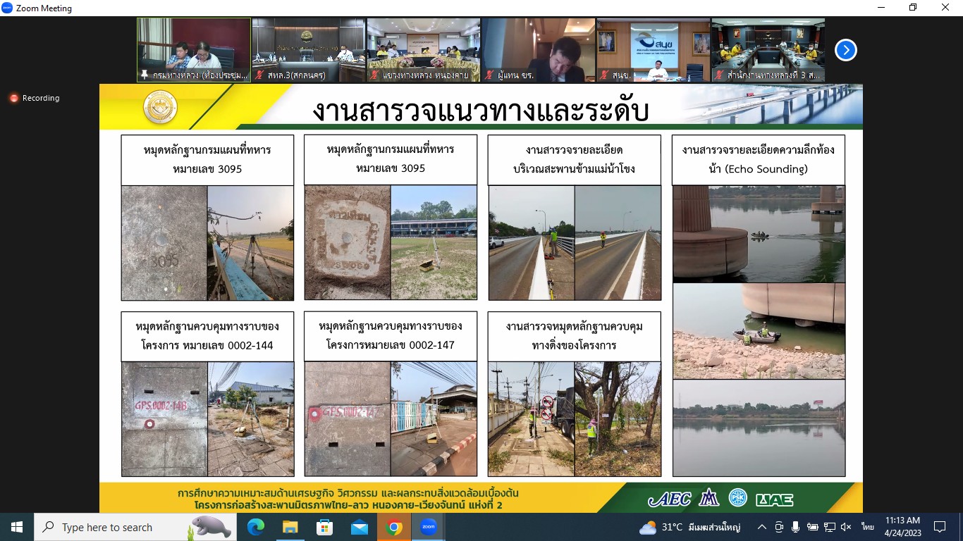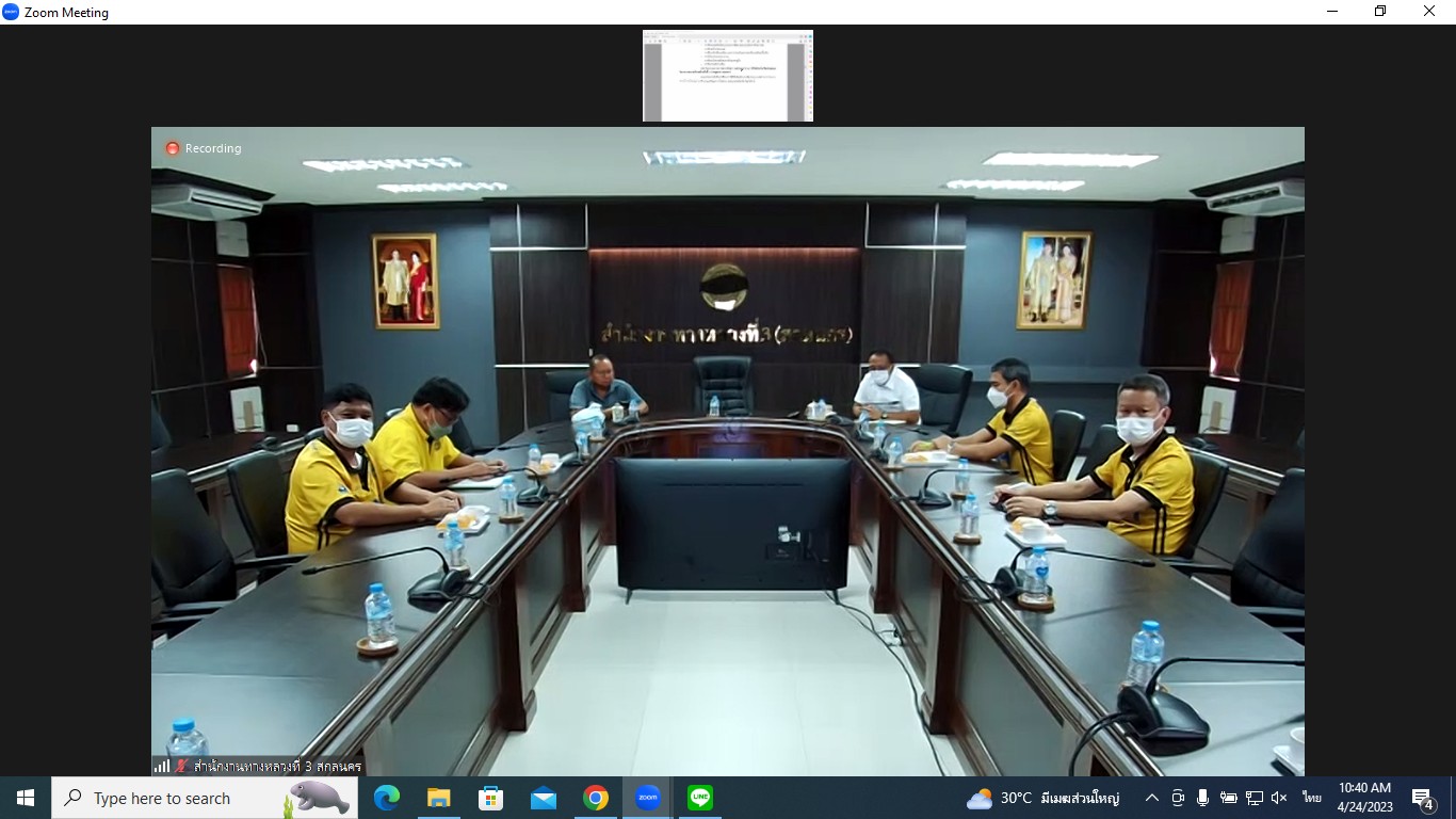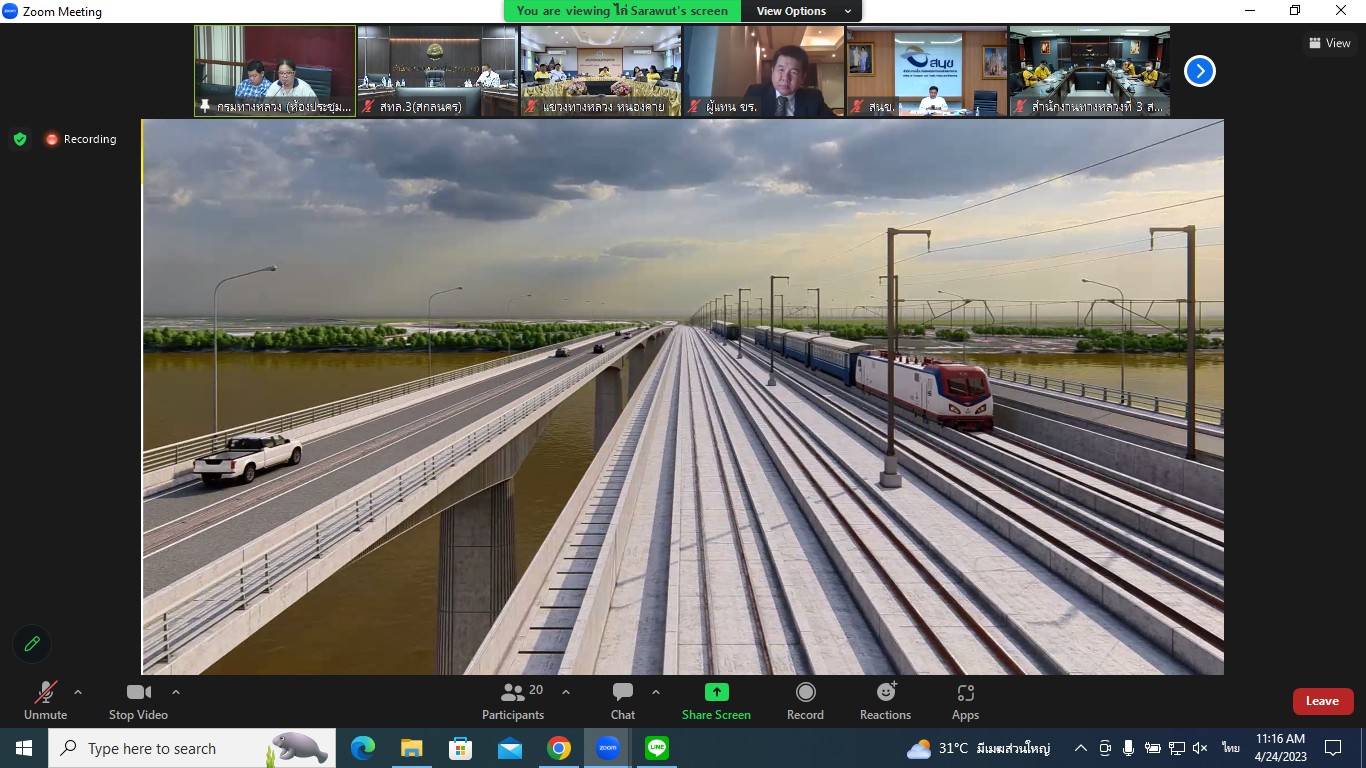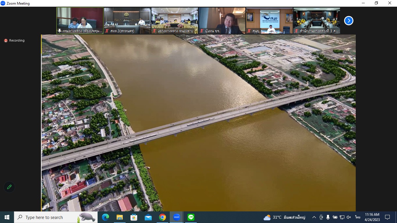 สำนักงานทางหลวงที่ 3(สกลนคร) นายวุฒิพงศ์ คำภูแสน รองผู้อำนวยการสำนักงานทางหลวงที่ 3 ตำแหน่งที่ 1 พร้อมด้วยนายประวัติ เสวตวงษ์ รองผู้อำนวยการสำนักงานทางหลวงที่ 3 ตำแหน่งที่ 2 นายชินนพัทธ์ มุลทาทอง ผู้อำนวยการส่วนแผนงาน นายพงษ์ศักดิ์ อาจลา ผู้อำนวยการส่วนสำรวจและออกแบบ นายกษิดิศ สินโน วิศวโยธาปฎิบัติการ และนายธนพนธ์ กิตติธรรม นายช่างโยธาชำนาญงาน ร่วมประชุมพิจารณารายงานความก้าวหน้าฉบับที่ 2 (Progress Report 2) การศึกษาความเหมาะสมด้านเศรษฐกิจ วิศวกรรม และผลกระทบสิ่งแวดล้อมเบื้องต้น โครงการก่อสร้างสะพานมิตรภาพไทย-ลาว(หนองคาย-เวียงจันทน์ แห่งที่ 2ผ่านระบบ Zoom Cloud Meeting ณ ห้องประชุมทวีพัฒน์ ตินะมาส ชั้น 3 อาคารหลังใหม่