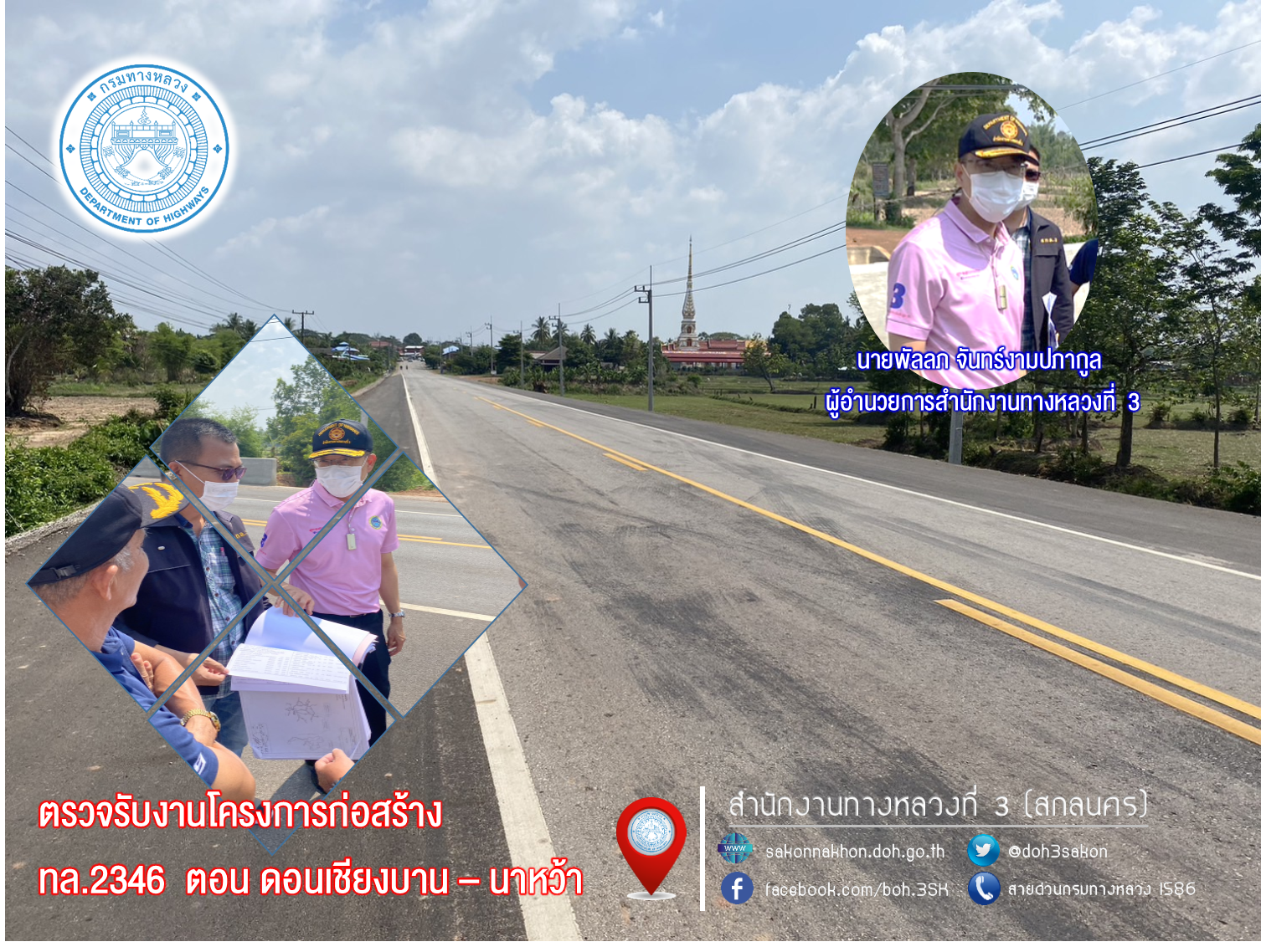 นายพัลลภ จันทร์งามปภากูล ผู้อำนวยการสำนักงานทางหลวงที่ 3 ประธานกรรมการตรวจรับพัสดุ พร้อมด้วยคณะกรรมการตรวจรับพัสดุ ลงพื้นที่ตรวจรับงานโครงการก่อสร้างทางหลวงหมายเลข 2346 ตอน ดอนเชียงบาน – นาหว้า ระหว่าง กม.19+000 –กม.23+600, กม.24+119 – กม.25+200 ปริมาณงาน 2 แห่งวงเงินงบประมาณ 39,423,000 บาท (งวดที่ 2 สุดท้าย)