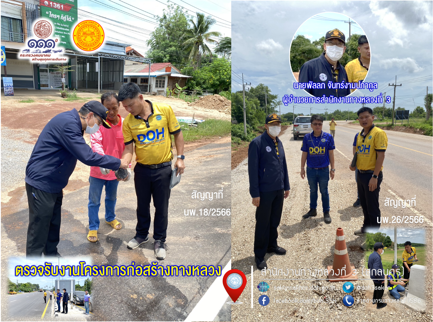 นายพัลลภ จันทร์งามปภากูล ผู้อำนวยการสำนักงานทางหลวงที่ 3 ประธานกรรมการตรวจรับพัสดุ พร้อมด้วยนายเดชา พรวนพิทักษ์ ผู้อำนวยการแขวงทางหลวงนครพนม และคณะกรรมการตรวจรับพัสดุ ลงพื้นที่ตรวจรับงานโครงการก่อสร้างงานจ้างเหมาทำการปรับปรุงจุดเสี่ยงและบริเวณอันตราย ทางหลวงหมายเลข 212 CS.0301 ตอน นาพระชัย – ท่าอุเทน ระหว่าง กม.284+405 - กม.284+975, กม.285+633 – กม.286+003 และ กม.286+440.5 – กม.286+910.5 ผลผลิต 1 แห่ง (ปริมาณงาน 1 แห่ง) วงเงินงบประมาณ 39,579,000 บาท (งวดที่ 1 สุดท้าย) ควบคุมการก่อสร้างโดยส่วนควบคุมงานก่อสร้างทาง สำนักงานทางหลวงที่ 3 (สกลนคร) มีบริษัท เค.อาร์.ซี เอ็นจิเนียริ่ง จำกัด เป็นผู้รับจ้าง