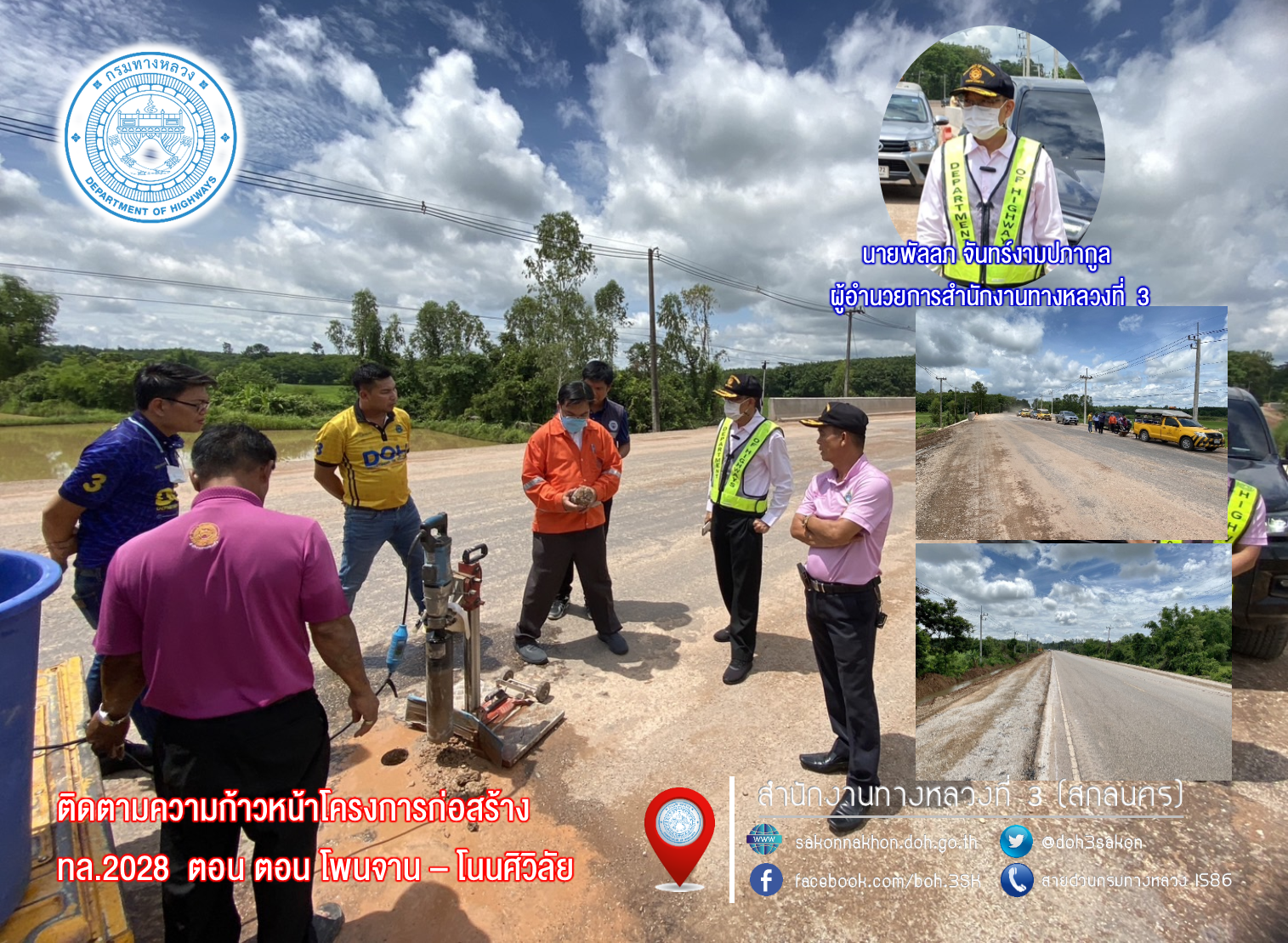 นายพัลลภ จันทร์งามปภากูล ผู้อำนวยการสำนักงานทางหลวงที่ 3 ประธานกรรมการตรวจรับพัสดุ พร้อมด้วยนายเดชา พรวนพิทักษ์ ผู้อำนวยการแขวงทางหลวงนครพนม กรรมการตรวจรับพัสดุ และคณะกรรมการตรวจรับพัสดุ ลงพื้นที่ติดตามความก้าวหน้าโครงการก่อสร้าง งานจ้างเหมาทำการกิจกรรมก่อสร้างเพิ่มไหล่ทาง ทางหลวงหมายเลข 2028 CS.0200 ตอน โพนจาน – โนนศิวิลัย ระหว่าง กม.21+500 – กม.26+600และ กม.33+350 – 34+100 (ปริมาณงาน 2 แห่ง) วงเงินงบประมาณ 78,556,000 บาท (ตรวจรับงวดที่ 3 ) ควบคุมการก่อสร้างโดยส่วนควบคุมงานก่อสร้างทาง สำนักงานทางหลวงที่ 3 (สกลนคร) ควบคุมการก่อสร้างโดยส่วนควบคุมงานก่อสร้างทาง สำนักงานทางหลวงที่ 3 (สกลนคร) มีบริษัท เค.อาร์.ซี เอ็นจิเนียริ่ง จำกัด เป็นผู้รับจ้าง