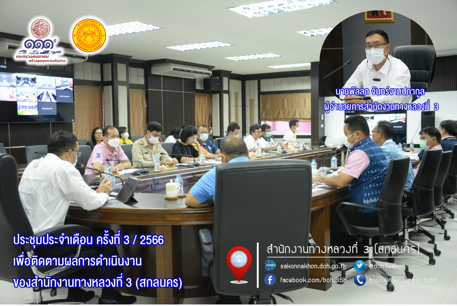 นายพัลลภ จันทร์งามปภากูล ผู้อำนวยการสำนักงานทางหลวงที่ 3 เป็นประธานประชุมประจำเดือนครั้งที่ 3/2566 เพื่อติดตามผลการดำเนินงานของสำนักงานทางหลวงที่ 3 (สกลนคร)