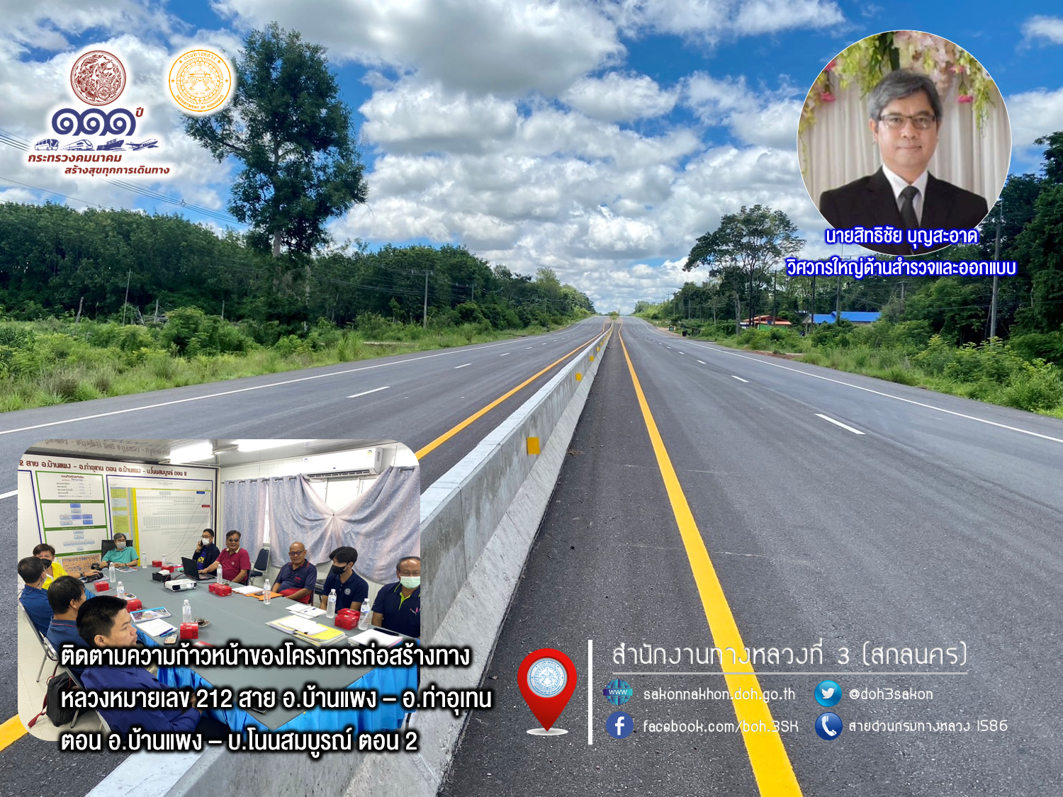 วันที่ 5 กรกฎาคม 2565 เวลา 11.00 น. นายสิทธิชัย บุญสะอาด วิศวกรใหญ่ด้านสำรวจและออกแบบ ประธานกรรมการตรวจรับพัสดุ พร้อมด้วยนายพัลลภ จันทร์งามปภากูล ผู้อำนวยการสำนักงานทางหลวงที่ 3 กรรมการตรวจรับพัสดุ และคณะกรรมการตรวจรับพัสดุ ลงพื้นที่ติดตามความก้าวหน้าของโครงการก่อสร้างทางหลวงหมายเลข 212 สาย อ.บ้านแพง – อ.ท่าอุเทน ตอน อ.บ้านแพง – บ.โนนสมบูรณ์ ตอน 2 ระหว่าง กม.237+000 - กม.255+000 ระยะทางรวม 12.675 กม. วงเงินงบประมาณ 610,504,000 บาท (ตรวจรับงานงวดที่ 10) เพื่อให้การดำเนินงานก่อสร้างทางหลวงแผ่นดินได้ตามแบบมาตรฐานของกรมทางหลวง กระทรวงคมนาคม ควบคุมการก่อสร้างโดยสำนักก่อสร้างทางที่ 2 มีบริษัท บัญชากิจ จำกัด เป็นผู้รับจ้าง พร้อมรับฟังบรรยายสรุปผลการดำเนินงานของโครงการฯ ณ ห้องประชุมสำนักงานชั่วคราวของโครงการ