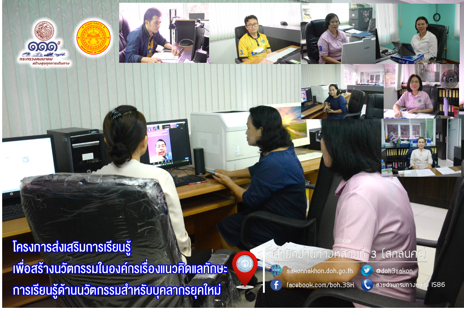วันที่ 4 กรกฎาคม 2566 เวลา 09.30 -16.00 น. นายอำนาจ สาไชยันต์ ผู้อำนวยการส่วนเทคโนโลยีสารสนเทศ นางพวงเพชร เบญจมาศ หัวหน้างานสารบรรณ นางรุ่งดาว ชมภูวิเศษ หัวหน้างานการงินและบัญชี นายผดุง ศรีโคตา วิศวกรโยธาชำนาญการ นางญาณวรรณ บุษดี นักจัดการงานทั่วไปชำนาญการ นางมุทิชา นนตะเสน เจ้าพนักงานธุรการชำนาญงาน และนางเพียงรวี ภู่ขำ นายช่างโยธาชำนาญงาน เข้าร่วมโครงการส่งเสริมการเรียนรู้เพื่อสร้างนวัตกรรมในองค์กรเรื่องแนวคิดแลทักษะการเรียนรู้ด้านนวัตกรรมสำหรับบุคลากรยุคใหม่ผ่านระบบออนไลน์ Zoom Cloud Meetings ณ สำนักงานทางหลวงที่ 3 (สกลนคร) จัดโดยกลุ่มส่งเสริมการเรียนรู้ในองค์กร กองฝึกอบรม