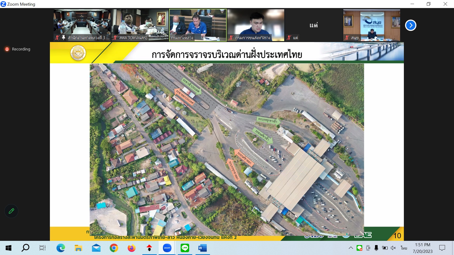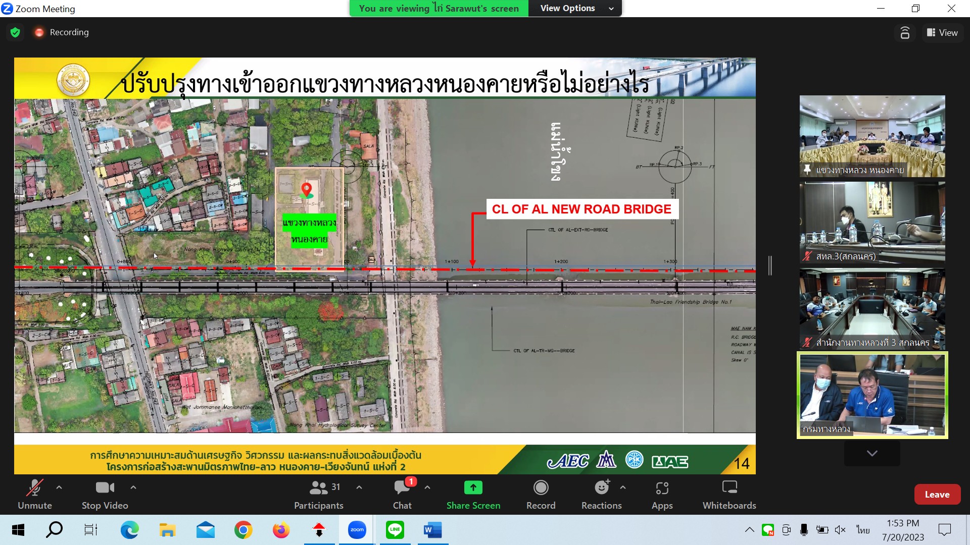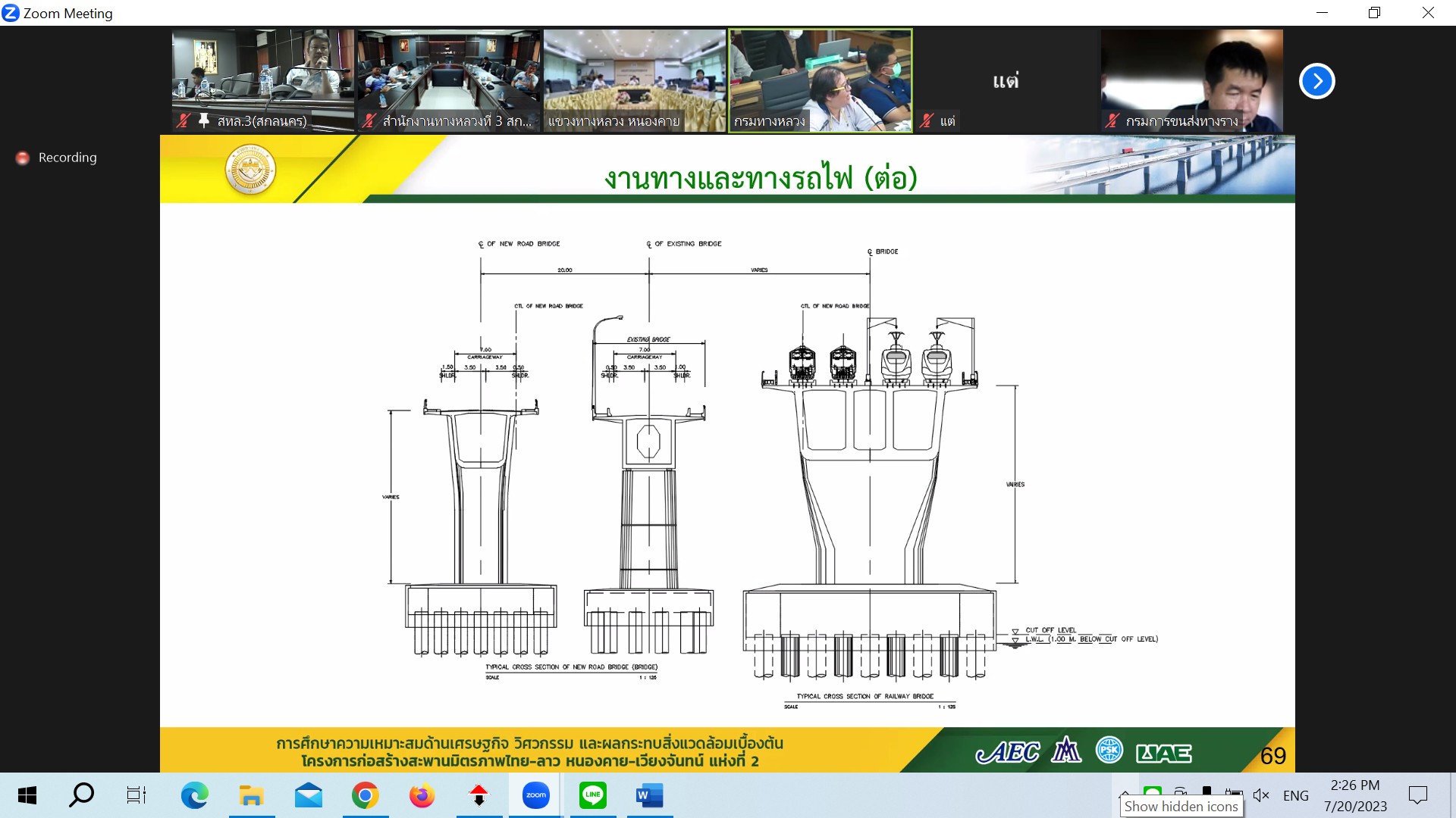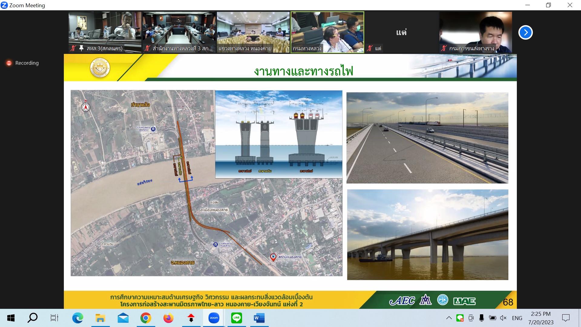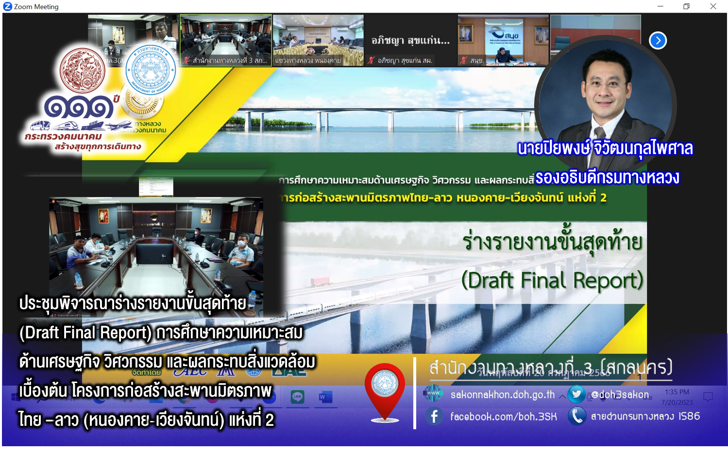 นายปิยพงษ์ จิวัฒนกุลไพศาล รองอธิบดีกรมทางหลวง เป็นประธาน ประชุมพิจารณาร่างรายงานขั้นสุดท้าย (Draft Final Report) การศึกษาความเหมาะสมด้านเศรษฐกิจ วิศวกรรม และผลกระทบสิ่งแวดล้อมเบื้องต้น โครงการก่อสร้างสะพานมิตรภาพไทย-ลาว(หนองคาย-เวียงจันทน์) แห่งที่ 2 ผ่านระบบ Zoom Cloud Meeting จากห้องประชุมสวัสดิ์วรวิถี ชั้น2 อาคารพหลโยธิน กรมทางหลวง