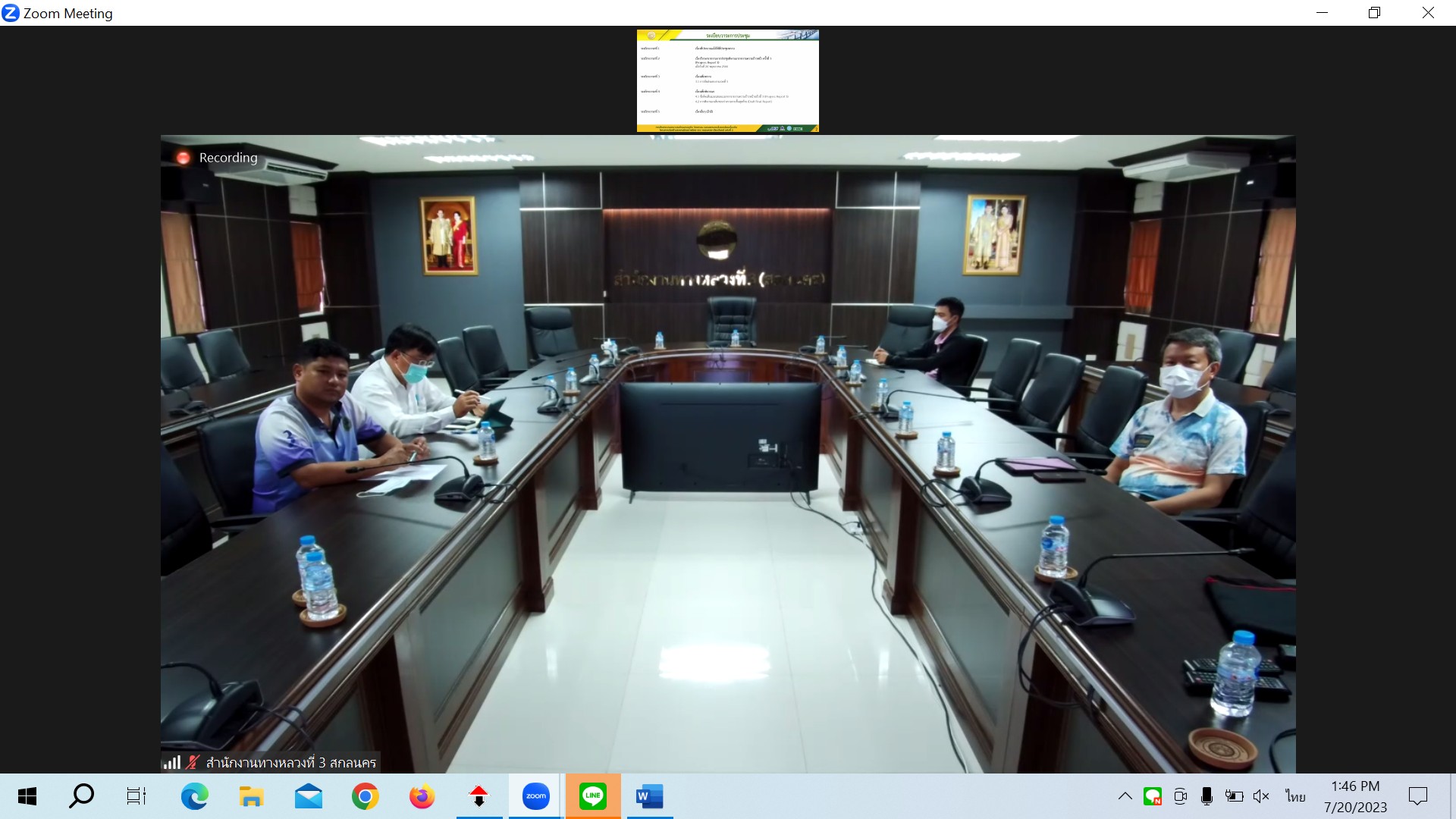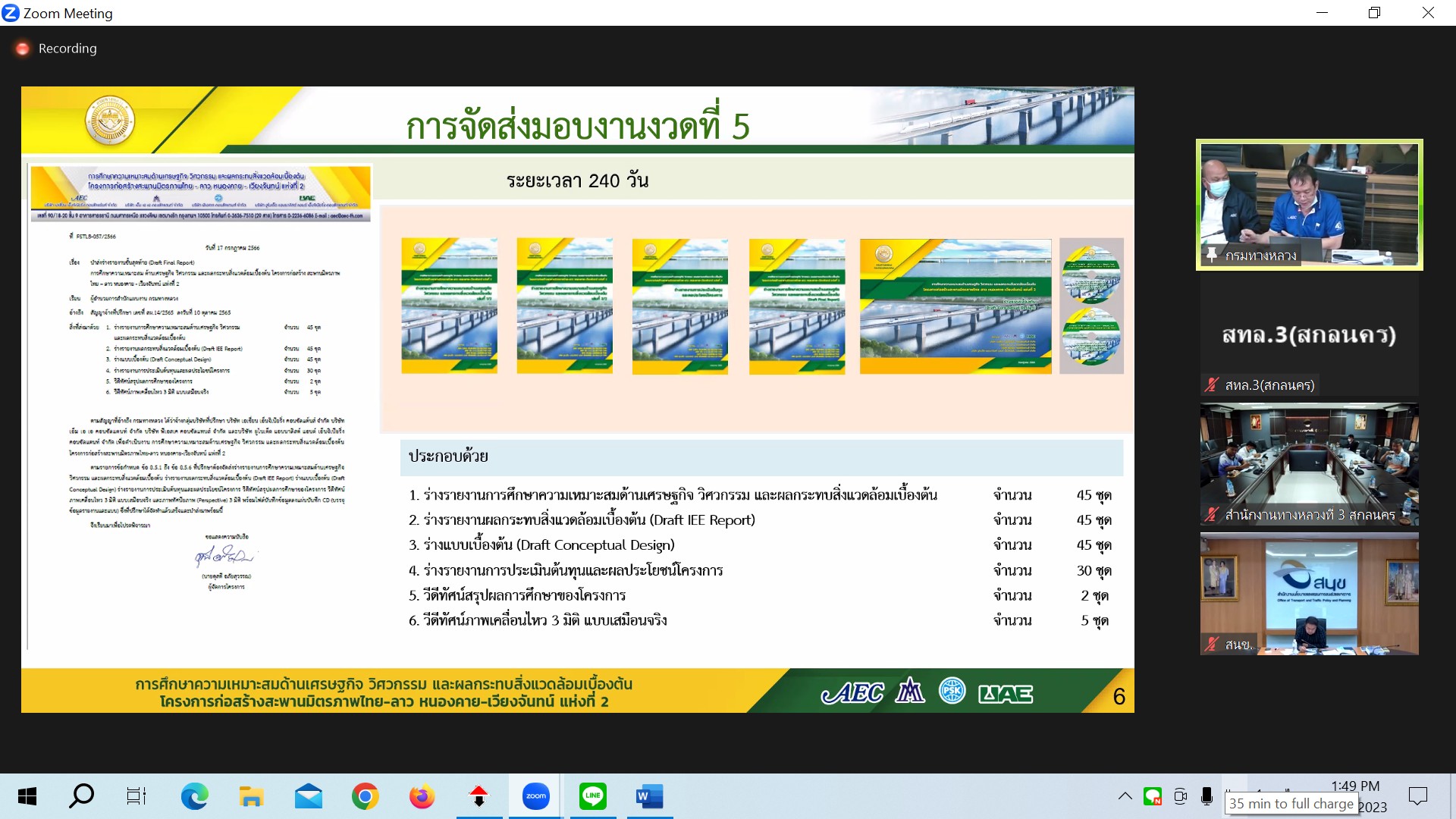 สำนักงานทางหลวงที่ 3(สกลนคร) นายพัลลภ จันทร์งามปภากูล ผู้อำนวยการสำนักงานทางหลวงที่ 3 มอบหมายให้นายพงษ์ศักดิ์ อาจลา ผู้อำนวยการส่วนสำรวจและออกแบบ นายชินนพัทธ์ มุลทาทอง ผู้อำนวยการส่วนแผนงาน นายกษิดิศ สินโน วิศวโยธาปฎิบัติการ และนายธนพนธ์ กิตติธรรม นายช่างโยธาชำนาญงาน ประชุมพิจารณาร่างรายงานขั้นสุดท้าย (Draft Final Report) การศึกษาความเหมาะสมด้านเศรษฐกิจ วิศวกรรม และผลกระทบสิ่งแวดล้อมเบื้องต้น โครงการก่อสร้างสะพานมิตรภาพไทย-ลาว(หนองคาย-เวียงจันทน์)แห่งที่ 2 ผ่านระบบ Zoom Cloud Meeting ณ ห้องประชุมทวีพัฒน์ ตินะมาส ชั้น 3 อาคารหลังใหม่