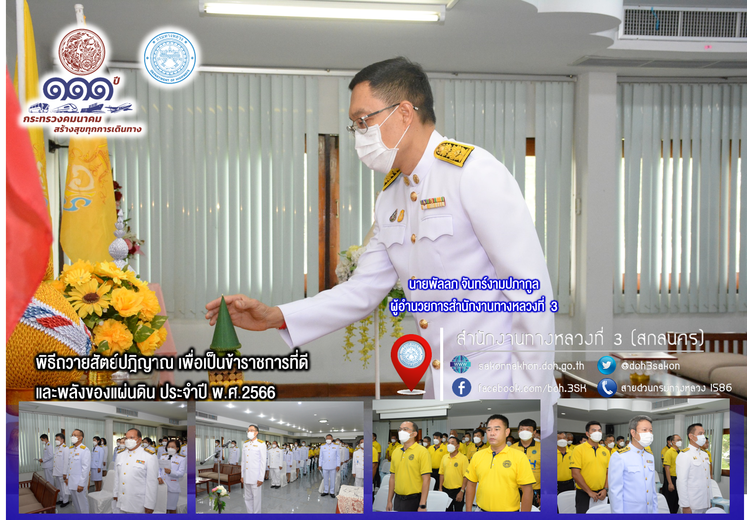 นายพัลลภ จันทร์งามปภากูล ผู้อำนวยการสำนักงานทางหลวงที่ 3 นำ คณะผู้บริหาร ผู้อำนวยการส่วน /ฝ่าย /งาน และเจ้าหน้าที่สำนักงานทางหลวงที่ 3(สกลนคร) ถวายสัตย์ปฏิญาณเพื่อเป็นข้าราชการที่ดีและพลังของแผ่นดิน ประจำปี 2566 ในวันที่ 27 กรกฎาคม 2566 ณ ห้องประชุมทวีพัฒน์ ตินะมาส อาคารหลังเก่า เพื่อให้ข้าราชการและเจ้าหน้าที่ ได้แสดงความมุ่งมั่นแน่วแน่ที่จะเป็นข้าราชการที่ดีและพลังของแผ่นดิน ซึ่งกิจกรรมนี้เป็นส่วนหนึ่งของกิจกรรมเฉลิมพระเกียรติพระบาทสมเด็จพระปรเมนทรรามาธิบดีศรีสินทรมหาวชิราลงกรณ พระวชิรเกล้าเจ้าอยู่หัวเนื่องในโอกาสมหามงคลเฉลิมพระชนมพรรษา 28 กรกฎาคม 2566