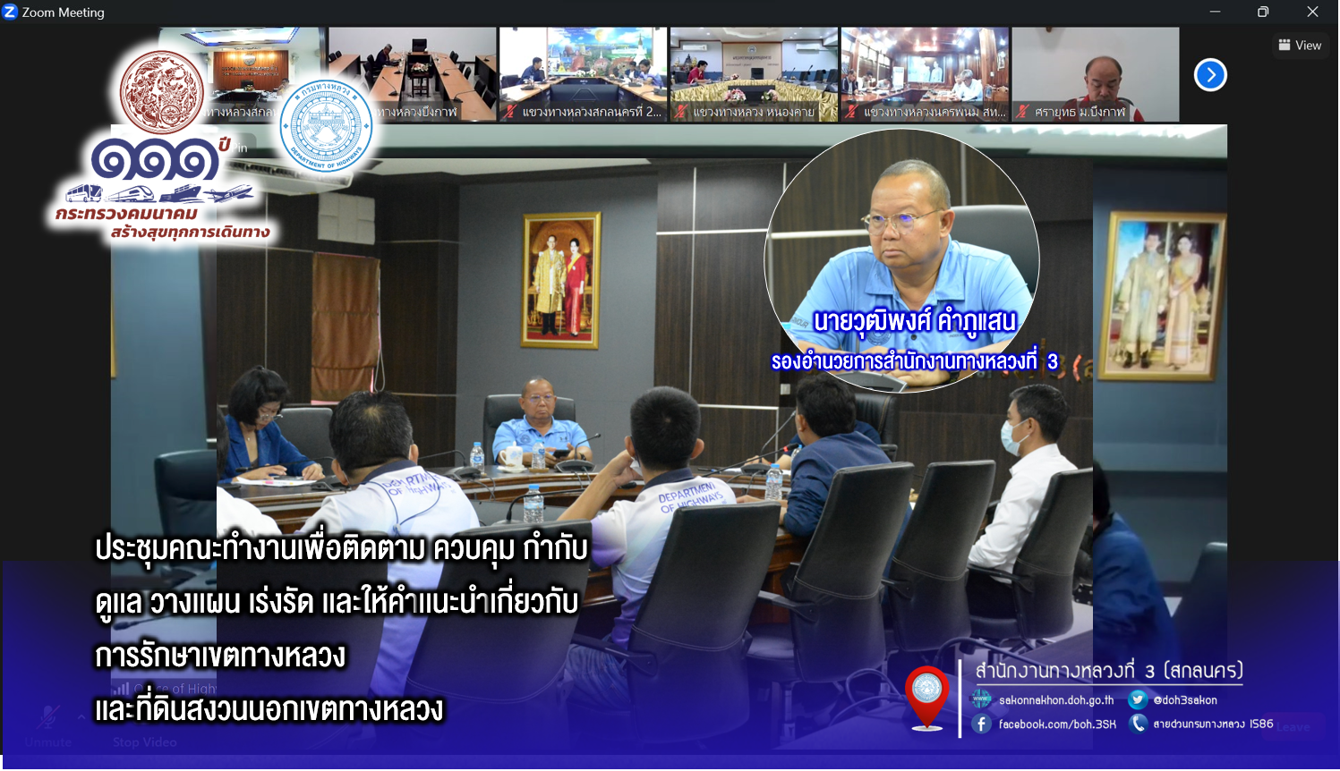 นายวุฒิพงศ์ คำภูแสน รองผู้อำนวยการสำนักงานทางหลวงที่ 3 ตำแหน่งที่ 1 เป็นประธาน ประชุมคณะทำงานเพื่อติดตาม ควบคุม กำกับ ดูเเล วางเเผน เร่งรัด เเละให้คำเเนะนำเกี่ยวกับ การรักษาเขตทางหลวงเเละที่ดินสงวนนอกเขตทางหลวง ในเขตควบคุมของสำนักงานทางหลวงที่ 3 (สกลนคร) การประชุมในครั้งนี้มีแขวงทางหลวงในสังกัด/หัวหน้าหมวดทางหลวงในสังกัด ร่วมประชุมผ่านระบบ Zoom Cloud Meeting ของสำนักงานทางหลวงที่ 3 (สกลนคร)