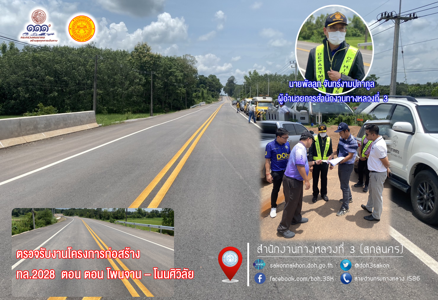 นายพัลลภ จันทร์งามปภากูล ผู้อำนวยการสำนักงานทางหลวงที่ 3 ประธานกรรมการตรวจรับพัสดุ พร้อมด้วยนายเดชา พรวนพิทักษ์ ผู้อำนวยการแขวงทางหลวงนครพนม กรรมการตรวจรับพัสดุ และคณะกรรมการตรวจรับพัสดุ ลงพื้นที่ตรวจรับงานโครงการก่อสร้าง งานจ้างเหมาทำการกิจกรรมก่อสร้างเพิ่มไหล่ทาง ทางหลวงหมายเลข 2028 CS.0200 ตอน โพนจาน – โนนศิวิลัย ระหว่าง กม.21+500 – กม.26+600 และ กม.33+350 – 34+100 (ปริมาณงาน 2 แห่ง) วงเงินงบประมาณ 78,556,000 บาท เพื่อให้การดำเนินงานก่อสร้างทางหลวงแผ่นดินได้ตามแบบมาตรฐานของกรมทางหลวง กระทรวงคมนาคม ควบคุมการก่อสร้างโดยส่วนควบคุมงานก่อสร้างทาง สำนักงานทางหลวงที่ 3 (สกลนคร) ควบคุมการก่อสร้างโดยส่วนควบคุมงานก่อสร้างทาง สำนักงานทางหลวงที่ 3 (สกลนคร) มีบริษัท ห้างหุ้นส่วนจำกัด บัวขาวเฟอร์นิเจอร์เป็น ผู้รับจ้าง