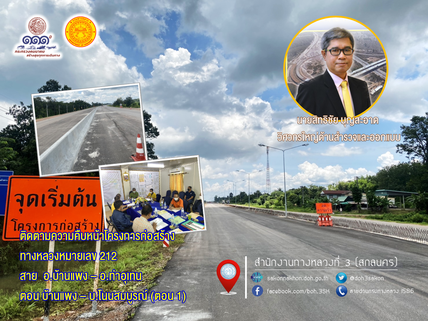 นายสิทธิชัย บุญสะอาด วิศวกรใหญ่ด้านสำรวจและออกแบบ ประธานกรรมการตรวจรับพัสดุ พร้อมด้วยนายพัลลภ จันทร์งามปภากูล ผู้อำนวยการสำนักงานทางหลวงที่ 3 กรรมการตรวจรับพัสดุ และคณะกรรมการตรวจรับพัสดุ ลงพื้นที่ติดตามความคืบหน้าของโครงการก่อสร้างทางหลวงหมายเลข 212 สาย อ.บ้านแพง – อ.ท่าอุเทน ตอน บ้านแพง – บ.โนนสมบูรณ์ (ตอน1) ระหว่าง กม.222+743 - กม.237+000 ระยะทางรวม 14.257 กม. วงเงินงบประมาณ 669,440,320 บาท (ตรวจรับงานงวดที่ 9) เพื่อให้การดำเนินงานก่อสร้างทางหลวงแผ่นดินได้ตามแบบมาตรฐานของกรมทางหลวง กระทรวงคมนาคม ควบคุมการก่อสร้างโดยสำนักก่อสร้างทางที่ 2 มีห้างหุ้นส่วน กิจรุ่งเรืองก่อสร้าง เป็นผู้รับจ้าง พร้อมรับฟังบรรยายสรุปผลการดำเนินงานของโครงการฯ ณ ห้องประชุมสำนักงานชั่วคราวของโครงการฯ