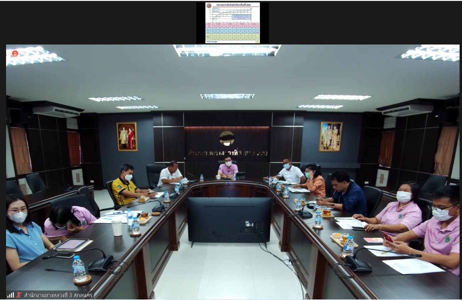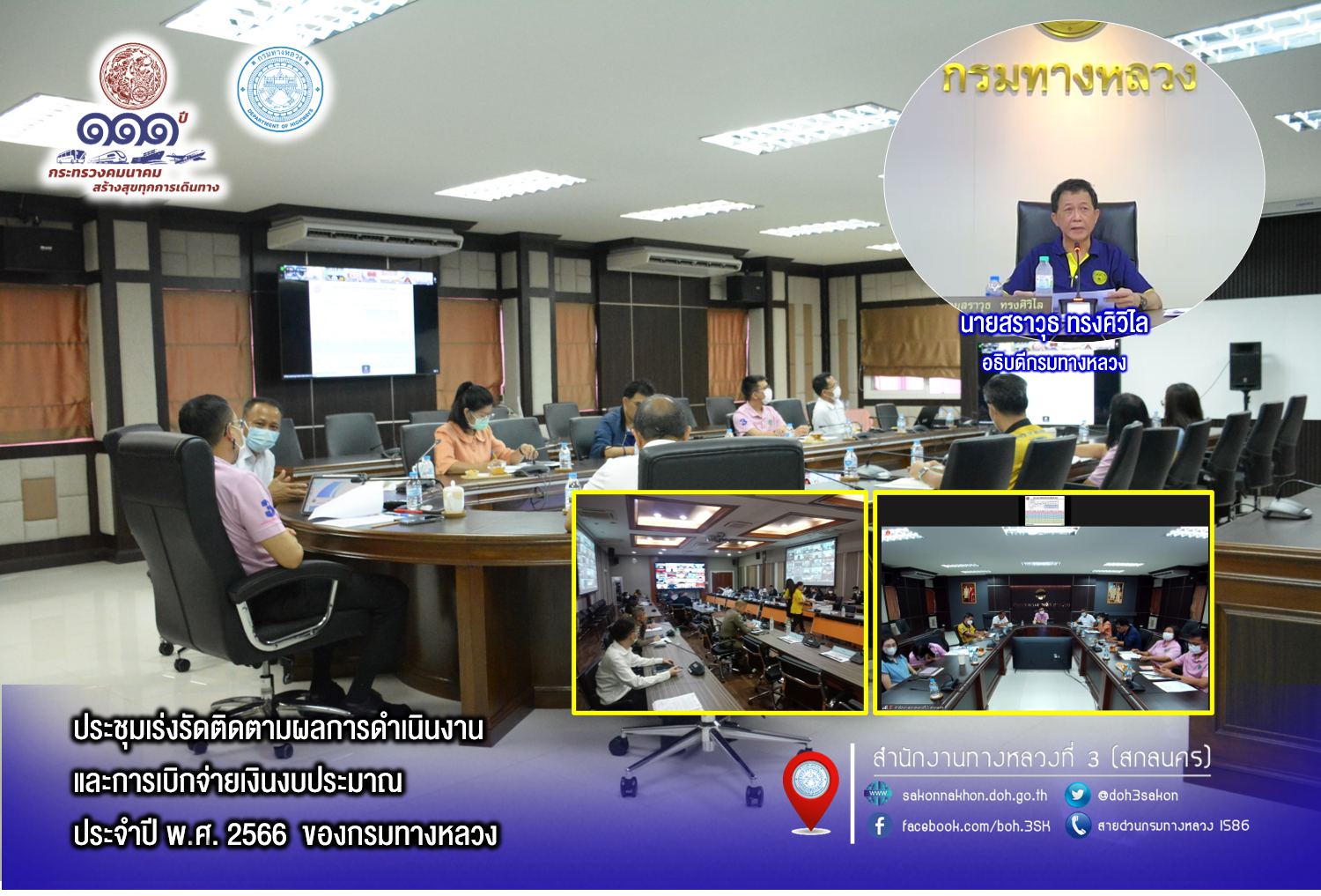 สำนักงานทางหลวงที่ 3 (สกลนคร) นายพัลลภ จันทร์งามปภากูล ผู้อำนวยการสำนักงานทางหลวงที่ 3พร้อมด้วย นายวุฒิพงศ์ คำภูแสน รองผู้อำนวยการสำนักงานทางหลวงที่ 3 ตำแหน่งที่ 1 นายประวัติ เสวตวงษ์ รองผู้อำนวยการสำนักงานทางหลวงที่ 3ตำแหน่งที่ 2 นายชินนพัทธ์ มุลทาทอง ผู้อำนวยการส่วนแผนงาน นายอำนาจ สาไชยันต์ ผู้อำนวยการส่วนเทคโนโลยีสารสนเทศ นางรุ่งดาว ชมภูวิเศษ หัวหน้างานการเงินและบัญชี นายธนากรณ์ ติยะบุตร วิศวกรโยธาปฏิบัติการ และเจ้าหน้าที่ที่เกี่ยวข้อง ร่วมประชุมเร่งรัดติดตามผลการดำเนินงานและการเบิกจ่ายเงินงบประมาณประจำปี พ.ศ.2566 ผ่านระบบ Zoom Cloud Meeting ณ ห้องประชุมทวีพัฒน์ ตินะมาส อาคารหลังใหม่ ในการประชุมครั้งนี้มีหน่วยงานสังกัดกรมทางหลวง ทั้ง 18 สำนักงานทางหลวง เข้าร่วมประชุมผ่านระบบ Zoom Cloud Meeting