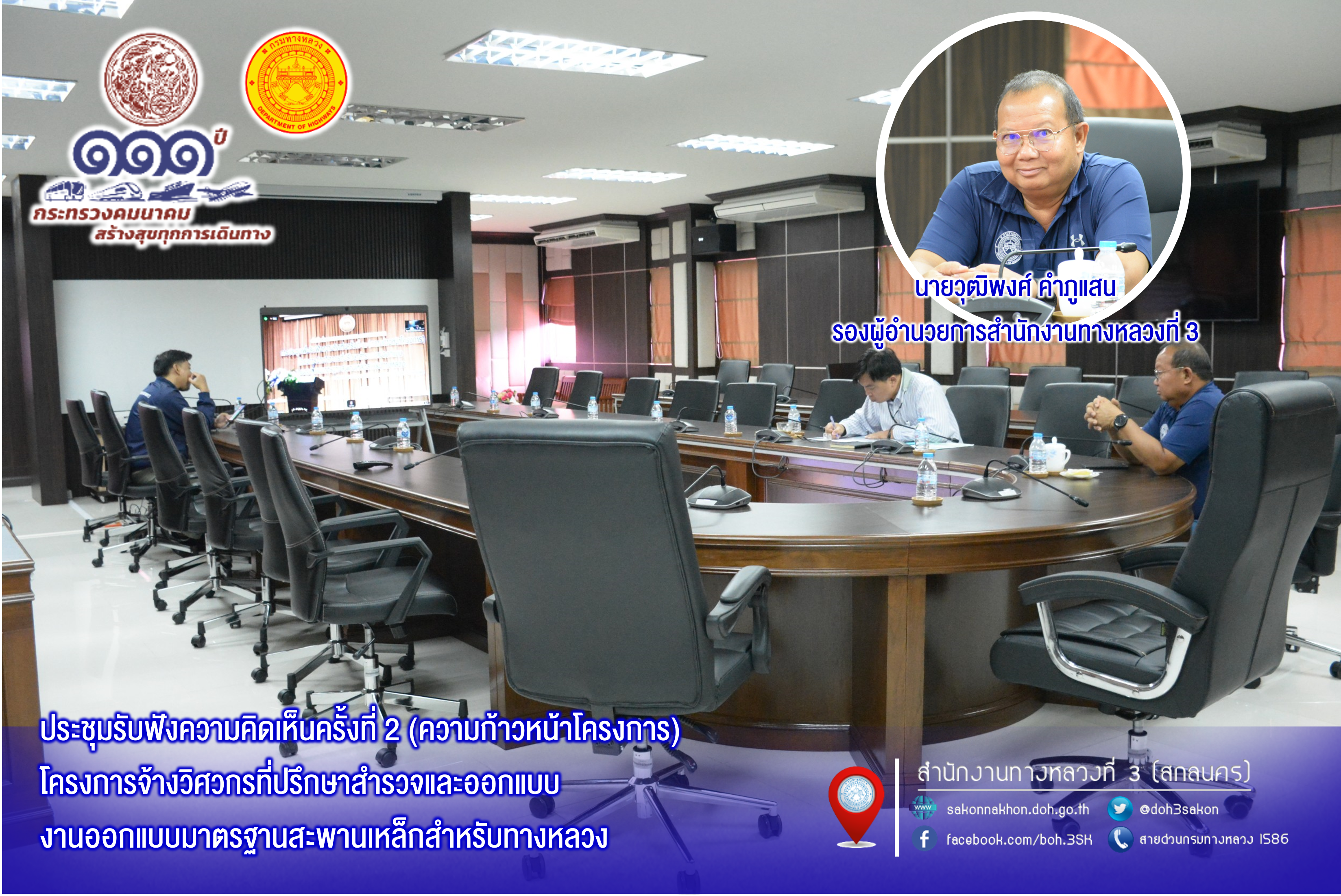นายวุฒิพงศ์ คำภูแสน รองผู้อำนวยการสำนักงานทางหลวงที่ 3 ตำแหน่งที่ 1 พร้อมด้วยนายพงษ์ศักดิ์ อาจลา ผู้อำนวยการส่วนสำรวจและออกแบบ เข้าร่วมประชุมรับฟังความคิดเห็นครั้งที่ 2 (ความก้าวหน้าโครงการ) โครงการจ้างวิศวกรที่ปรึกษาสำรวจและออกแบบ งานออกแบบมาตรฐานสะพานเหล็กสำหรับทางหลวงผ่านระบบออนไลน์ Zoom Meetings ณ ห้องประชุมทวีพัฒน์ ตินะมาส