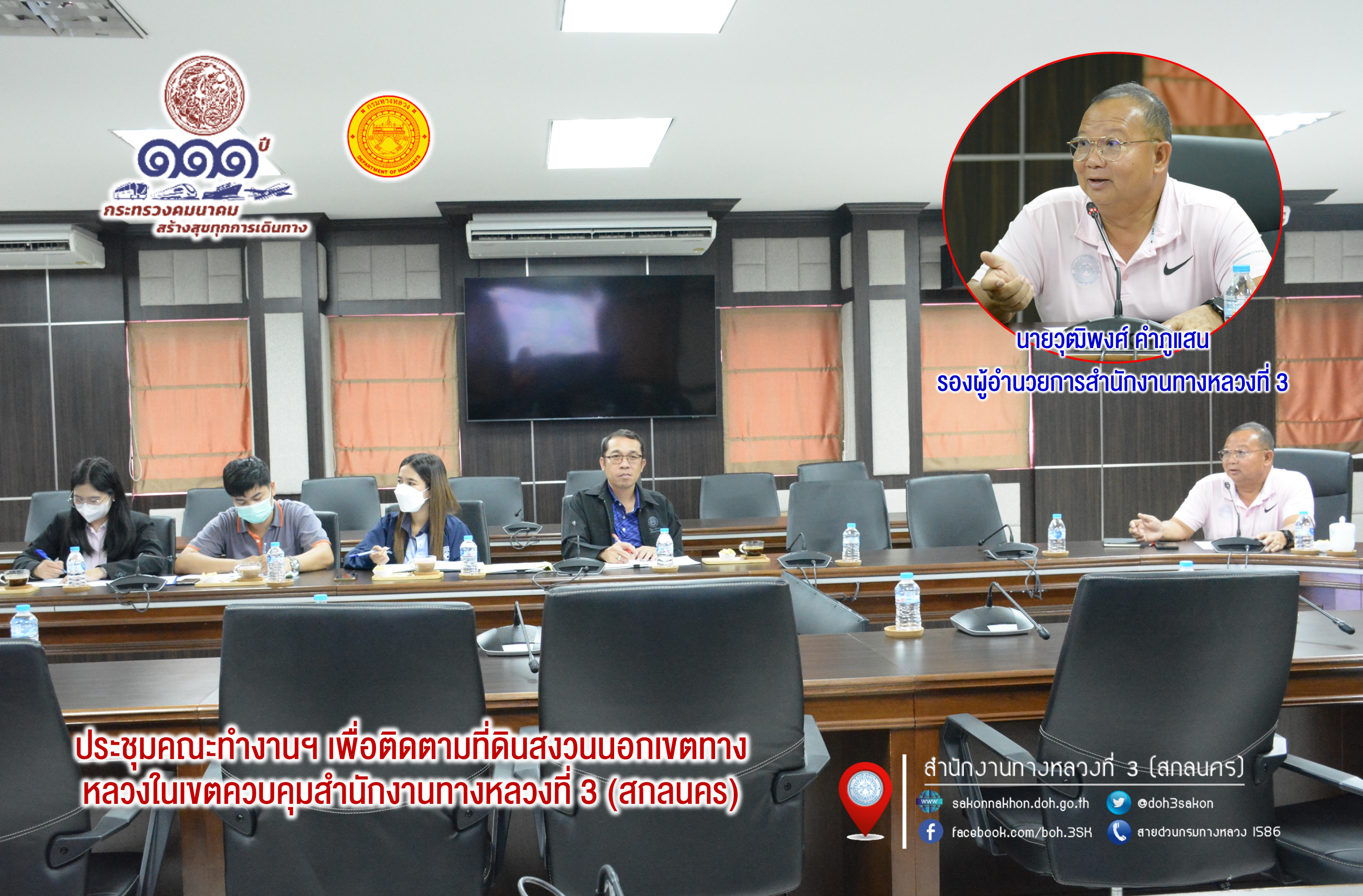 วันที่ 21 กันยายน 2566 เวลา 10.00 - 12.00 น.นายวุฒิพงศ์ คำภูแสน รองผู้อำนวยการสำนักงานทางหลวงที่ 3 ตำแหน่งที่ 1 พร้อมด้วย นายวีรวัฒน์ บุ่งนาแซง นิติกรปฏิบัติการ และ เจ้าหน้าที่ที่เกี่ยวข้อง ประชุมคณะทำงานฯ เพื่อติดตามควบคุม กำกับ ดูแล วางแผน เร่งรัดและให้คำแนะนำเกี่ยวกับการรักษาเขตทางหลวงและที่ดินสงวนนอกเขตทางหลวงในเขตควบคุมสำนักงานทางหลวงที่ 3 (สกลนคร) ผ่านระบบออนไลน์ Zoom Meeting ณ ห้องประชุม ทวีพัฒน์ ตินะมาส ชั้น 3 อาคารหลังใหม่ โดยมีคณะทำงานฯ ทั้ง 6 แขวงฯ ในสังกัดสำนักงานทางหลวงที่ 3 เข้าร่วมประชุม