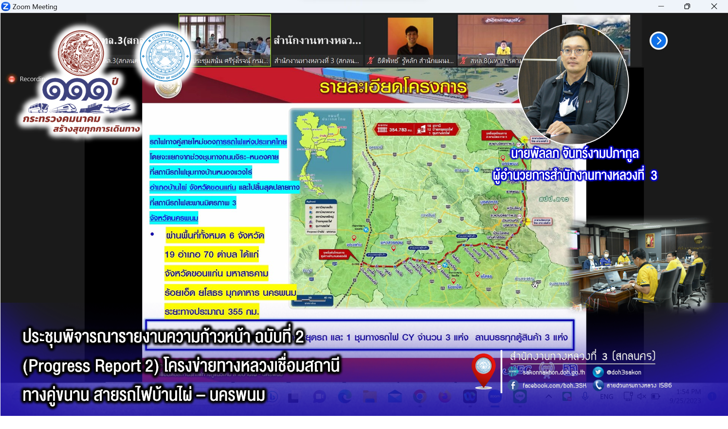 พร้อมด้วย นายพงษ์ศักดิ์ อาจลา ผู้อำนวยการส่วนสำรวจและออกแบบ นายวุฒินันท์ ทัศคร วิศวกรโยธาชำนาญการ นายธนากรณ์ ติยะบุตร วิศวกรโยธาปฏิบัติการ นายธนพนธ์ กิตติธรรม นายช่างโยธาชำนาญงาน และ นายจรัล เสนาคำ นายช่างโยธาชำนาญงาน เข้าร่วมประชุมพิจารณารายงานความก้าวหน้า ฉบับที่ 2 (Progress Report 2) การศึกษาความเหมาะสมเบื้องต้น การพัฒนาระบบโครงข่ายทางหลวงเชื่อมต่อสถานีรถไฟทางคู่แนวใหม่ สายบ้านไผ่ - นครพนม ผ่านระบบออนไลน์ Zoom Cloud Meeting ณ ห้องประชุมทวีพัฒน์ ตินะมาส ชั้น 3 อาคารหลังใหม่ จัดโดย สำนักแผนงาน กลุ่มงานวางแผน กรมทางหลวง