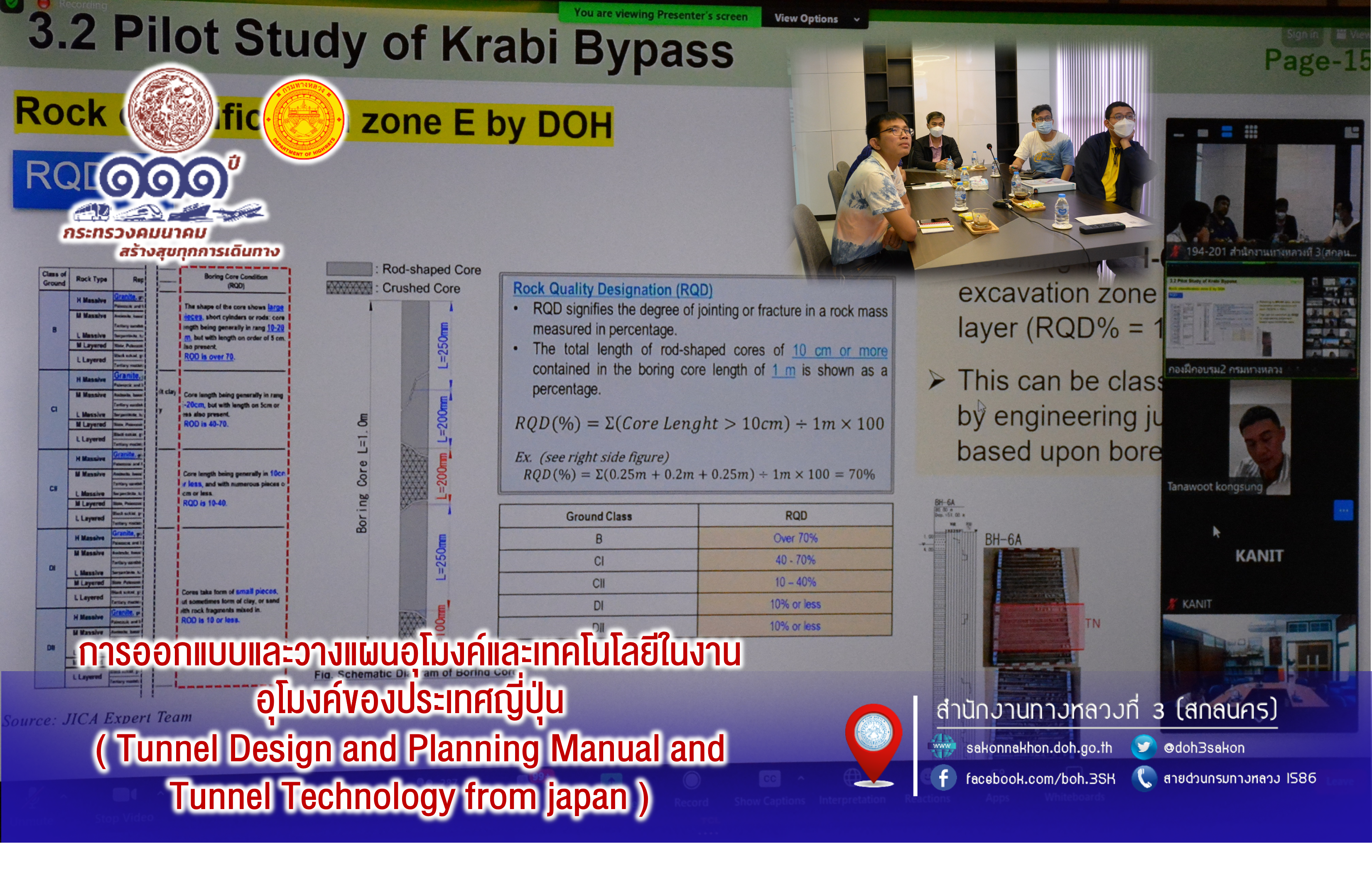 นายวุฒินันท์ ทัศคร วิศวกรโยธาชำนาญการ นายผดุง ศรีโคตา วิศวกรโยธาชำนาญการ นายกษิดิศ สินโน วิศวกรโยธาปฏิบัติการ และนายธนากรณ์ ติยะบุตร วิศวกรโยธาปฏิบัติการ เข้าร่วมรับฟังสัมมนาทางวิชาการครั้งที่ 3คู่มือการออกแบบและวางแผนอุโมงค์และเทคโนโลยีในงานอุโมงค์ของประเทศญี่ปุ่น ( Tunnel Design and Planning Manual and Tunnel Technology from japan )ภายใต้โครงการพัฒนาสมรรถนะการบริหารงานโครงการอุโมงค์ในประเทศไทยผ่านระบบออนไลน์ Zoom Video Conference ณ ห้องประชุมชั้น 2 อาคารหลังใหม่ จัดโดยกองฝึกอบรม กรมทางหลวง