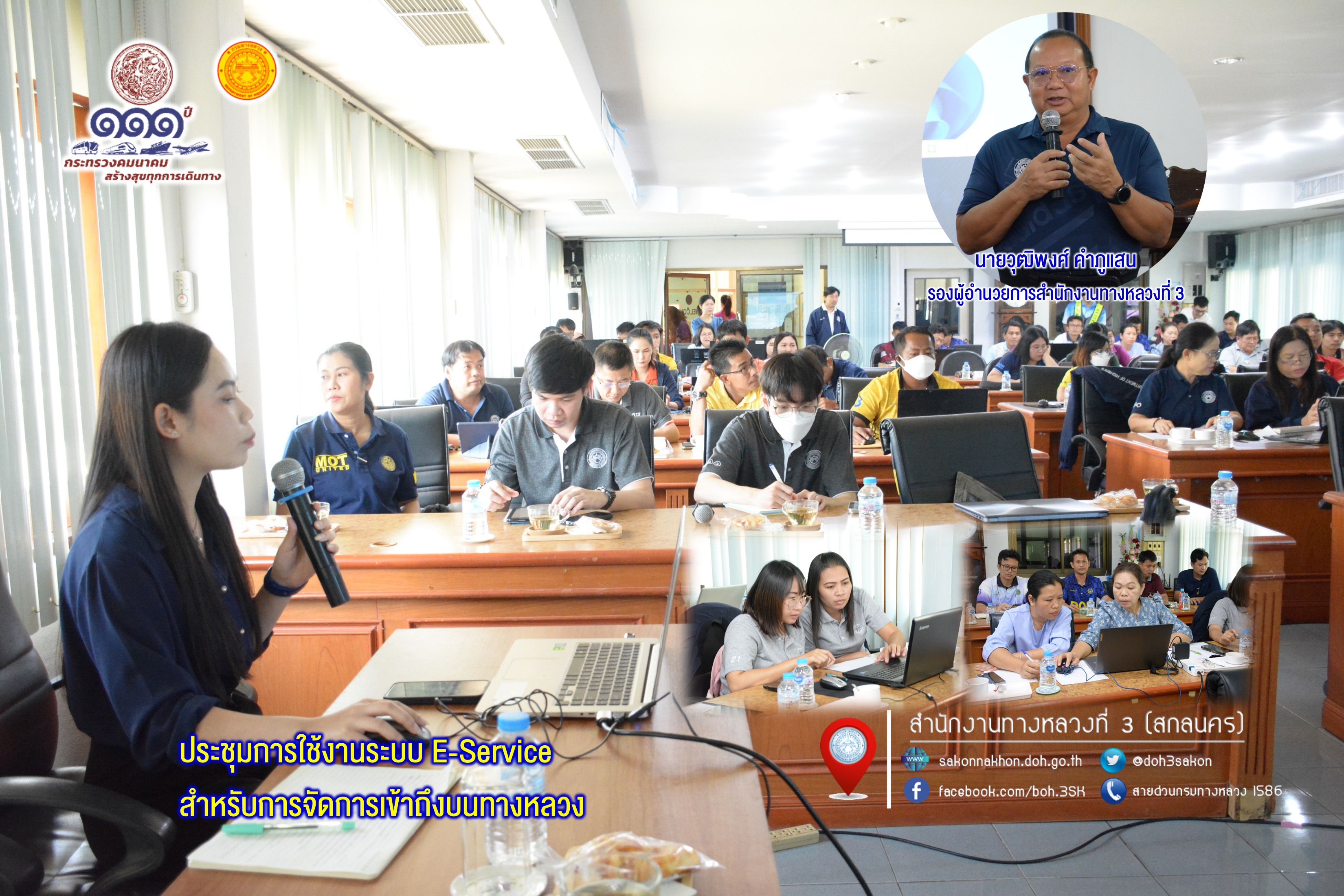 นายวุฒิพงศ์ คำภูแสน รองผู้อำนวยการสำนักงานทางหลวงที่ 3 ตำแหน่งที่ 1เป็นประธานกล่าวเปิดประชุมการใช้งานระบบ E-Service สำหรับการจัดการเข้าถึงบนทางหลวง ในพื้นที่ควบคุมของสำนักงานทางหลวงที่ 3 (สกลนคร) ในการอบรมครั้งนีี้มี นางนภาพิศ สุวรรณศรี ผู้อำนวยการฝ่ายบริหารงานทั่วไป นายอำนาจ สาไชยันต์ ผู้อำนวยการส่วนเทคโนโลยีสารสนเทศ และเจ้าหน้าที่ในสังกัดแขวงทางหลวง หมวดทางหลวงเข้าร่วม โดยมีเจ้าหน้าที่สำนักความปลอดภัย เป็นวิทยากร ณ ห้องประชุมทวีพัฒน์ ตินะมาส ชั้น 1 (อาคารหลังเก่า)