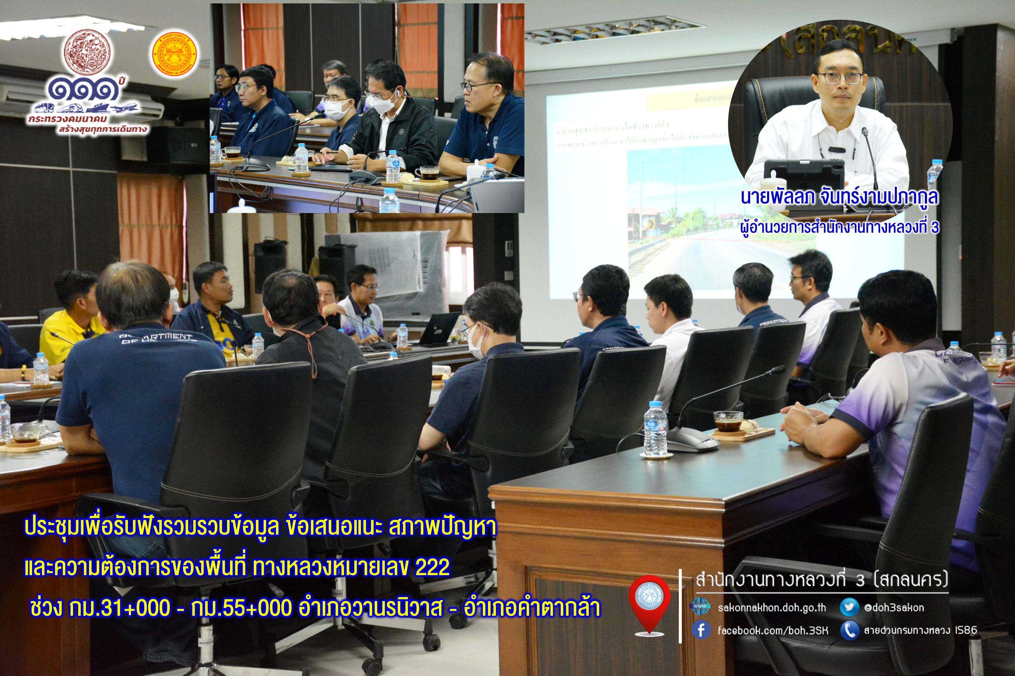 นายพัลลภ จันทร์งามปภากูล ผู้อำนวยการสำนักงานทางหลวงที่ 3 เป็นประธานประชุมเพื่อรับฟังรวมรวบข้อมูล ข้อเสนอแนะ สภาพปัญหา และความต้องการของพื้นที่ ทางหลวงหมายเลข 222 ช่วง กม.31+000 - กม.55+000 อำเภอวานรนิวาส - อำเภอคำตากล้า
