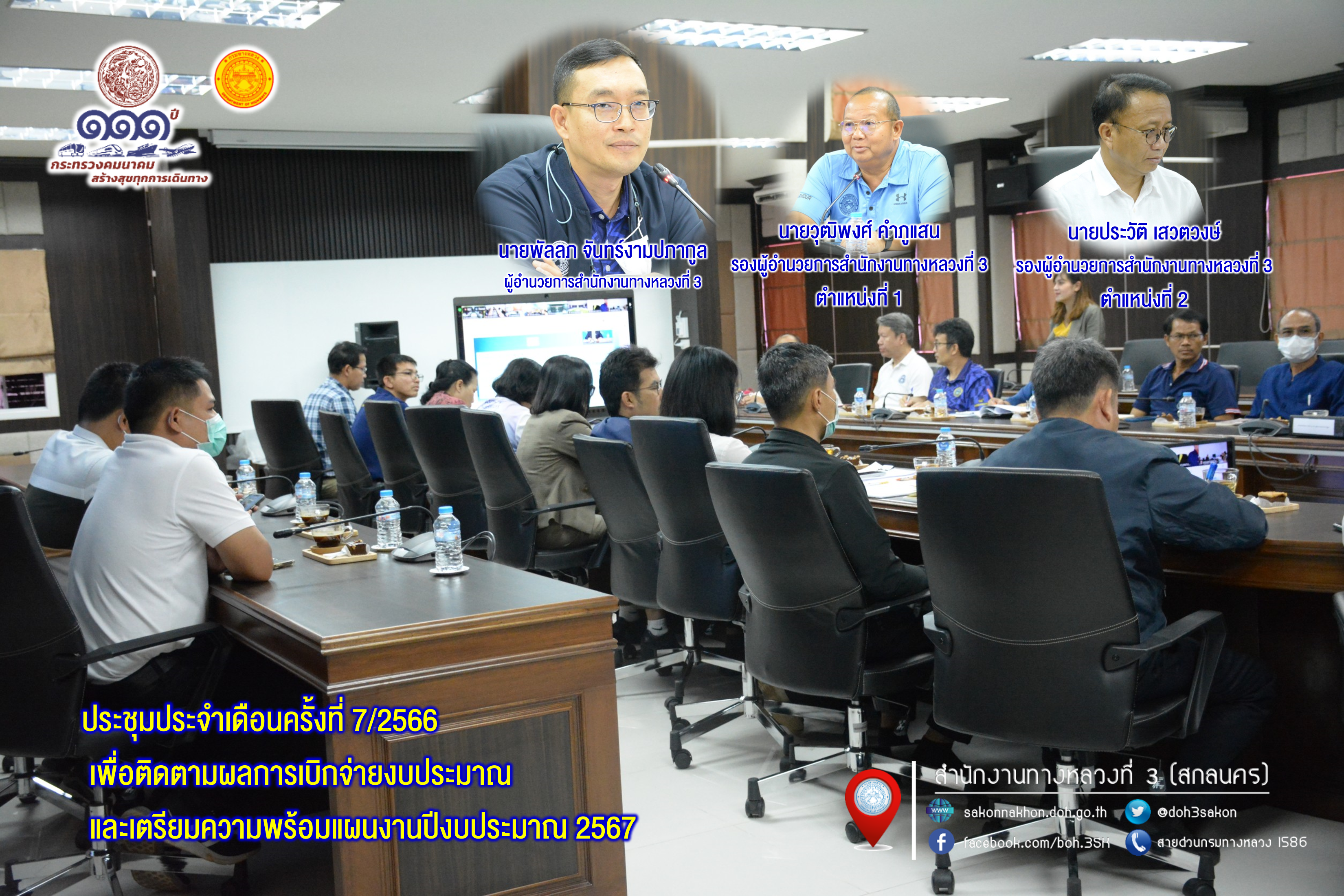 เวลา 09.30 - 12.00 น. นายวุฒิพงศ์ คำภูแสน รองผู้อำนวยการสำนักงานทางหลวงที่ 3 ตำแหน่งที่ 1 พร้อมด้วยนายประวัติ เสวตวงษ์ รองผู้อำนวยการสำนักงานทางหลวงที่ 3 ตำแหน่ง ที่ 2 ผู้อำนวยการส่วน/ฝ่าย และเจ้าหน้าที่ที่เกี่ยวข้อง ประชุมประจำเดือนครั้งที่ 7/2566 เพื่อติดตามผลการเบิกจ่ายงบประมาณ และเตรียมความพร้อมแผนงานปีงบประมาณ 2567 ณ ห้องประชุมทวีพัฒน์ ตินะมาส ชั้น 3 อาคารหลังใหม่ โดยมีแขวงทางหลวงในสังกัด เข้าประชุมออนไลน์ผ่านทาง ZOOM Meeting
