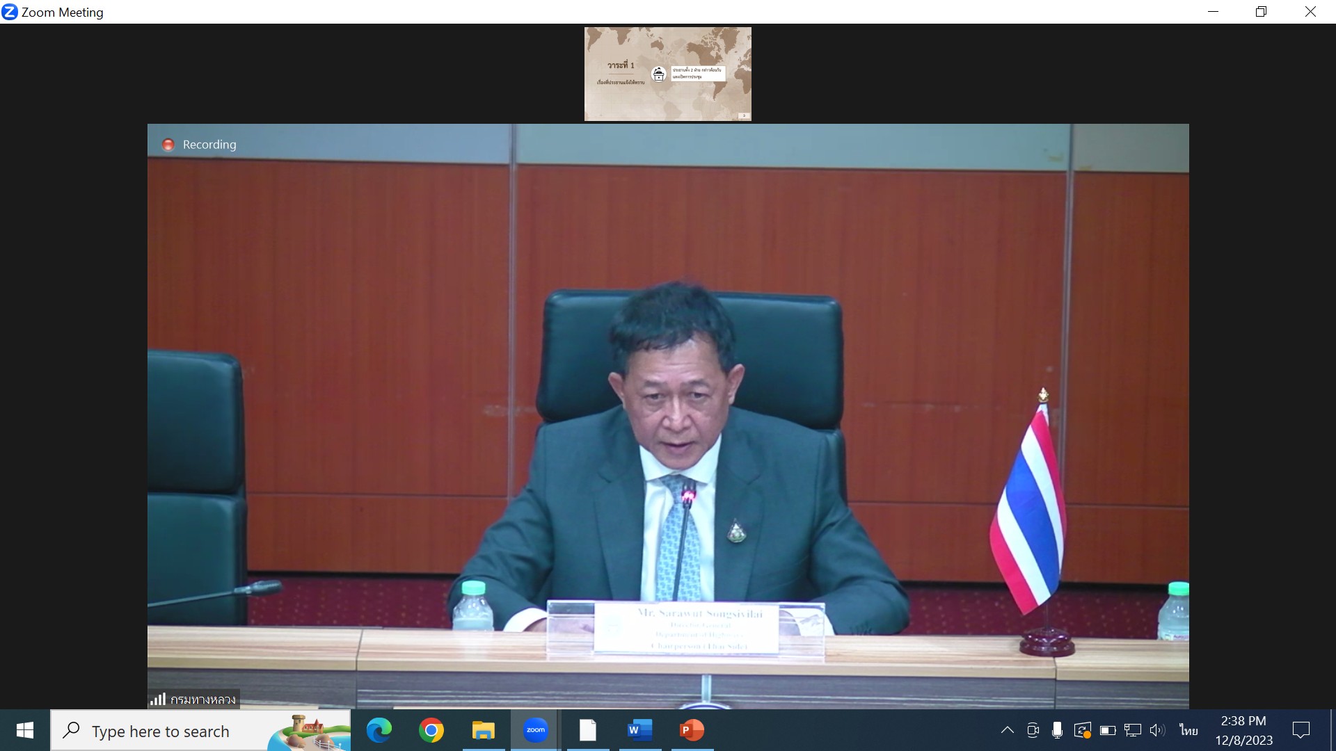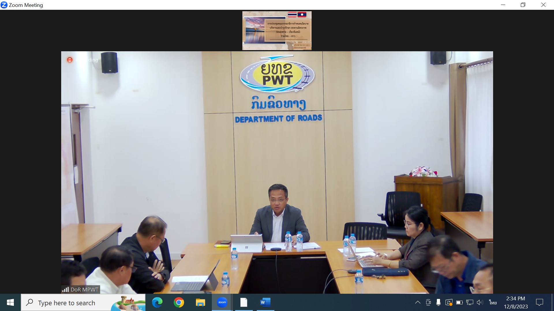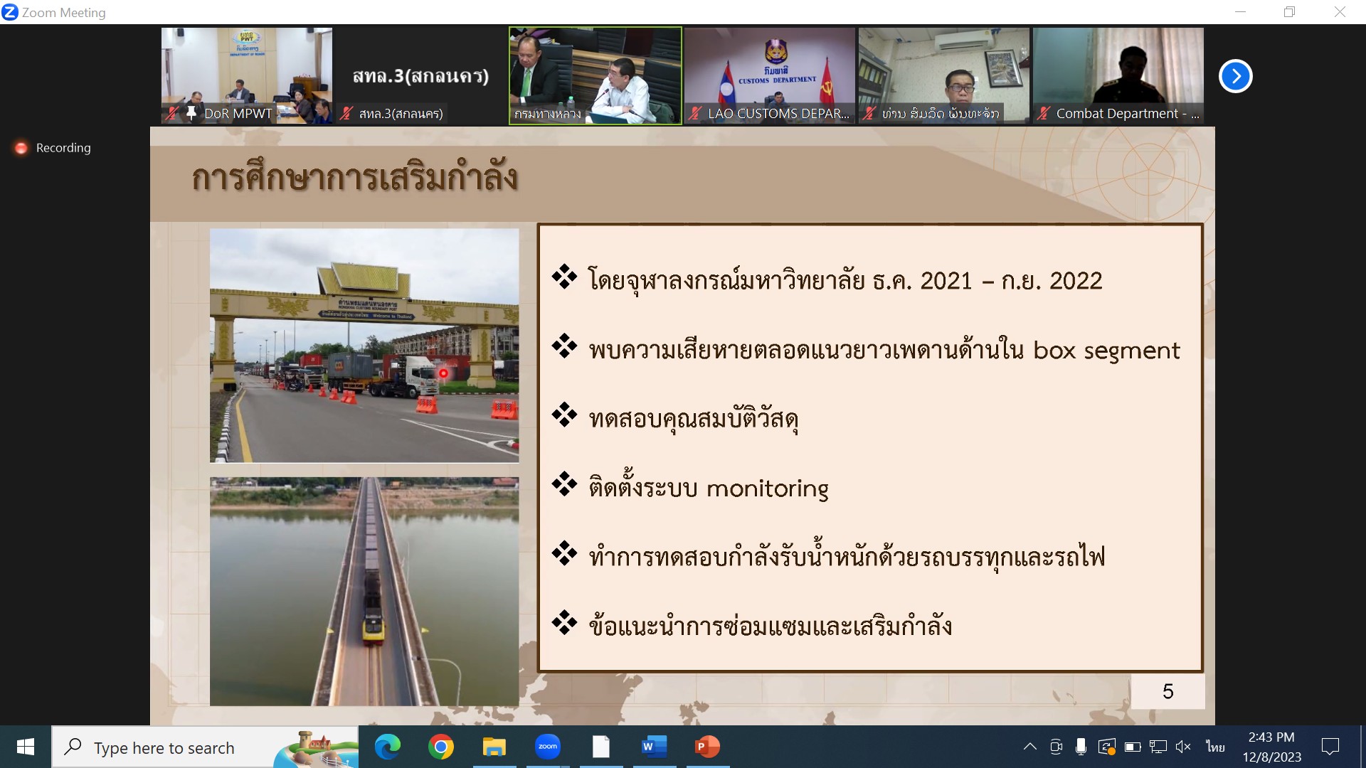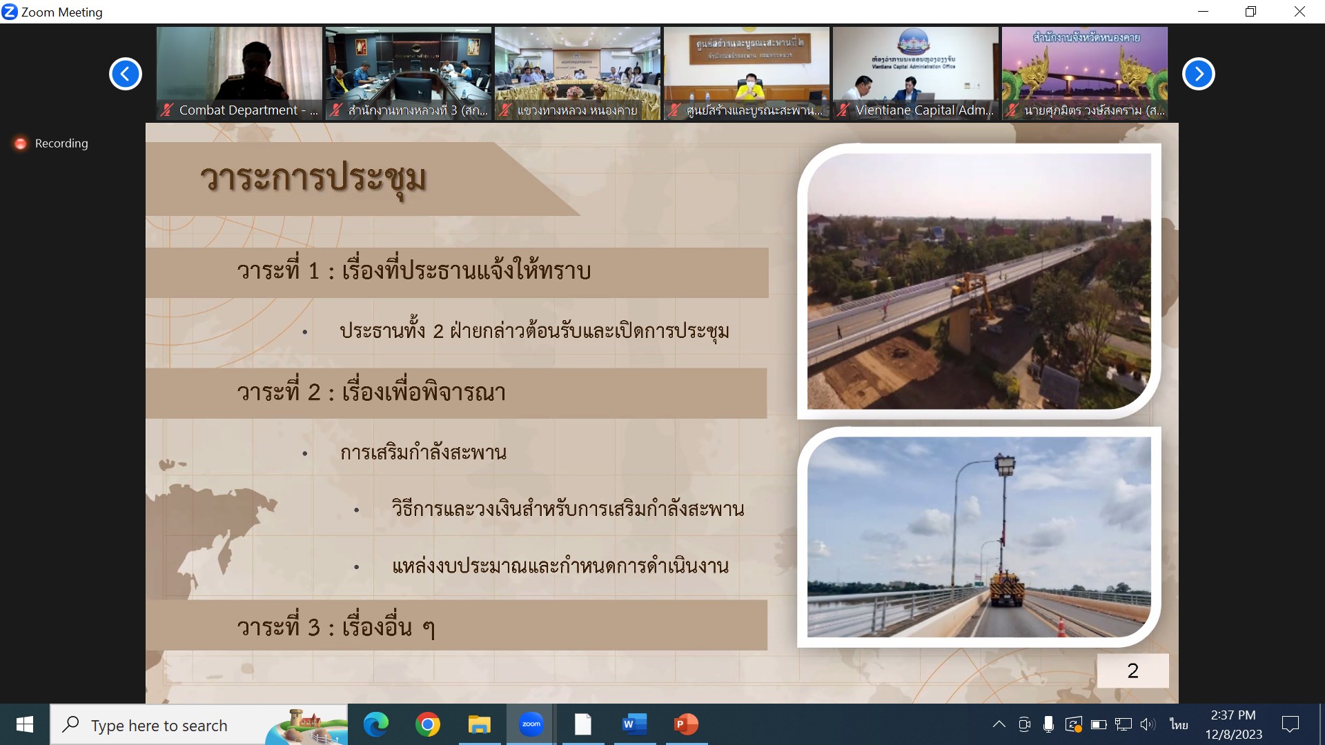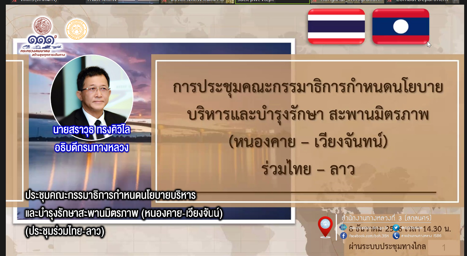 เวลา 14.00 น. นายประวัติ เสวตวงษ์ รองผู้อำนวยการสำนักงานทางหลวงที่ 3 พร้อมด้วยวิศวกรโยธา นายช่างโยธา ส่วนแผนงาน ร่วมประชุมคณะกรรมาธิการกำหนดนโยบายบริหารและบำรุงรักษาสะพานมิตรภาพ (หนองคาย-เวียงจันน์) (ประชุมร่วมไทย-ลาว) ผ่านระบบออนไลน์ ZOOM ณ ห้องประชุมทวีพัฒน์ ตินะมาส ชั้น 3 อาคารหลังใหม่