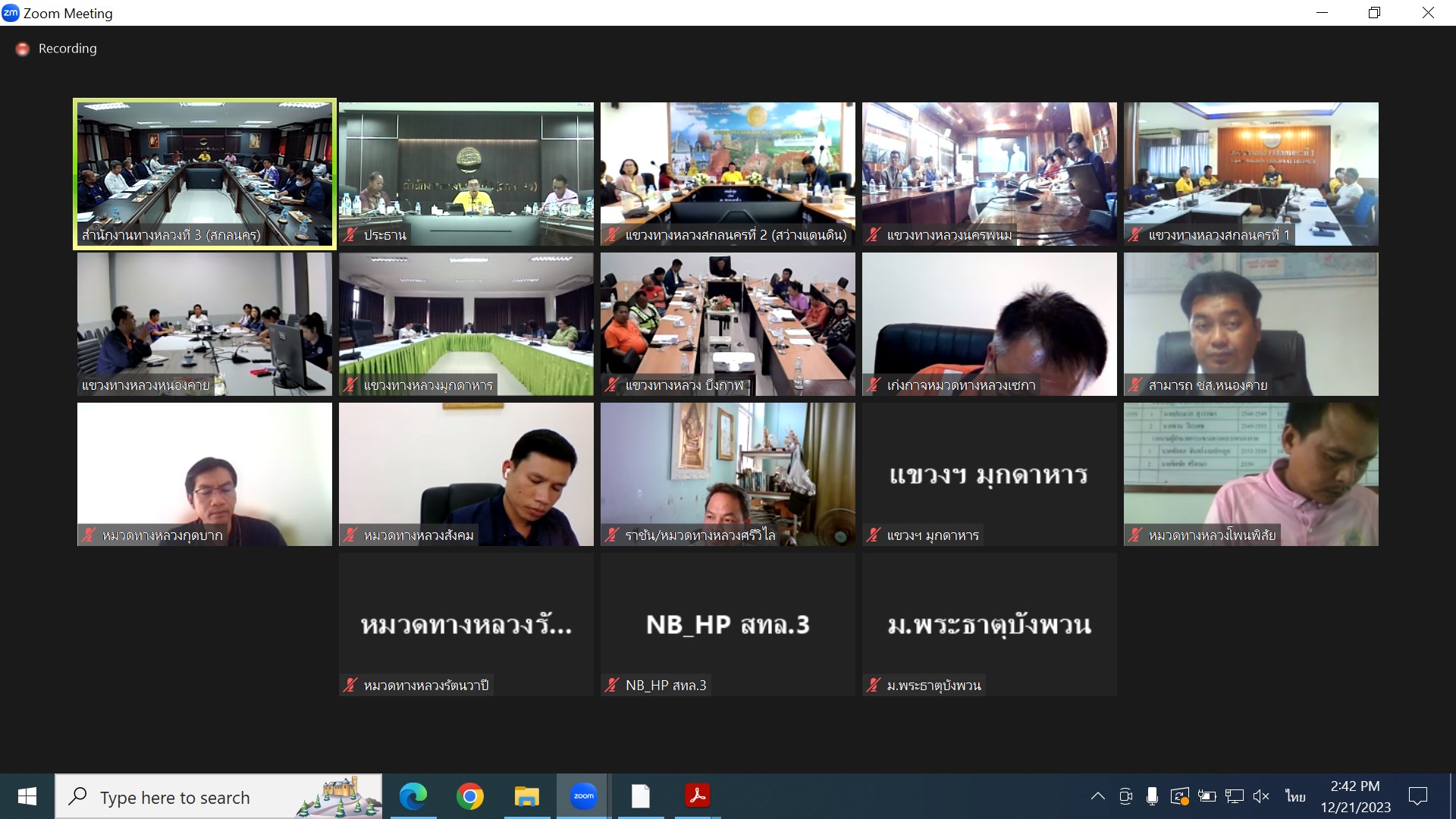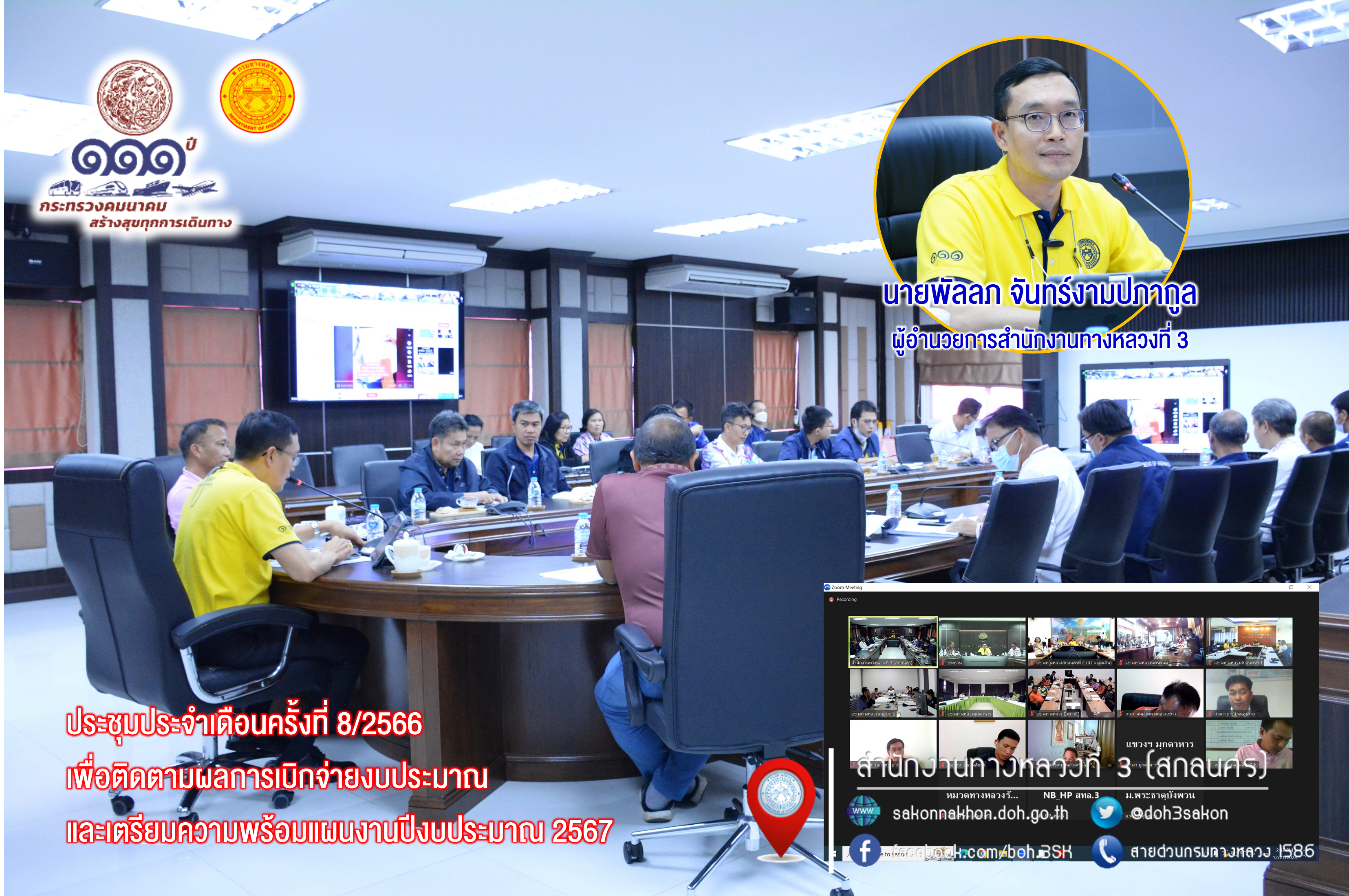 เวลา 13.30 - 16.30 น. นายวุฒิพงศ์ คำภูแสน รองผู้อำนวยการสำนักงานทางหลวงที่ 3 ตำแหน่งที่ 1 พร้อมด้วยนายประวัติ เสวตวงษ์ รองผู้อำนวยการสำนักงานทางหลวงที่ 3 ตำแหน่ง ที่ 2 ผู้อำนวยการส่วน/ฝ่าย หัวหน้างาน และเจ้าหน้าที่ที่เกี่ยวข้องประชุมประจำเดือนครั้งที่ 8/2566 เพื่อติดตามผลการเบิกจ่ายงบประมาณ และเตรียมความพร้อมแผนงานปีงบประมาณ 2567 ณ ห้องประชุมทวีพัฒน์ ตินะมาส ชั้น 3 อาคารหลังใหม่ โดยมีแขวงทางหลวงในสังกัด เข้าประชุมออนไลน์ผ่านทาง ZOOM Meeting