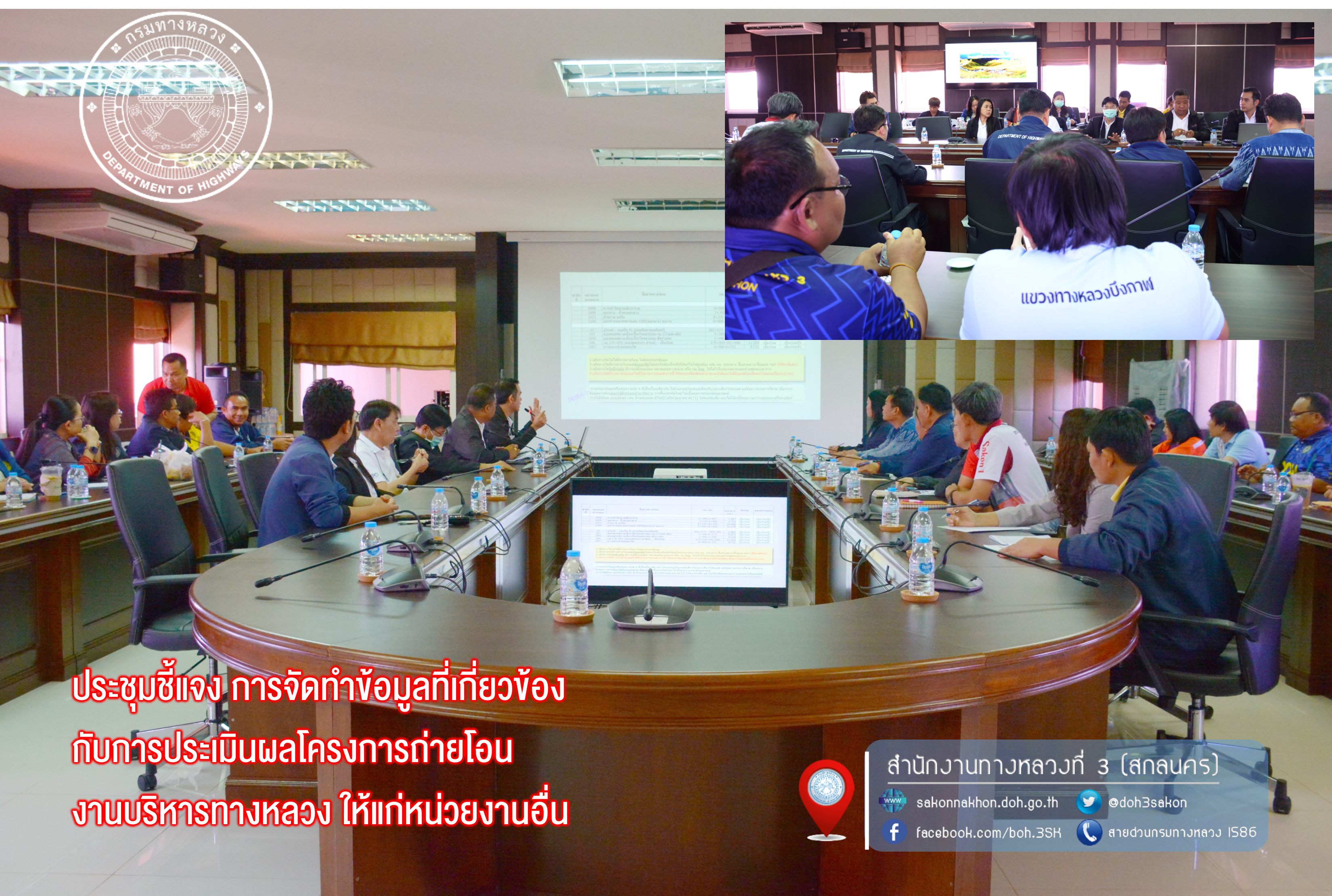 วันที่ 5 มกราคม 2567 เวลา 13.30 น. นายอำนาจ สาไชยันต์ ผู้อำนวยการส่วนเทคโนโลยีสารสนเทศ พร้อมด้วย เจ้าหน้าที่ส่วนเทคโนโลยีสารสนเทศ เจ้าหน้าที่แขวงทางหลวงและหมวดทางหลวงในสังกัดสำนักงานทางหลวงสกลนครที่ 3 เข้าร่วมประชุมชี้แจงการ จัดทำข้อมูลที่เกี่ยวข้องกับการประเมินผลโครงการถ่ายโอนงานบริหารทางหลวงให้แก่หน่วยงานอื่น โดยมี เจ้าหน้าที่จากกลุ่มงานประเมินผล สำนักงานแผน เป็นวิทยากรการประเมิน ณ ห้องประชุมทวีพัฒน์ ตินะมาส ชั้น 3 อาคารหลังใหม่