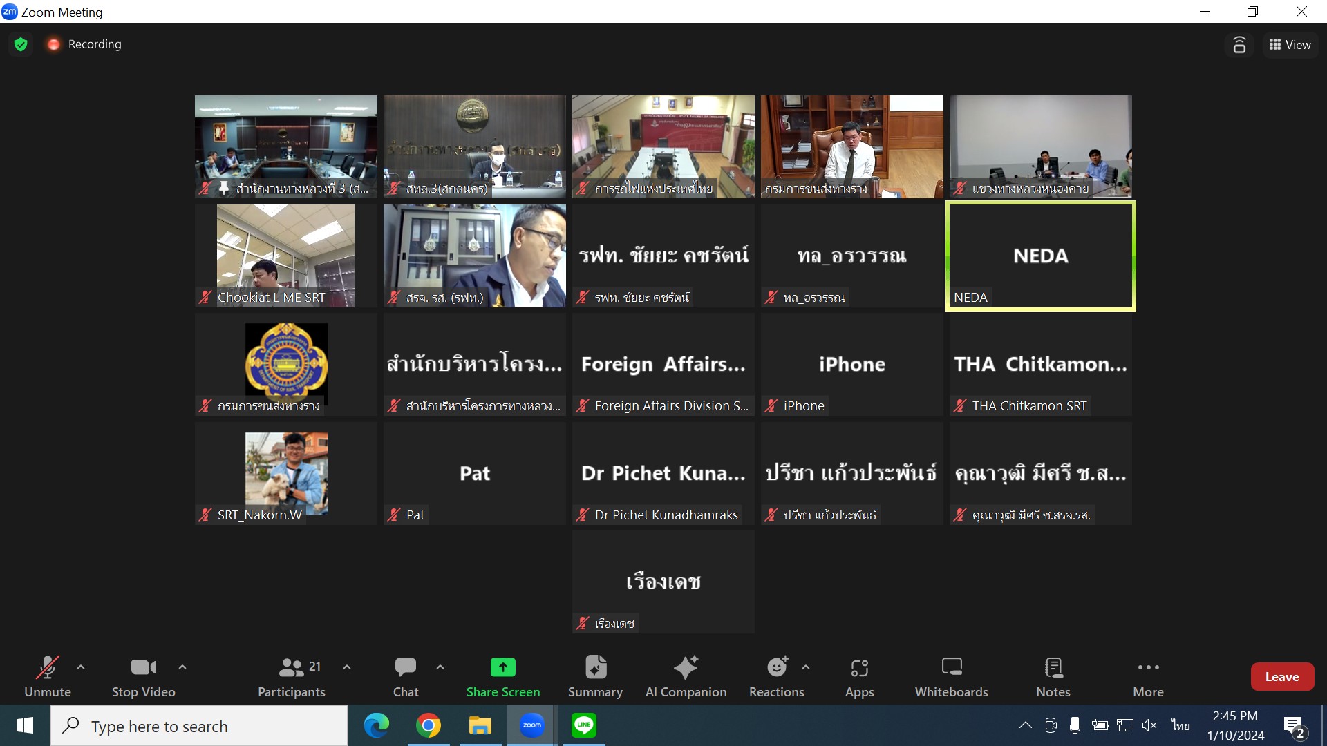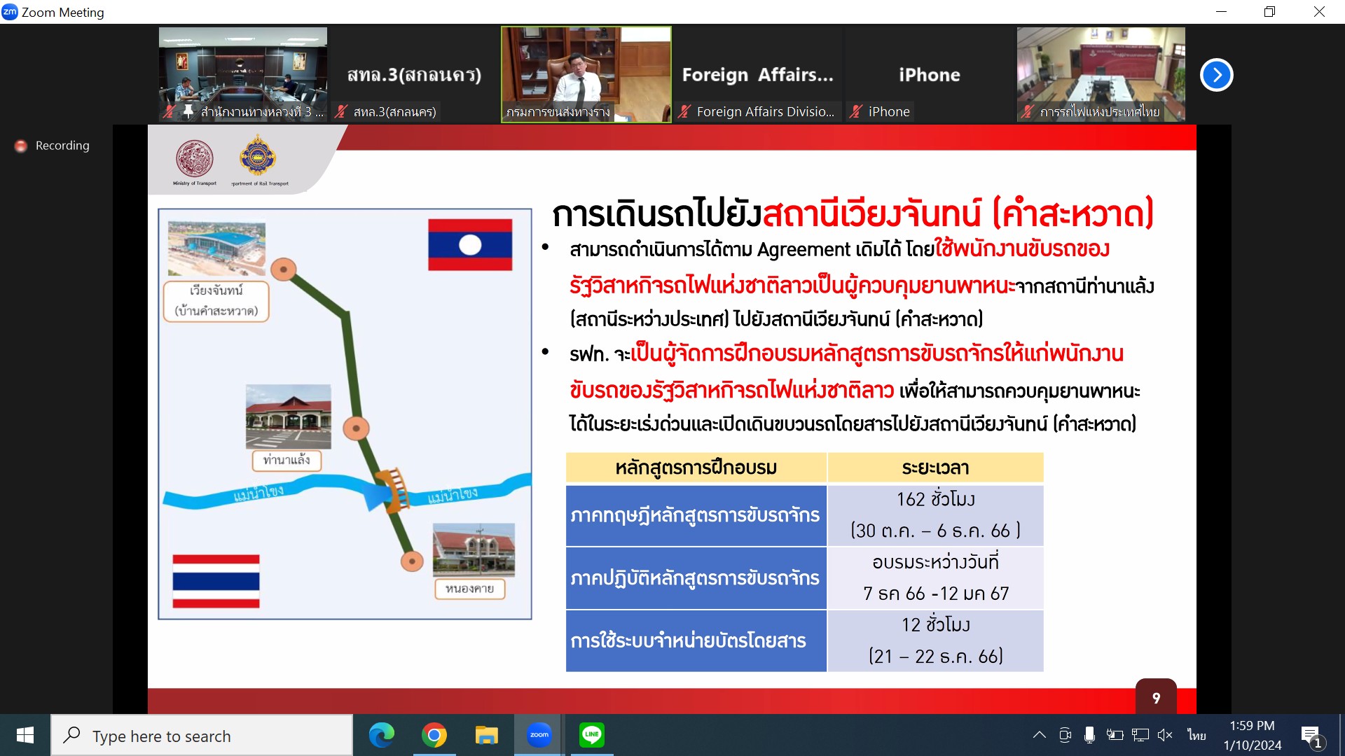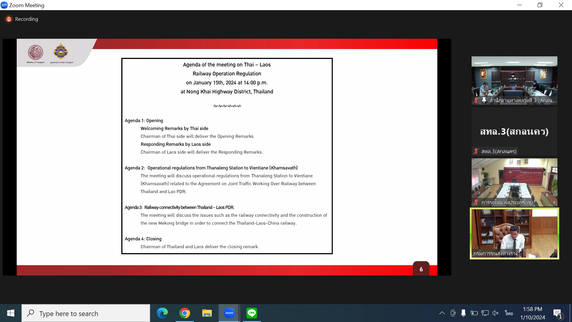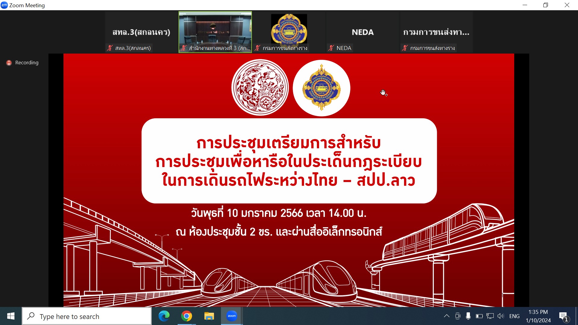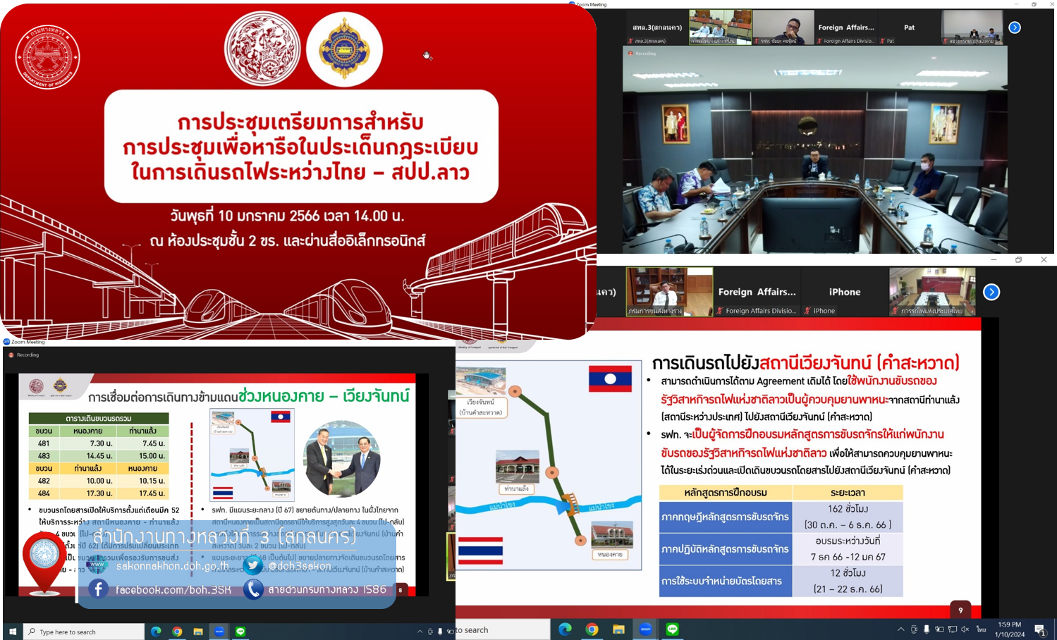 ร่วมการประชุมเตรียมการสำหรับ การประชุมหารือกฎระเบียบในการเดินทางรถไฟระหว่างไทย – สาธารณรัฐประชาธิปไตยประชาชนลาว ณ จังหวัดหนองคาย ในการเปิดให้บริการของเส้นทางท่านาแล้ง – เวียงจันทน์(บ้านคำสะหวาด) ซึ่งเกี่ยวข้องกับข้อตกลงว่าด้วยการเดินรถไฟร่วมกันระหว่างไทย - สปป.ลาว. โดยผ่านระบบ Zoom Cloud Meeting ณ ห้องประชุมทวีพัฒน์ ตินะมาส ชั้น 3 สำนักงานทางหลวงที่ 3 (สกลนคร) อาคารหลังใหม่