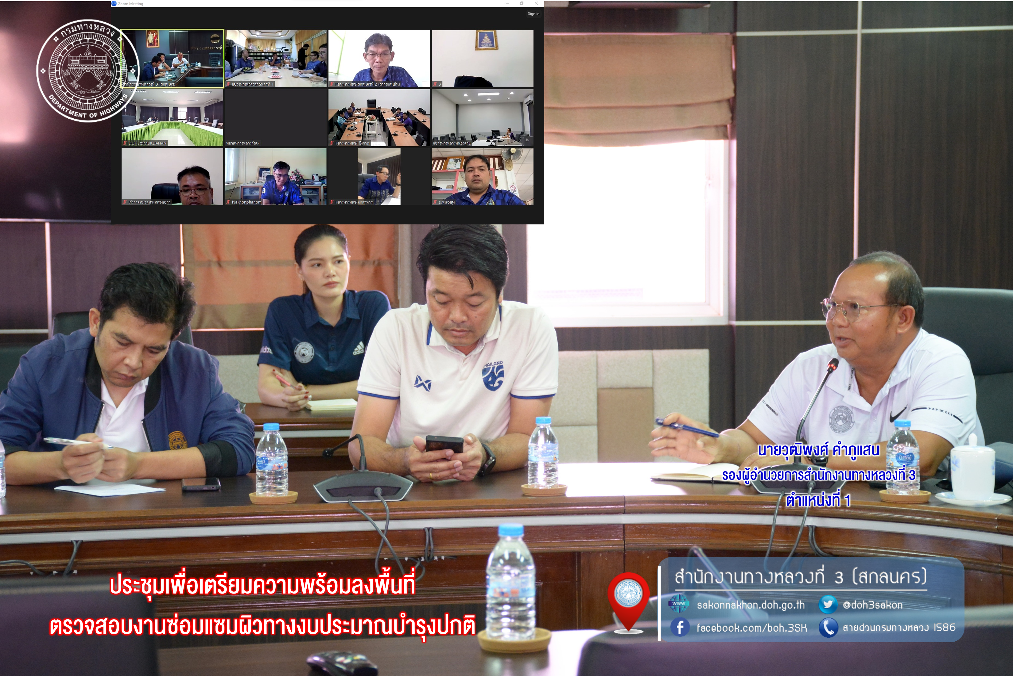 วันที่ 7 กุมภาพันธ์ 2567 เวลา 11.00 - 12.00 น. นายวุฒิพงศ์ คำภูแสน รองผู้อำนวยการสำนักงานทางหลวงที่ 3 ตำแหน่งที่ 1 พร้อมด้วย นายอำนาจ สาไชยันต์ ผู้อำนวยการส่วนเทคโนโลยีสารสนเทศ และนายเอกชัย บุญพรม วิศวกรโยธาปฏิบัติการ เข้าร่วมประชุมเพื่อเตรียมความพร้อมลงพื้นที่ตรวจสอบงานซ่อมแซมผิวทางงบประมาณบำรุงปกติ โดยมี รองผู้อำนวยการแขวงทางหลวง(ฝ่ายปฏิบัติการ) ทุกแขวงฯในสังกัด เข้าประชุมออนไลน์ผ่านทาง Zoom Meeting ณ ห้องประชุมทวีพัฒน์ ตินะมาส ชั้น 3 อาคารหลังใหม่
