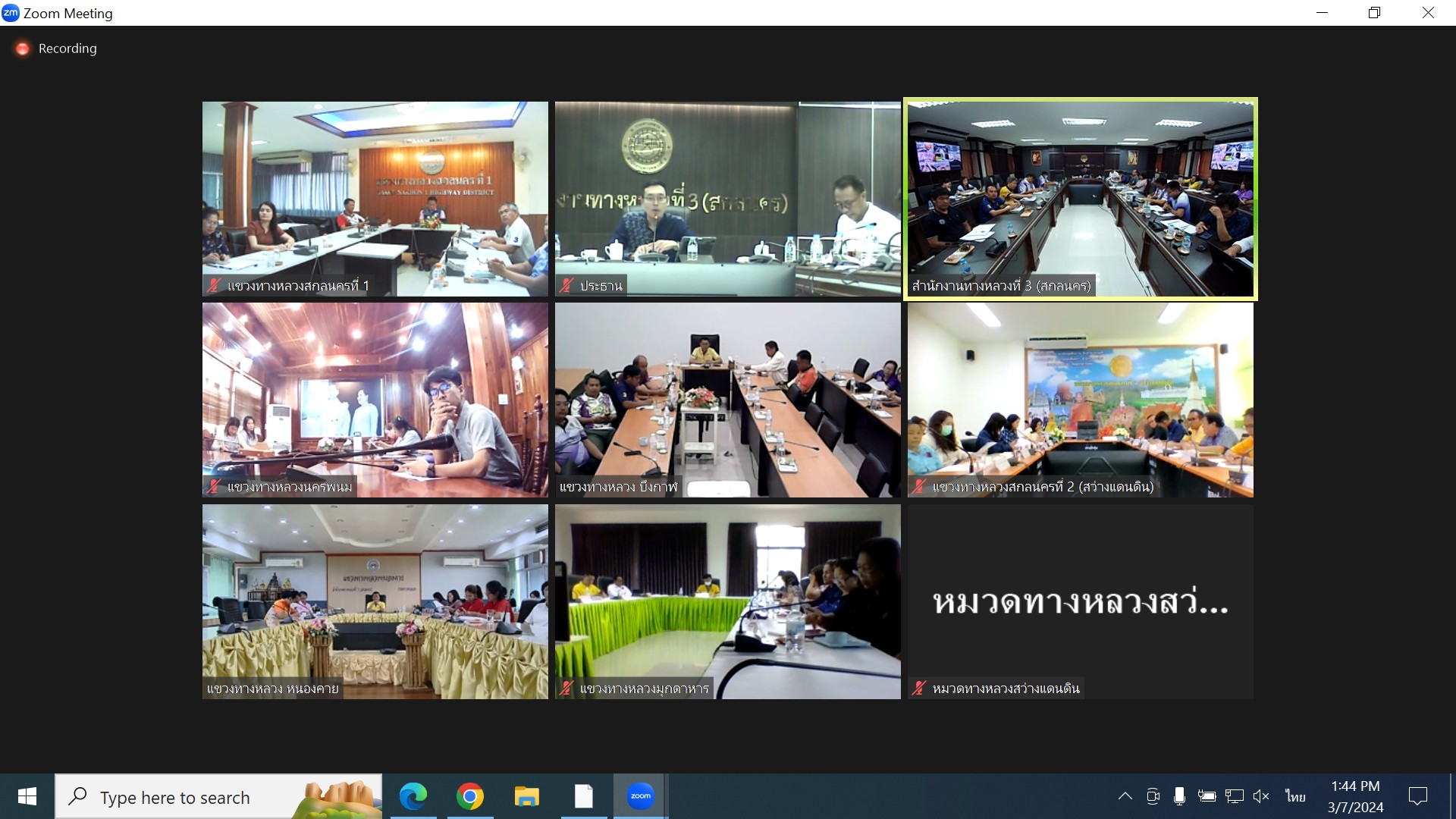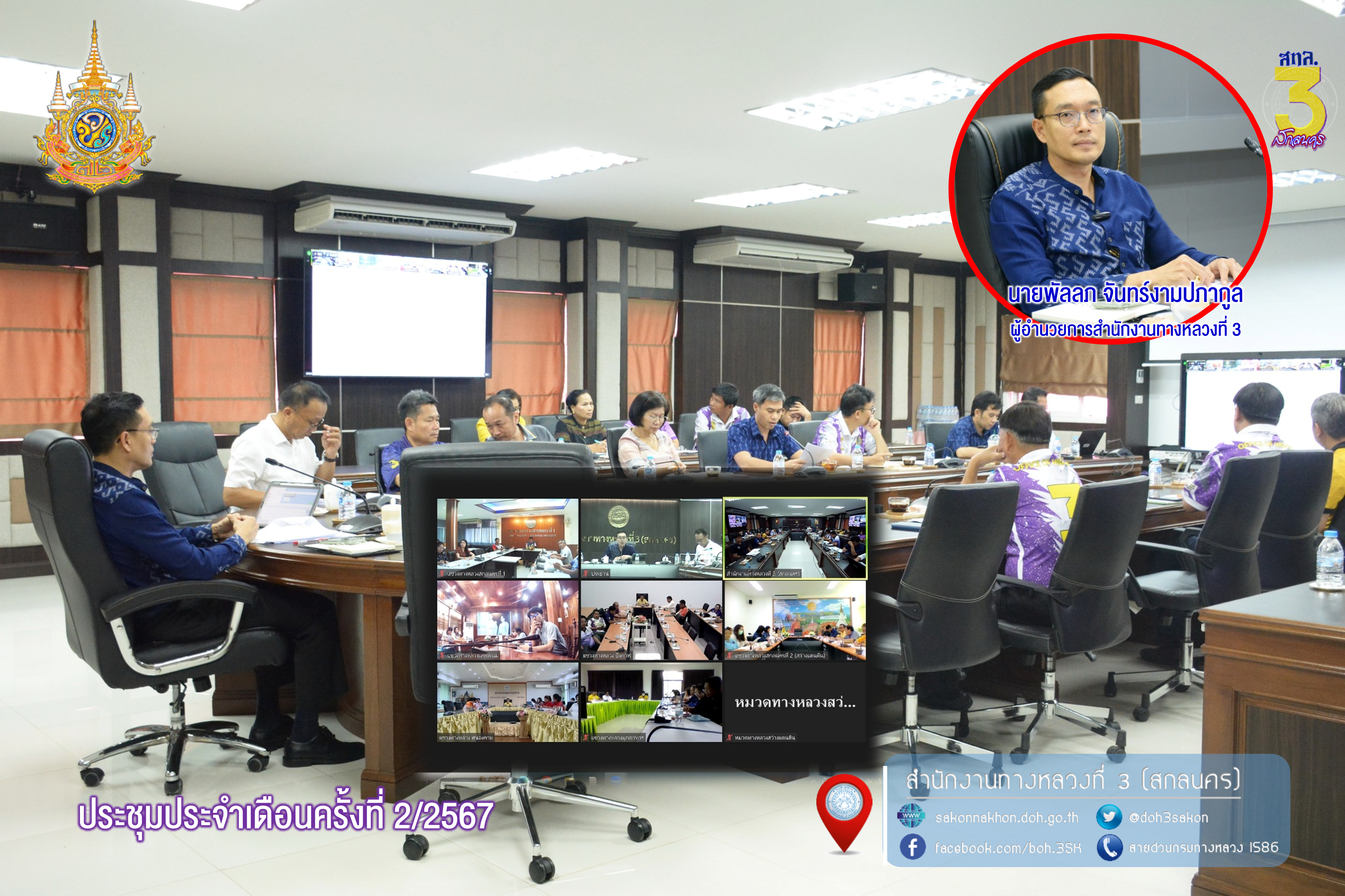 วันที่ 7 มีนาคม 2567 เวลา 13.30 - 16.30 น.นายพัลลภ จันทร์งามปภากูล ผู้อำนวยการสำนักงานทางหลวงที่ 3 เป็นประธานประชุมประจำเดือนครั้งที่ 2/2567 โดยมีนายประวัติ เสวตวงษ์ รองผู้อำนวยการสำนักงานทางหลวงที่ 3 ตำแหน่ง ที่ 2 พร้อมด้วย ผู้อำนวยการส่วน/ฝ่าย หัวหน้างาน และเจ้าหน้าที่ที่เกี่ยวข้อง ประชุมประจำเดือนครั้งที่ 2/2567 เพื่อติดตามงาน และติดตามผลการเบิกจ่ายงบประมาณ รวมทั้ง เตรียมความพร้อมแผนงานปีงบประมาณ 2567 และปีงบประมาณ 2568 ณ ห้องประชุมทวีพัฒน์ ตินะมาส ชั้น 3 อาคารหลังใหม่ ส่วนผู้อำนวยแขวงทางหลวง และเจ้าหน้าที่ที่เกี่ยวข้องในสังกัด เข้าประชุมออนไลน์ผ่านทาง ZOOM Meeting