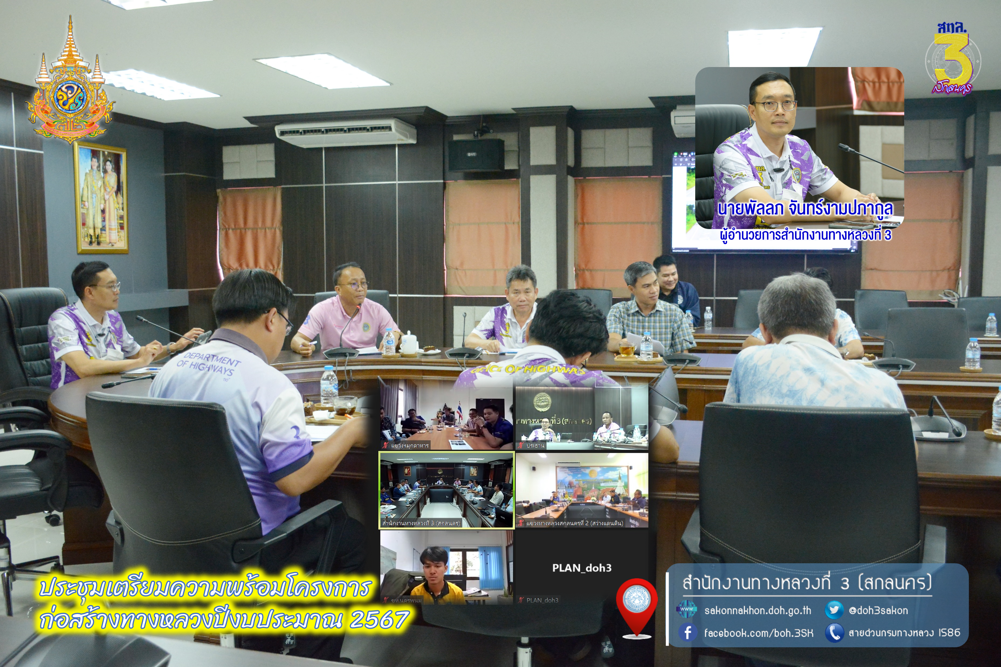 วันที่ 8 มีนาคม 2567 เวลา 10.00 - 12.00 น.นายพัลลภ จันทร์งามปภากูล ผู้อำนวยการสำนักงานทางหลวงที่ 3 ประธานประชุมเตรียมความพร้อมโครงการก่อสร้างทางหลวงปีงบประมาณ 2567 โดยมีนายประวัติ เสวตวงษ์ รองผู้อำนวยการสำนักงานทางหลวงที่ 3 พร้อมด้วยนายชินนพัทธ์ มุลทาทอง ผู้อำนวยการส่วนแผนงาน นายพงษ์ศักดิ์ อาจลา ผู้อำนวยการส่วนสำรวจและออกแบบ นายพัฒนา ไตรโยธี ผู้อำนวยการส่วนอำนวยความปลอดภัย และวิศวกรโยธา/นายช่างโยธาส่วนแผนงาน ส่วนสำรวจและออกแบบ ส่วนตรวจสอบและวิเคราะห์ทางวิศวกรรม ส่วนควบคุมงานก่อสร้างทาง ร่วมประชุมเตรียมความพร้อมโครงการก่อสร้างทางหลวงปีงบประมาณ 2567 ณ ห้องประชุมทวีพัฒน์ ตินะมาส ชั้น 3 (อาคารหลังใหม่) ส่วนแขวงทางหลวงมุกดาหาร แขวงทางหลวงนครพนม แขวงทางหลวงสกลนครที่ 2(สว่างแดนดิน) ร่วมประชุมออนไลน์ผ่านทาง ZOOM Meeting