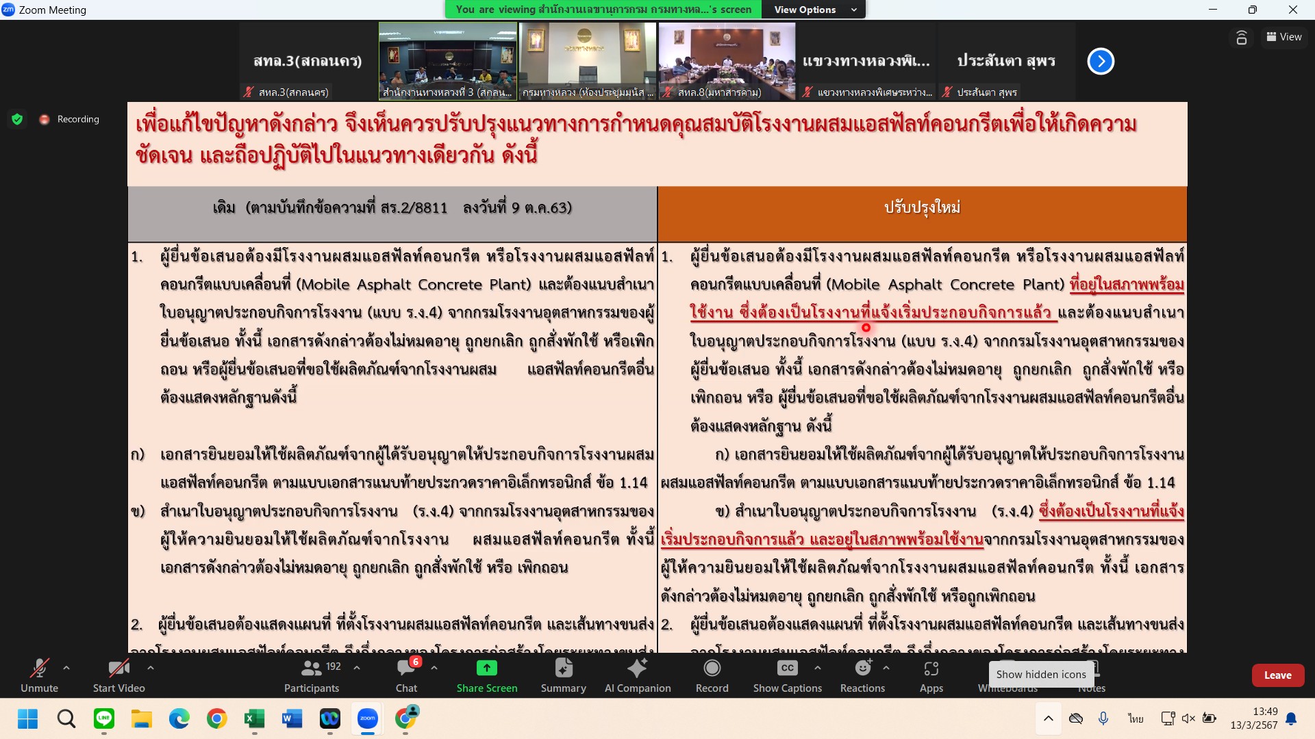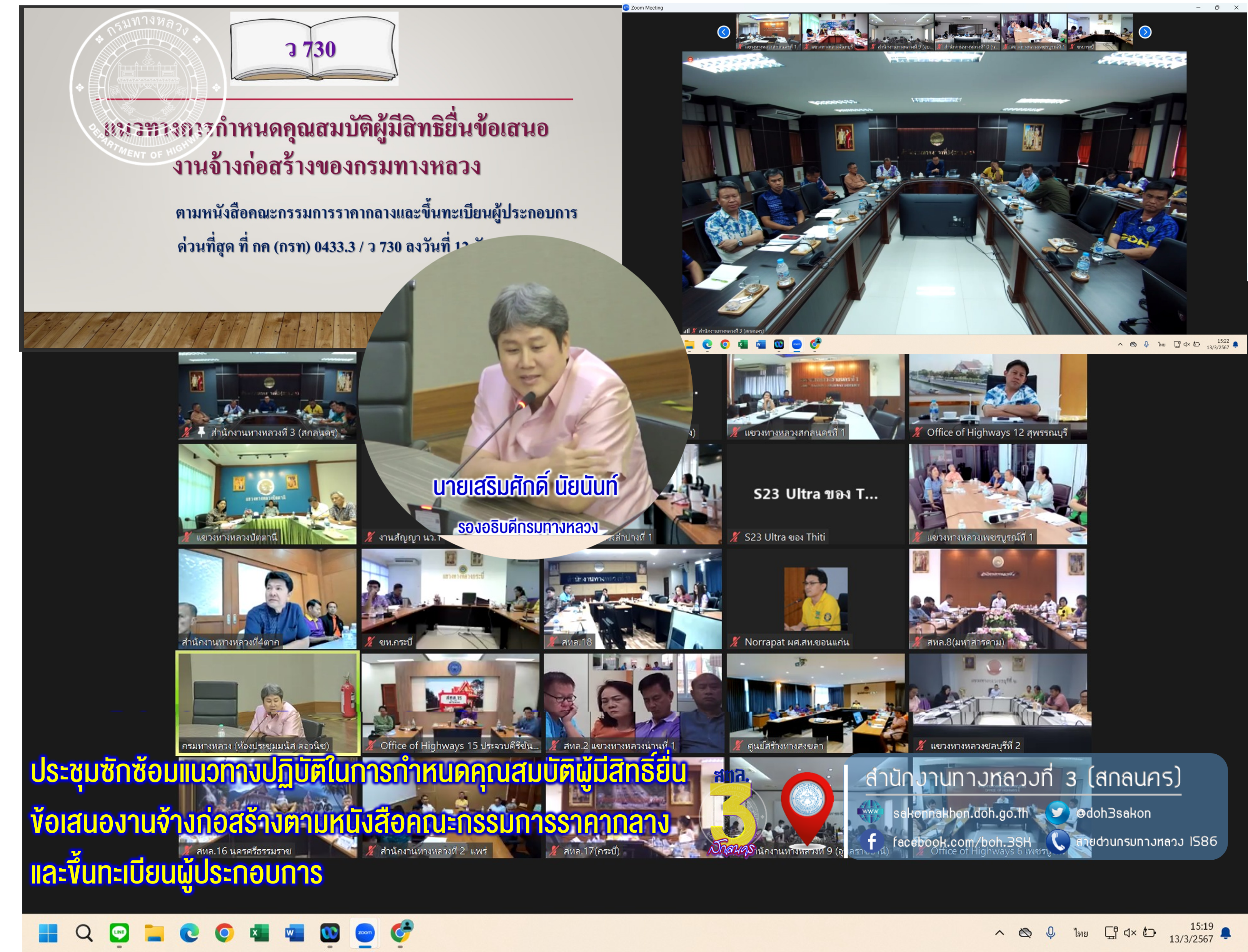 วันที่ 13 มีนาคม 2567 เวลา 13.00น. นายพัลลภ จันทร์งามปภากูล ผู้อำนวยการสำนักงานทางหลวงที่ 3 พร้อมด้วย นายวุฒิพงศ์ คำภูแสน รองผู้อำนวยการสำนักงานทางหลวงที่ 3 ตำแหน่งที่ 1 นายประวัติ เสวตวงษ์ รองผู้อำนวยการสำนักงานทางหลวงที่ 3 ตำแหน่งที่ 2 ผู้อำนวยการแขวงทางหลวงในสังกัด นางนภาพิศ สุวรรณศรี ผู้อำนวยการฝ่ายบริหารงานทั่วไป นายชินนพัทธ์ มุลทาทอง ผู้อำนวยการส่วนแผนงาน และเจ้าหน้าที่ที่เกี่ยวข้อง เข้าร่วมประชุมซักซ้อมแนวทางปฏิบัติในการกำหนดคุณสมบัติผู้มีสิทธิ์ยื่นข้อเสนองานจ้างก่อสร้างตามหนังสือคณะกรรมการราคากลางและขึ้นทะเบียนผู้ประกอบการ ผ่านระบบออนไลน์ Zoom Cloud Meeting ณ ห้องประชุมทวีพัฒน์ ตินะมาส ชั้น 3 อาคารหลังใหม่