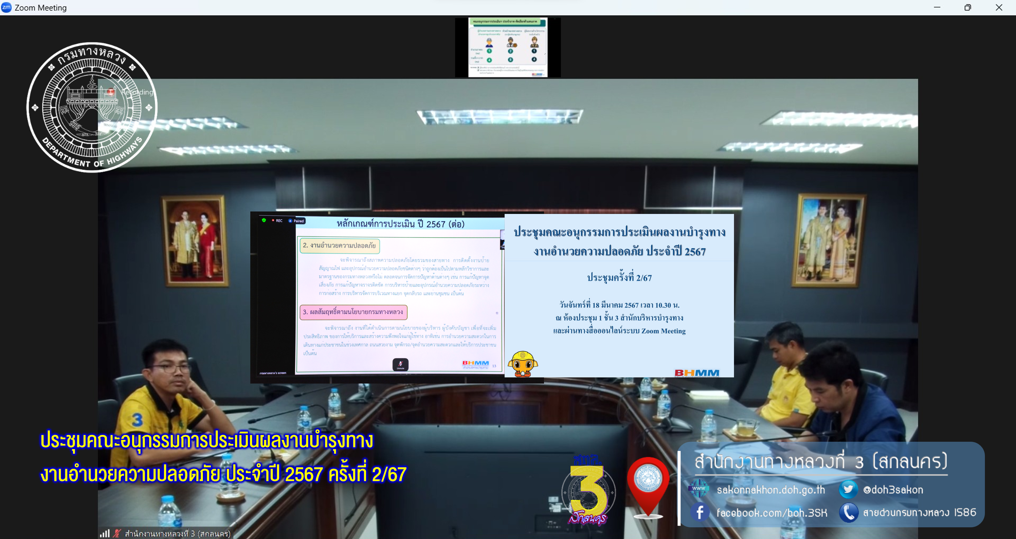 วันที่ 18 มีนาคม 2567 เวลา 10.30 น.นายพัลลภ จันทร์งามปภากูล ผู้อำนวยการสำนักงานทางหลวงที่ 3(สกลนคร) ประธานอนุกรรมการประเมินผลงานบำรุงทาง งานอำนวยความปลอดภัย ประจำภาคตะวันออกเฉียงเหนือ ปี 2567 เข้าร่วมประชุมคณะอนุกรรมการประเมินผลงานบำรุงทาง งานอำนวยความปลอดภัย ประจำปี 2567 ครั้งที่ 2/67 ณ ห้องประชุม 1 ชั้น 3 สำนักบริหารบำรุงทาง กรมทางหลวง โดยมี นายชินนพัทธ์ มุลทาทอง ผู้อำนวยการส่วนแผนงาน นายอำนาจ สาไชยันต์ ผู้อำนวยการส่วนเทคโนโลยีสารสนเทศ และนายธนากรณ์ ติยะบุตร วิศวกรโยธาปฏิบัติการ เข้าร่วมประชุมผ่านทางระบบออนไลน์ Zoom Meeting ณ ห้องประชุมทวีพัฒน์ ตินะมาส ชั้น 3 อาคารหลังใหม่