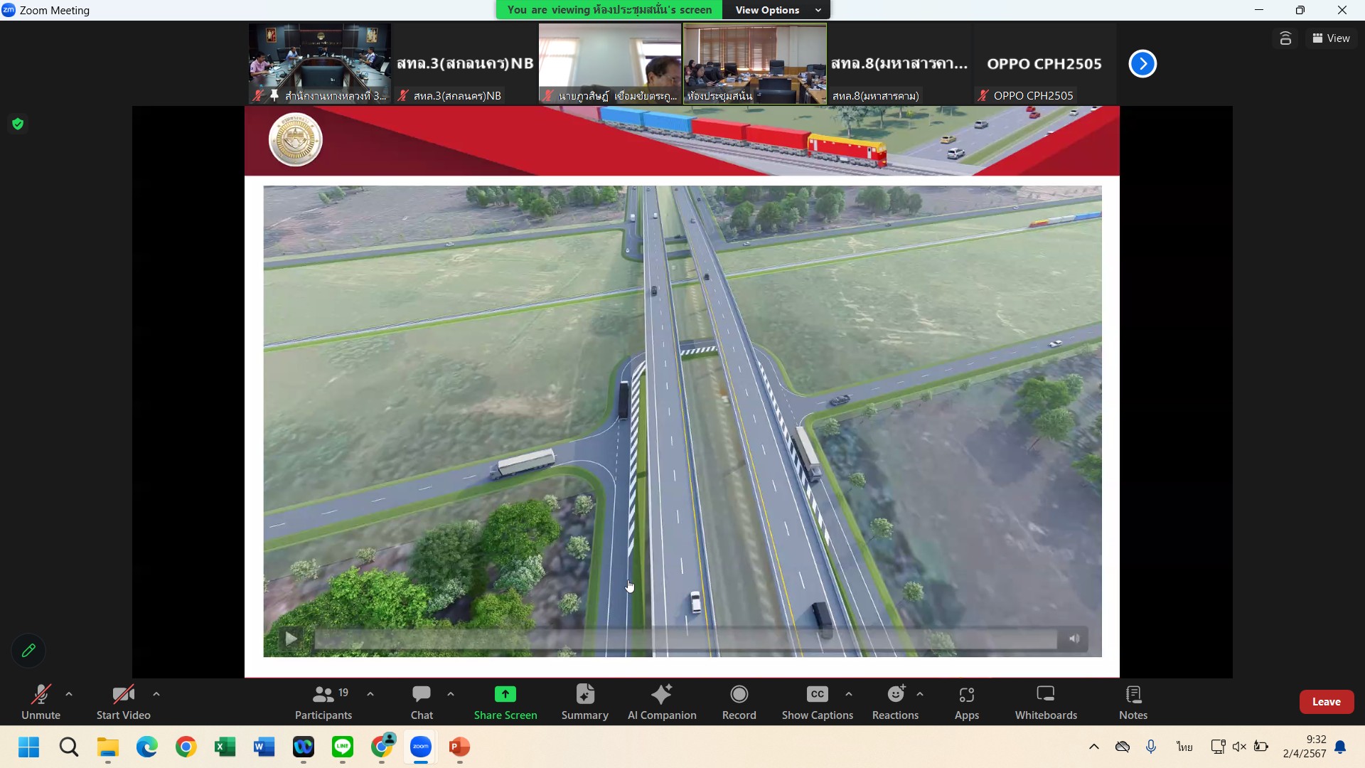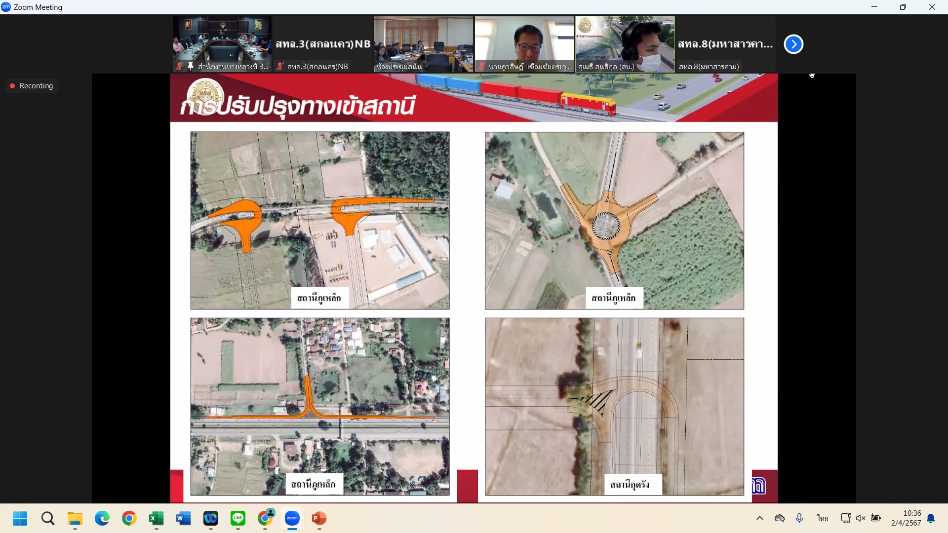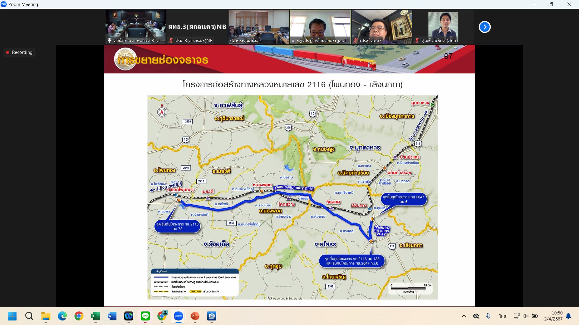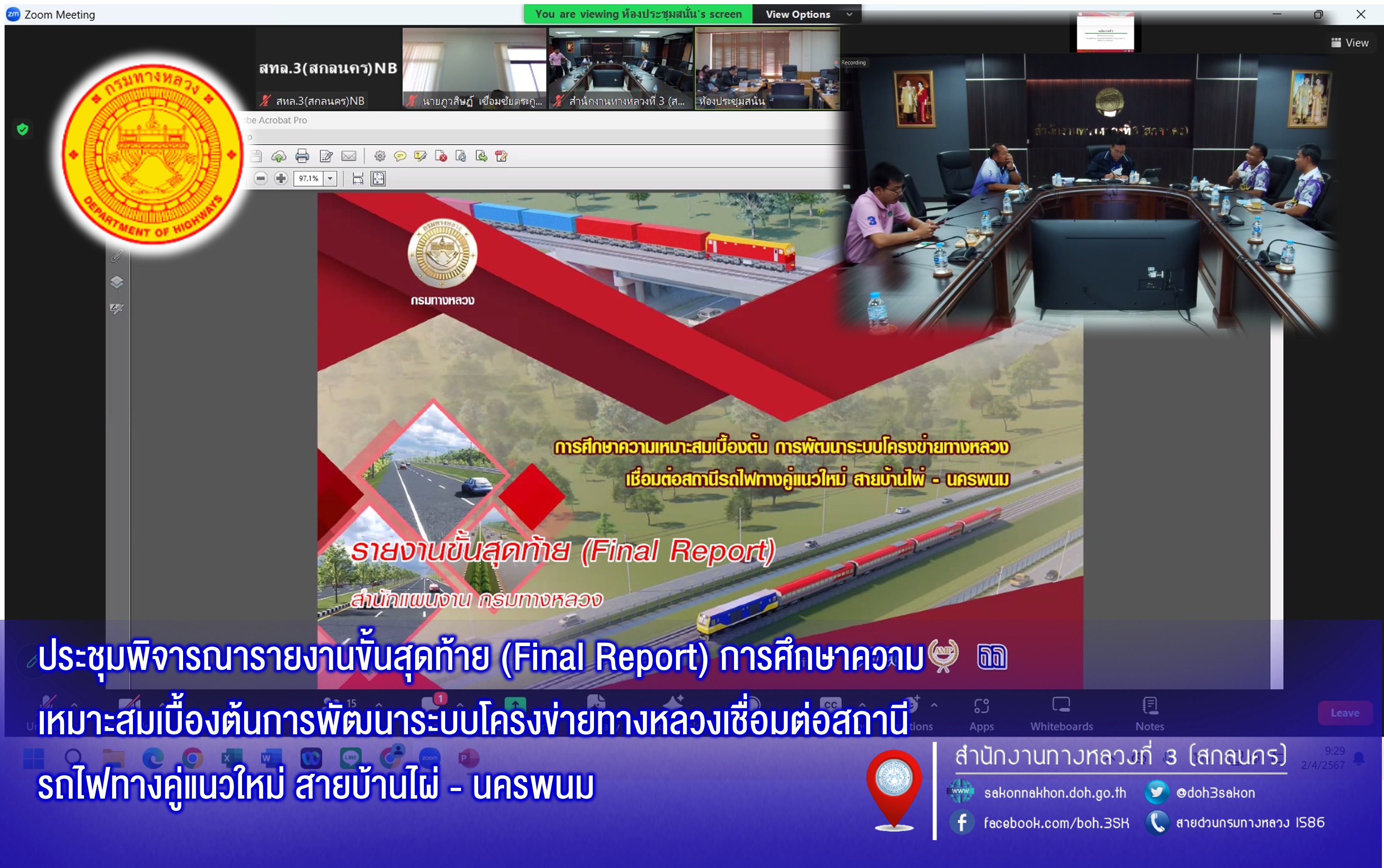 วันที่ 2 เมษายน 2567 เวลา 09.30 - 12.00 น. นายพัลลภ จันทร์งามปภากูล ผู้อำนวยการสำนักงานทางหลวงที่ 3 พร้อมด้วย นายวุฒิพงศ์ คำภูแสน รองผู้อำนวยการสำนักงานทางหลวงที่ 3 ตำแหน่งที่ 1 นายประวัติ เสวตวงษ์ รองผู้อำนวยการสำนักงานทางหลวงที่ 3 ตำแหน่งที่ 2 นายชินนพัทธ์ มุลทาทอง ผู้อำนวยการส่วนแผนงาน วิศวกรโยธาส่วนแผนงาน และเจ้าหน้าที่ส่วนอำนวยความปลอดภัย เข้าร่วมประชุมพิจารณารายงานขั้นสุดท้าย (Final Report) การศึกษาความเหมาะสมเบื้องต้นการพัฒนาระบบโครงข่ายทางหลวงเชื่อมต่อสถานีรถไฟทางคู่แนวใหม่ สายบ้านไผ่ - นครพนม ผ่านระบบออนไลน์ Zoom Cloud Meeting ณ ห้องประชุมวีพัฒน์ ตินะมาส ชั้น 3 (อาคารหลังใหม่) จัดโดย สำนักแผนงาน กลุ่มงานวางแผน กรมทางหลวง