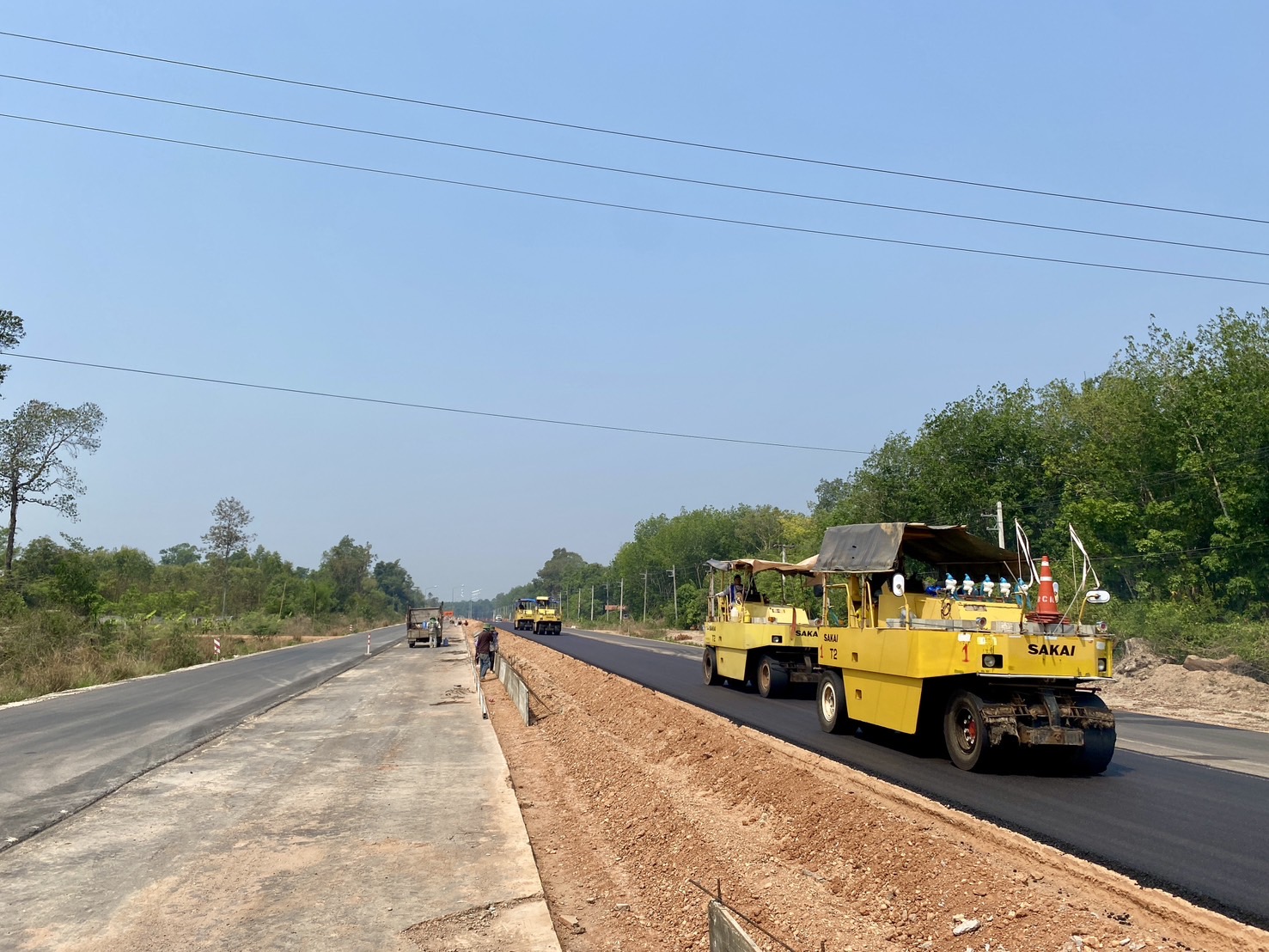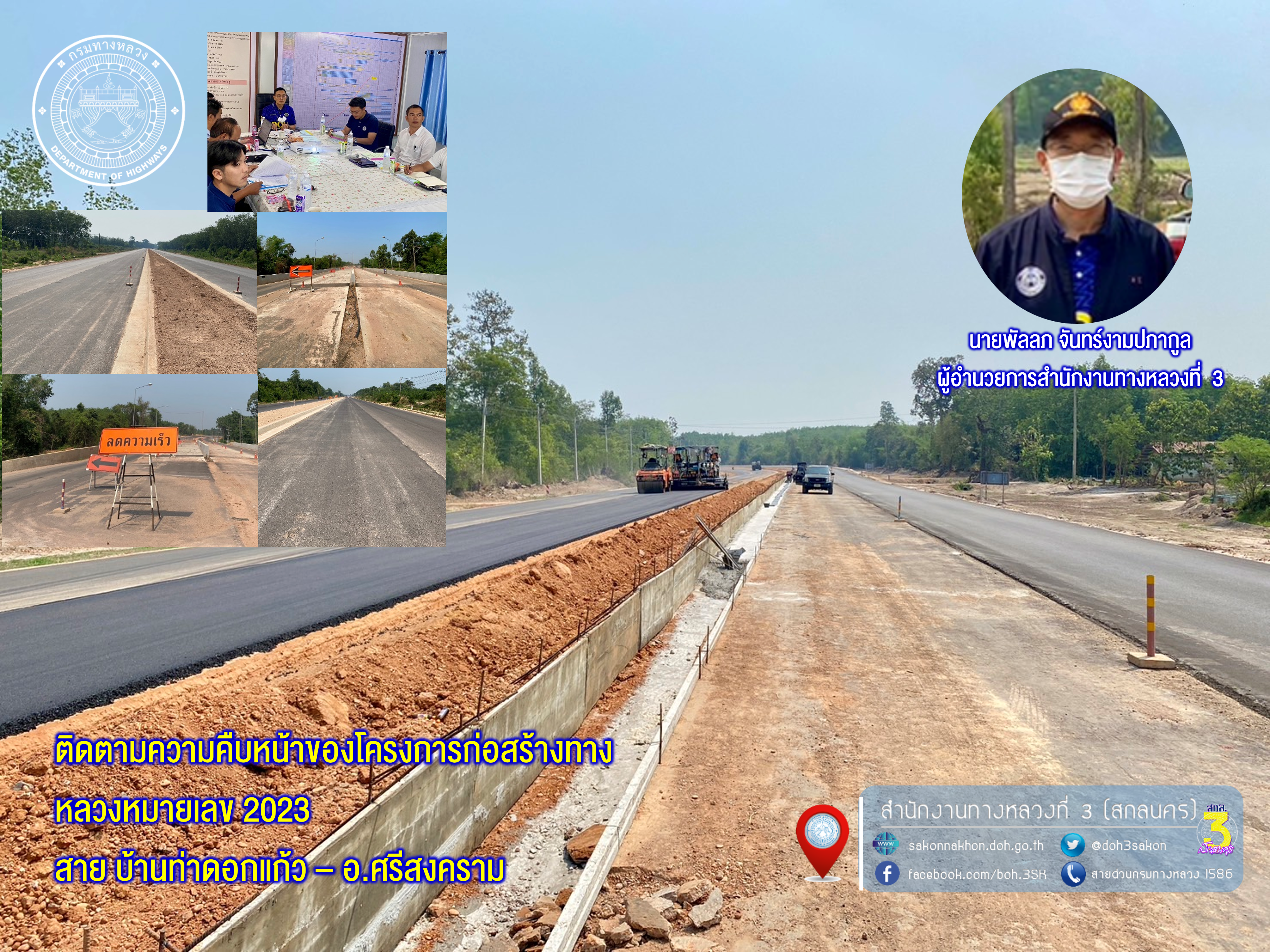 วันที่ 24 เมษายน 2567 เวลา 10.00 น. นายไพฑูรย์ พงษ์ชวลิต รองอธิบดีกรมทางหลวง ประธานกรรมการตรวจรับพัสดุ มอบหมายให้นายพัลลภ จันทร์งามปภากูล ผู้อำนวยการสำนักงานทางหลวงที่ 3 กรรมการตรวจรับพัสดุ พร้อมด้วยนายเดชา พรวนพิทักษ์ ผู้อำนวยการแขวงทางหลวงนครพนม กรรมการตรวจรับพัสดุ และคณะกรรมการตรวจรับพัสดุ ลงพื้นที่ติดตามคืบก้าวหน้าของโครงการก่อสร้างทางหลวงหมายเลข 2023 สาย บ้านท่าดอกแก้ว – อ.ศรีสงคราม ระหว่าง กม.0+000 - กม.28+000 ระยะทางรวม 29.000 กม. วงเงินงบประมาณ 979,437,479 บาท (ตรวจรับงานงวดที่ 11) เพื่อให้การดำเนินงานก่อสร้างทางหลวงแผ่นดินได้ตามแบบมาตรฐานของกรมทางหลวง กระทรวงคมนาคม ควบคุมการก่อสร้างโดยสำนักก่อสร้างทางที่ 2 มีบริษัท บัญชากิจ จำกัด เป็นผู้รับจ้าง พร้อมรับฟังบรรยายสรุปผลการดำเนินงานของโครงการฯ ณ ห้องประชุมสำนักงานชั่วคราวของโครงการฯ