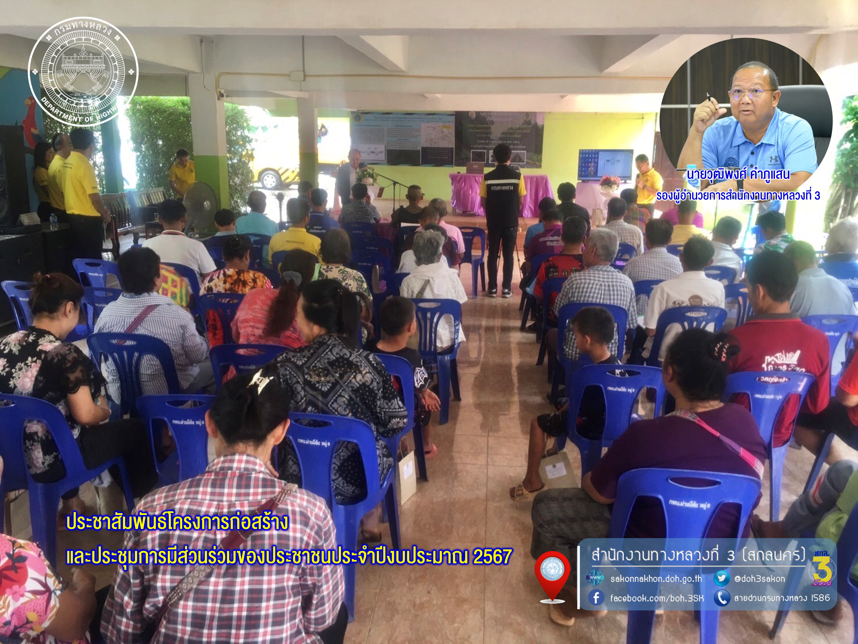 นที่ 30 เมษายน 2567 เวลา 9.30น.นายวุฒิพงศ์ คำภูแสน รองผู้อำนวยการสำนักงานทางหลวงที่ 3 พร้อมด้วยนายสมจิตร สุภาษิต ผู้อำนวยการแขวงทางหลวงบึงกาฬ และเจ้าหน้าที่แขวงทางหลวงบึงกาฬ ลงพื้นที่ประชาสัมพันธ์โครงการก่อสร้างและประชุมการมีส่วนร่วมของประชาชนประจำปีงบประมาณ 2567 ของโครงการสำรวจและออกแบบพร้อมเตรียมการก่อสร้างทางหลวงหมายเลข 212ระหว่าง กม.93+440 - กม.107+560ระยะทางประมาณ 14.120 กิโลเมตร ณ.หอประชุมโรงเรียนธเนตรวิทยาตำบลหอคำ อำเภอเมืองบึงกาฬจังหวัดบึงกาฬ แขวงทางหลวงบึงกาฬ