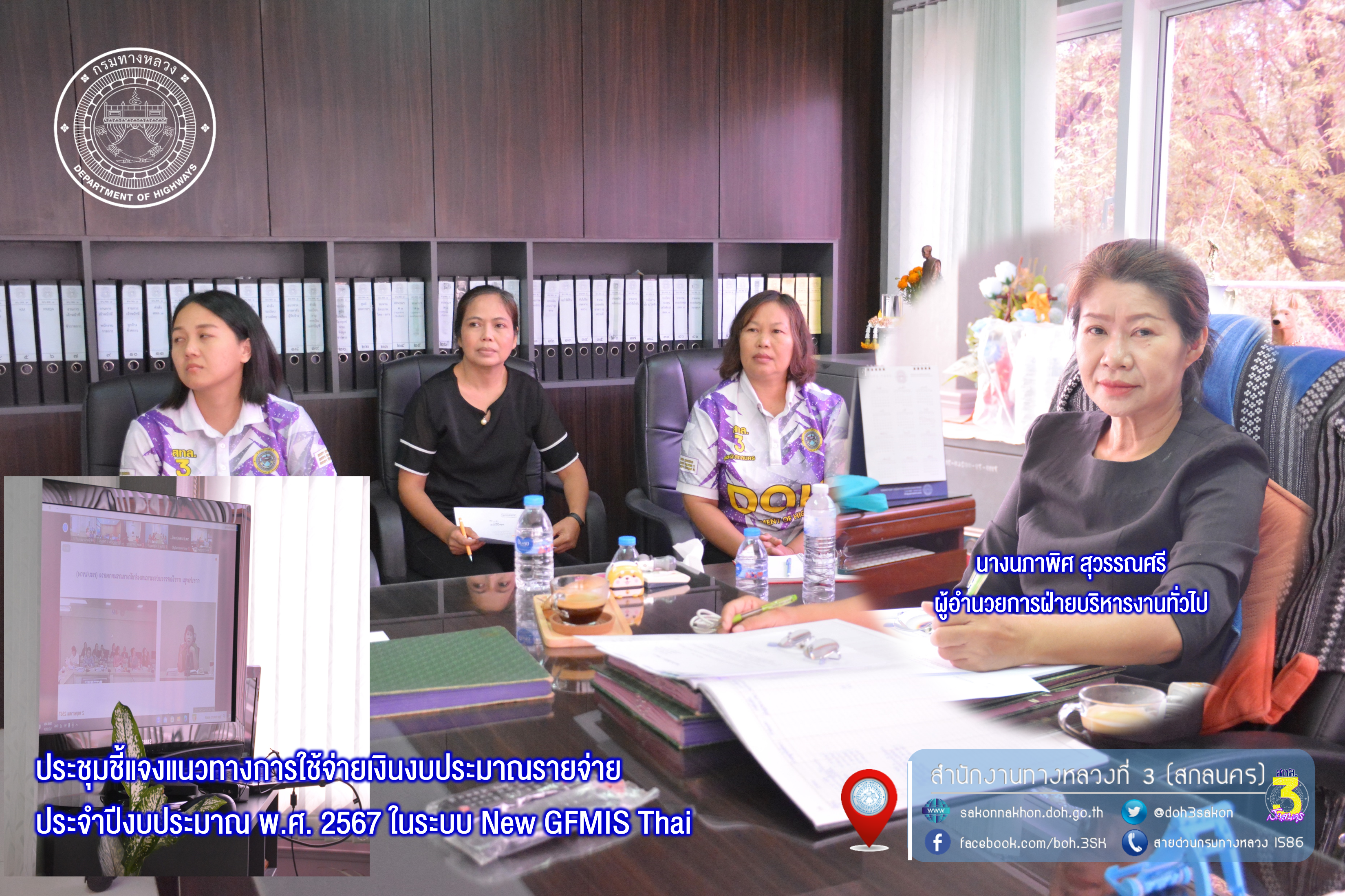 วันที่ 2 พฤษภาคม 2567 เวลา 10.00 น.นางนภาพิศ สุวรรณศรี ผู้อำนวยการฝ่ายบริหารงานทั่วไป พร้อมด้วย นางรุ่งดาว ชมภูวิเศษ หัวหน้างานการเงินและบัญชี และเจ้าหน้าที่การเงินและบัญชี เข้าร่วม ประชุมชี้แจงแนวทางการใช้จ่ายเงินงบประมาณรายจ่ายประจำปีงบประมาณ พ.ศ. 2567 ในระบบ New GFMIS Thai ผ่านระบบออนไลน์Zoom ณ สำนักงานทางหลวงที่ 3 (สกลนคร) จัดโดย กองการเงินและบัญชี กลุ่มพัฒนาระบบการคลัง กรมทางหลวง