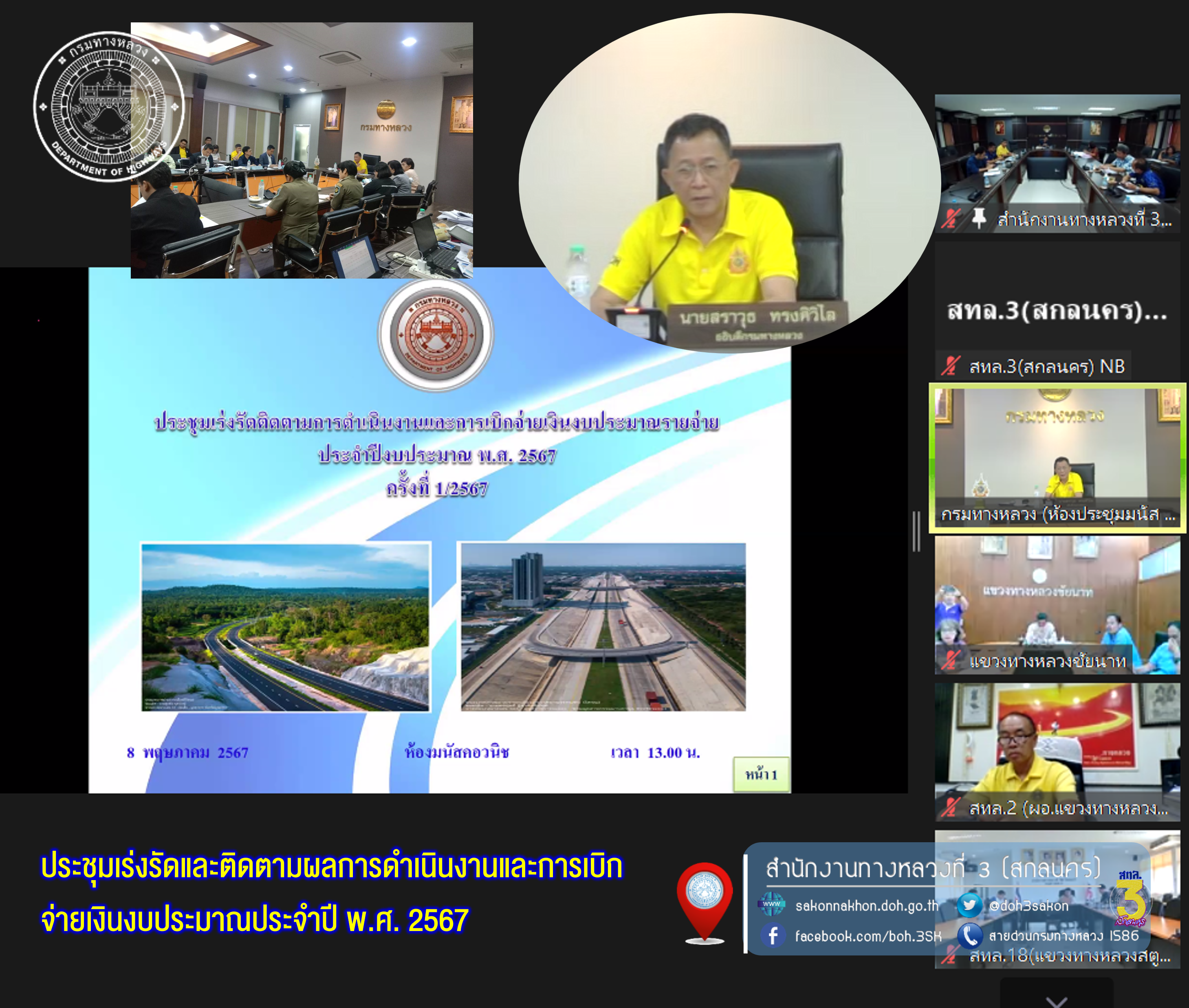 วันที่ 8 พฤษภาคม 2567 เวลา 13.00 - 16.30 น.นายพัลลภ จันทร์งามปภากูล ผู้อำนวยการสำนักงานทางหลวงที่ 3 (สกลนคร) พร้อมด้วย นายชินนพัทธ์ มุลทาทอง ผู้อำนวยการส่วนแผนงาน นางนภาพิศ สุวรรณศรี ผู้อำนวยการฝ่ายบริหารงานทั่วไป นายอำนาจ สาไชยันต์ ผู้อำนวยการส่วนเทคโนโลยีสารสนเทศ นางรุ่งดาว ชมภูวิเศษ หัวหน้างานการเงินและบัญชี วิศวกรโยธา และนายช่างโยธาส่วนแผนงาน เข้าร่วมประชุมเร่งรัดและติดตามผลการดำเนินงานและการเบิกจ่ายเงินงบประมาณประจำปี พ.ศ. 2567 ผ่านระบบออนไลน์ Zoom ณ ห้องประชุมทวีพัฒน์ ตินะมาส ชั้น 3 (อาคารหลังใหม่) จัดโดย กองการเงินและบัญชีฝ่ายจัดสรรและติดตามงบประมาณ กรมทางหลวง