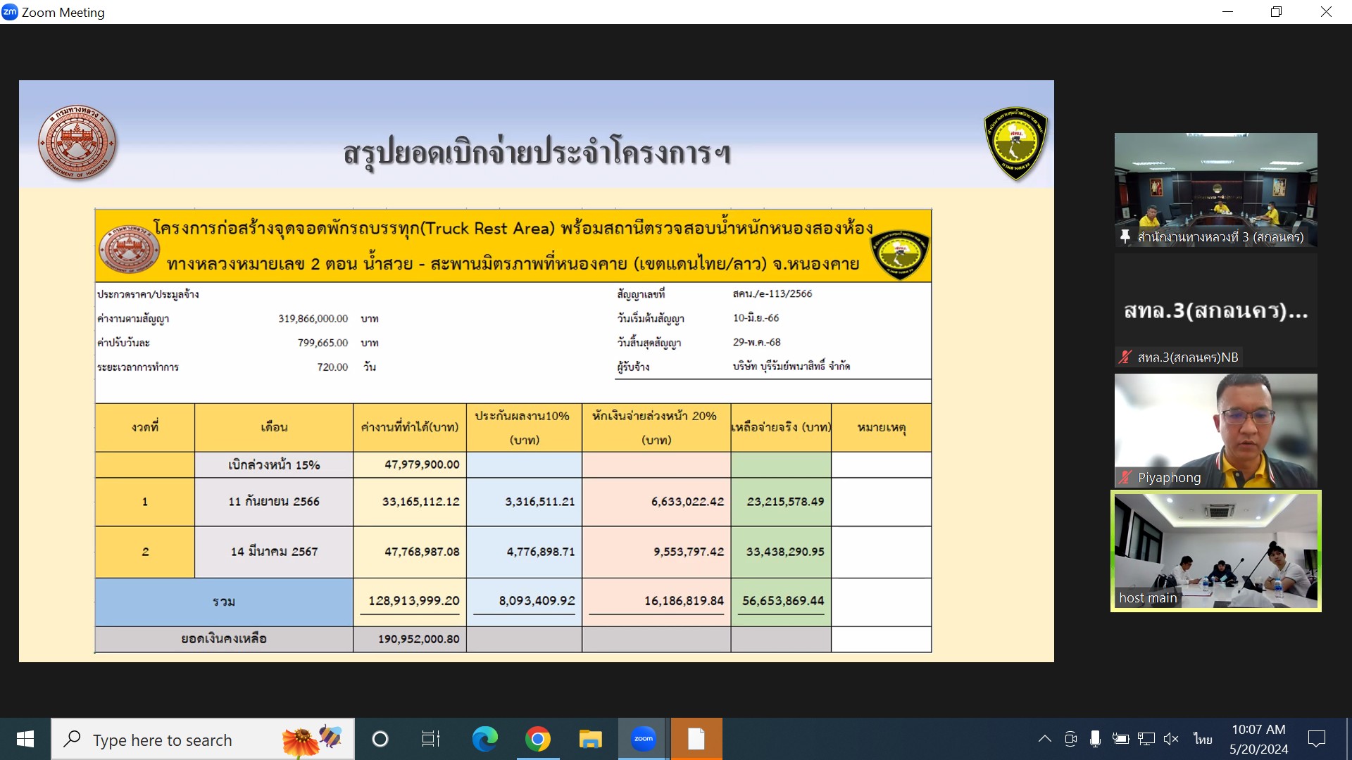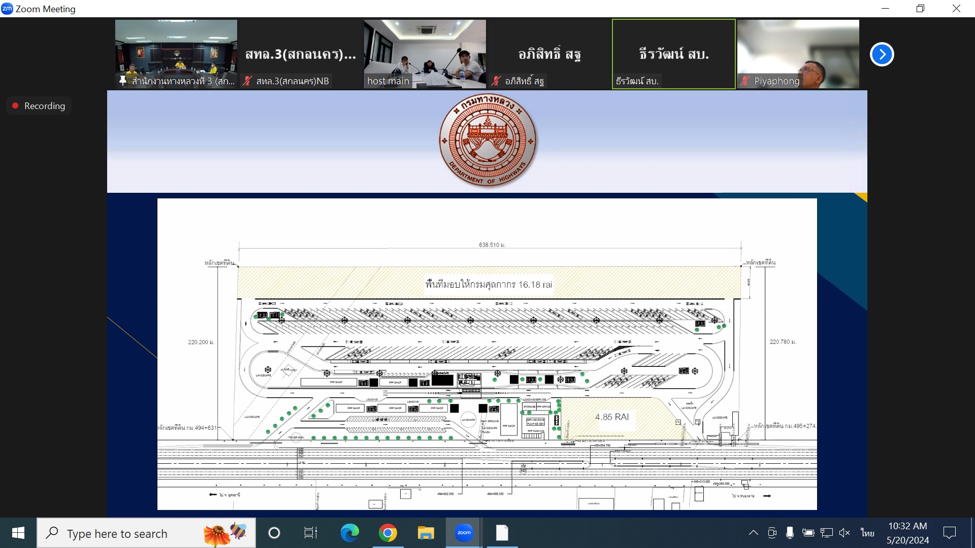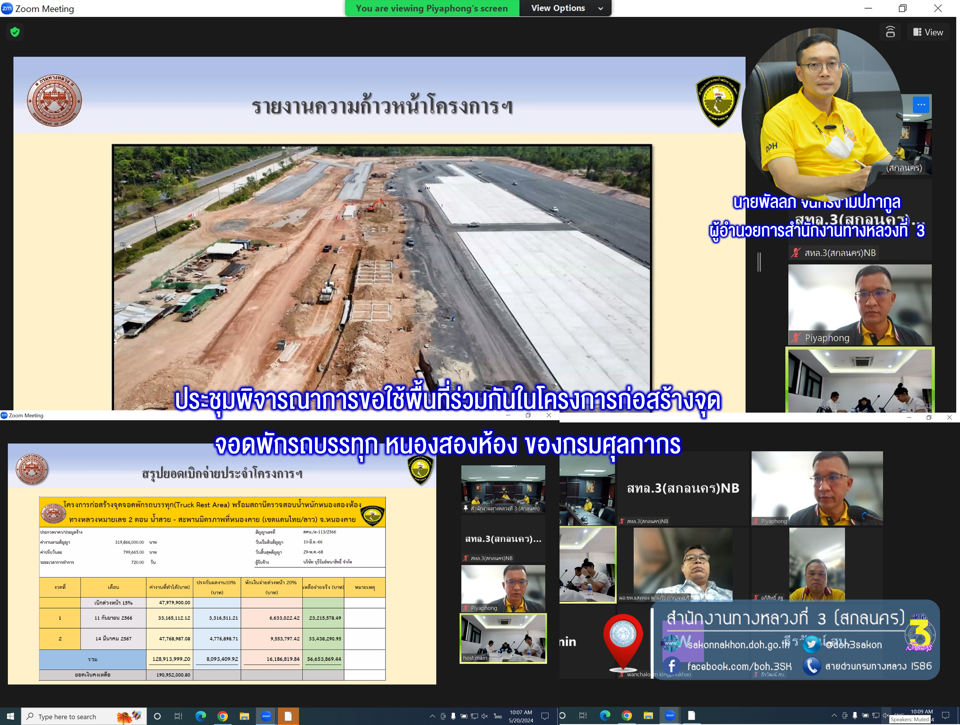 วันที่ 20 พฤษภาคม 2567 เวลา10.00น.นายพัลลภ จันทร์งามปภากูล ผู้อำนวยการสำนักงานทางหลวงที่ 3 พร้อมด้วย นายชินนพัทธ์ มุลทาทอง ผู้อำนวยการส่วนแผนงาน นายธนพนธ์ กิตติธรรม นายช่างโยธาชำนาญงาน ส่วนแผนงาน เข้าร่วมประชุมพิจารณาการขอใช้พื้นที่ร่วมกันในโครงการก่อสร้างจุดจอดพักรถบรรทุก (Truck rest area) พร้อมสถานีตรวจสอบน้ำหนักหนองสองห้อง ของกรมศุลกากรผ่านระบบออนไลน์ Zoom Cloud Meeting ณ ห้องประชุมทวีพัฒน์ ตินะมาส ชั้น 3 (อาคารหลังใหม่) จัดโดย สำนักงานควบคุมน้ำหนักยานพาหนะ กรมทางหลวง