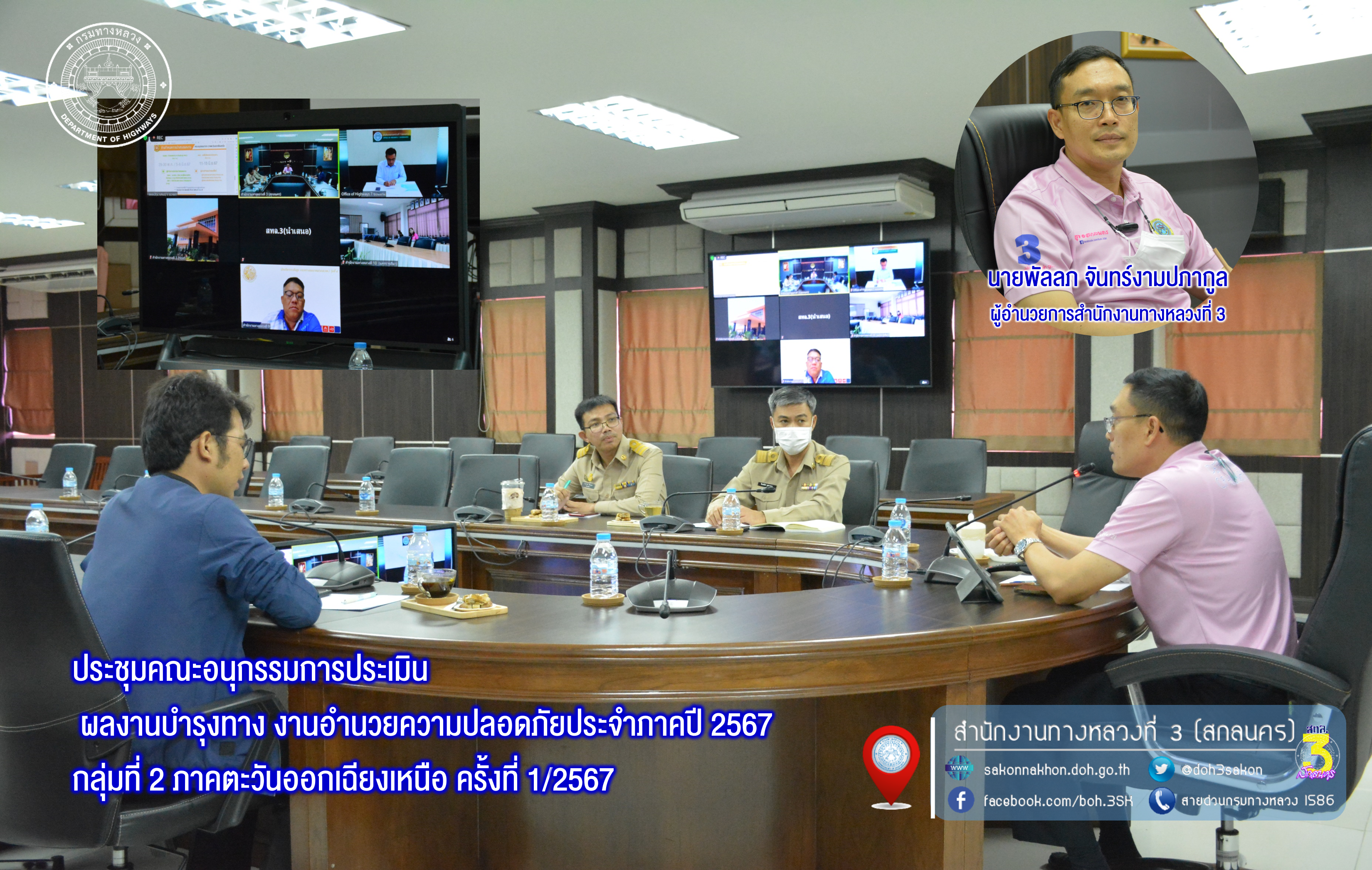 วันที่ 21 พฤษภาคม 2567 เวลา 13.30 - 16.30 น.นายพัลลภ จันทร์งามปภากูล ผู้อำนวยการสำนักงานทางหลวงที่ 3 ประธาน พร้อมด้วย นายชินนพัทธ์ มุลทาทอง ผู้อำนวยการส่วนแผนงาน นายอำนาจ สาไชยันต์ ผู้อำนวยการส่วนเทคโนโลยีสารสนเทศ และนายธนากรณ์ ติยะบุตร วิศวกรโยธาปฏิบัติการ ส่วนแผนงาน เข้าร่วมประชุมคณะอนุกรรมการประเมิน ผลงานบำรุงทาง งานอำนวยความปลอดภัยประจำภาคปี 2567 กลุ่มที่ 2 ภาคตะวันออกเฉียงเหนือ ครั้งที่ 1/2567 โดยมีคณะอนุกรรมการประเมินผลงานฯ เข้าร่วมประชุมผ่านระบบออนไลน์ Zoom meeting ณ ห้องประชุมทวีพัฒน์ ตินะมาส ชั้น 3 (อาคารหลังใหม่)
