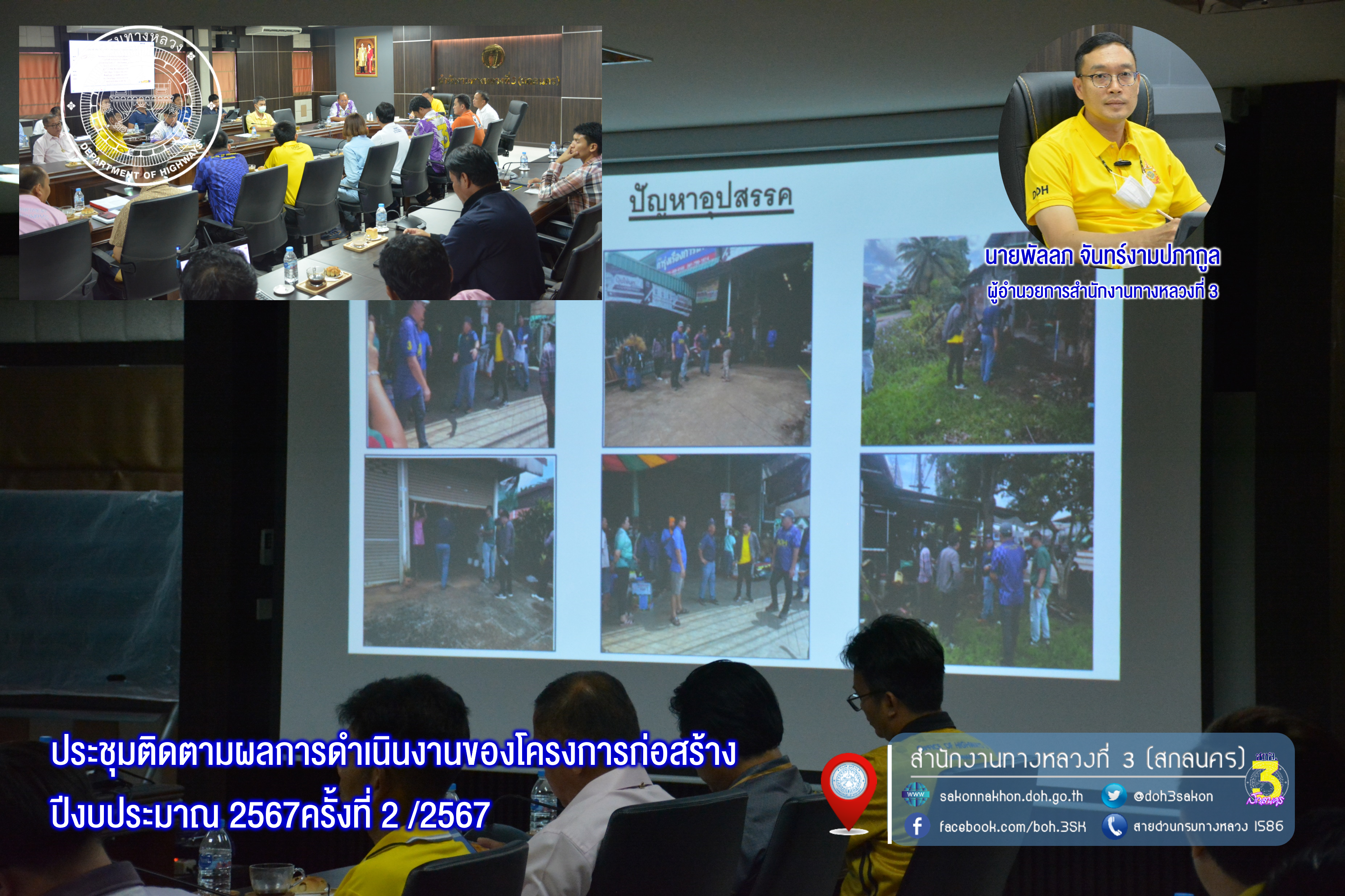 วันที่ 28 พฤษภาคม 2567 เวลา 13.30 น.นายพัลลภ จันทร์งามปภากูล ผู้อำนวยการสำนักงานทางหลวงที่ 3 เป็นประธานประชุมติดตามผลการดำเนินงานของโครงการก่อสร้างปีงบประมาณ 2567ครั้งที่ 2 /2567ประจำเดือนพฤษภาคม 2567 ในการประชุมครั้งนี้มีนายวุฒิพงศ์ คำภูแสน รส.ทล.3.1 นายประวัติ เสวตวงษ์ รส.ทล.3.2 นายชินนพัทธ์ มุลทาทอง วผ.ทล.3 นายพงษ์ศักดิ์ อาจลา วบ.ทล.3 นายเรืองฤทธิ์ ทิพย์วังเมฆ วว.ทล.3 พร้อมด้วยวิศวกรโยธา/นายช่างโยธาส่วนแผนงาน ส่วนสำรวจและออกแบบ ส่วนตรวจสอบและวิเคราะห์ทางวิศวกรรม ส่วนควบคุมงานก่อสร้างทาง และรองผู้อำนวยการแขวงทางหลวงสกลนครที่ 2 (สว่างแดนดิน) ฝ่ายวิศวกรรม/ฝ่ายปฏิบัติการ ส่วนแขวงทางหลวงนครพนม มีรองผู้อำนวยการฯ ฝ่ายวิศวกรรม เข้าร่วมประชุมฯ พร้อมนำเสนอผลการดำเนินงานโครงการก่อสร้างปี 2567 (โครงการฯที่รับผิดชอบ) ณ ห้องประชุมทวีพัฒน์ ตินะมาส ชั้น 3 (อาคารหลังใหม่)