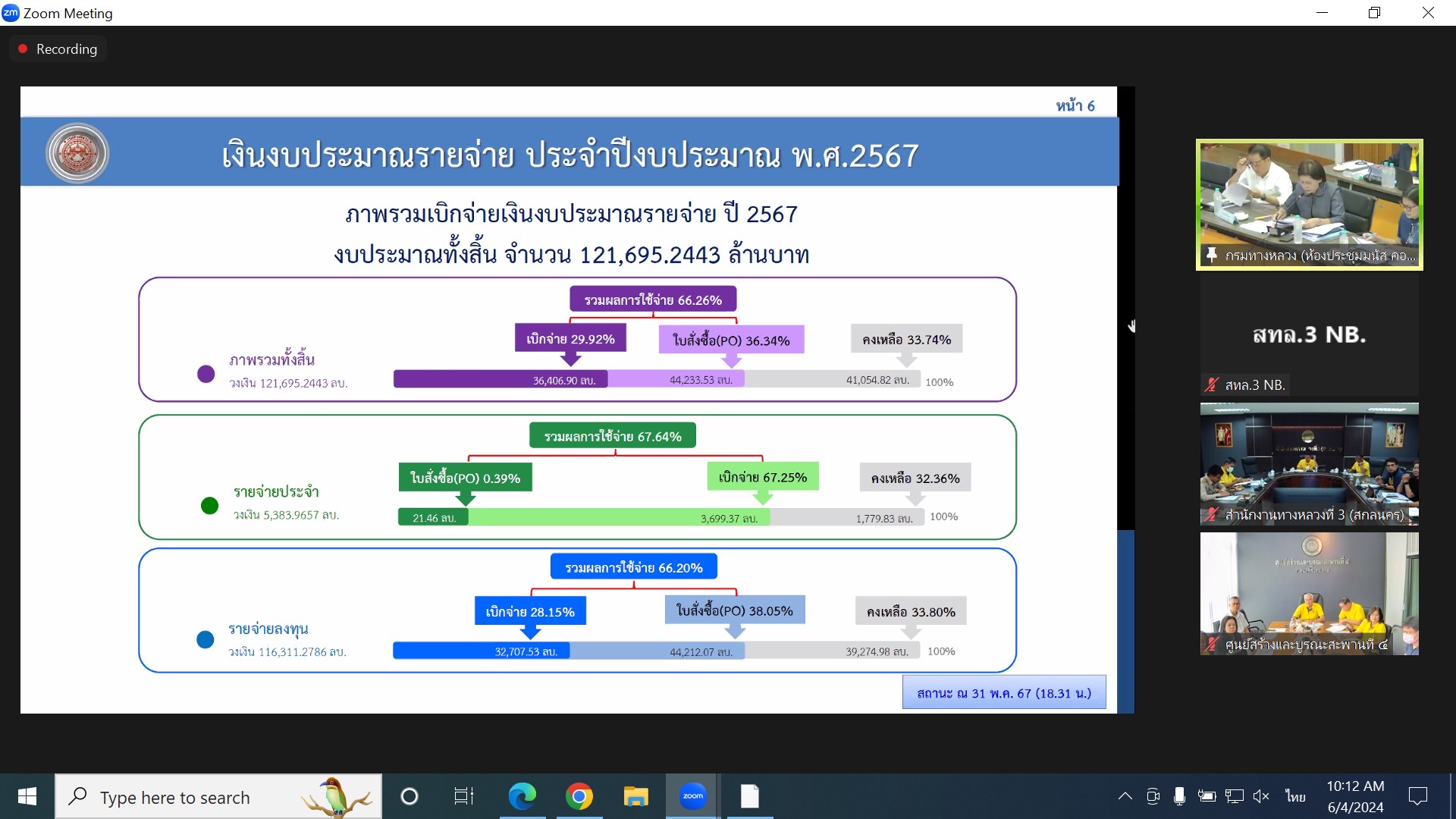 วันที่ 4 มิถุนายน 2567 เวลา 10.00 น.นายพัลลภ จันทร์งามปภากูล ผู้อำนวยการสำนักงานทางหลวงที่ 3 (สกลนคร) พร้อมด้วย นายประวัติ เสวตวงษ์ รองผู้อำนวยการสำนักงานทางหลวงที่ 3 นายชินนพัทธ์ มุลทาทอง ผู้อำนวยการส่วนแผนงาน นางนภาพิศ สุวรรณศรี ผู้อำนวยการฝ่ายบริหารงานทั่วไป นายอำนาจ สาไชยันต์ ผู้อำนวยการส่วนเทคโนโลยีสารสนเทศ นางรุ่งดาว ชมภูวิเศษ หัวหน้างานการเงินและบัญชี วิศวกรโยธาและนายช่างโยธาส่วนแผนงาน เข้าร่วมประชุมเร่งรัดและติดตามผลการดำเนินงานและการเบิกจ่ายเงินงบประมาณประจำปี พ.ศ. 2567 ครั้งที่ 2/2567 ของกรมทางหลวง ผ่านระบบออนไลน์ Zoom ณ ห้องประชุมทวีพัฒน์ ตินะมาส ชั้น 3 (อาคารหลังใหม่) โดยมีนายนายสราวุธ ทรงศิวิไล อธิบดีกรมทางหลวง เป็นประธาน การประชุมในครั้งนี้มีหน่วยงานสังกัดกรมทางหลวงทั้ง 18 สำนักฯ เข้าร่วมประชุมผ่านระบบออนไลน์ Zoom ด้วย