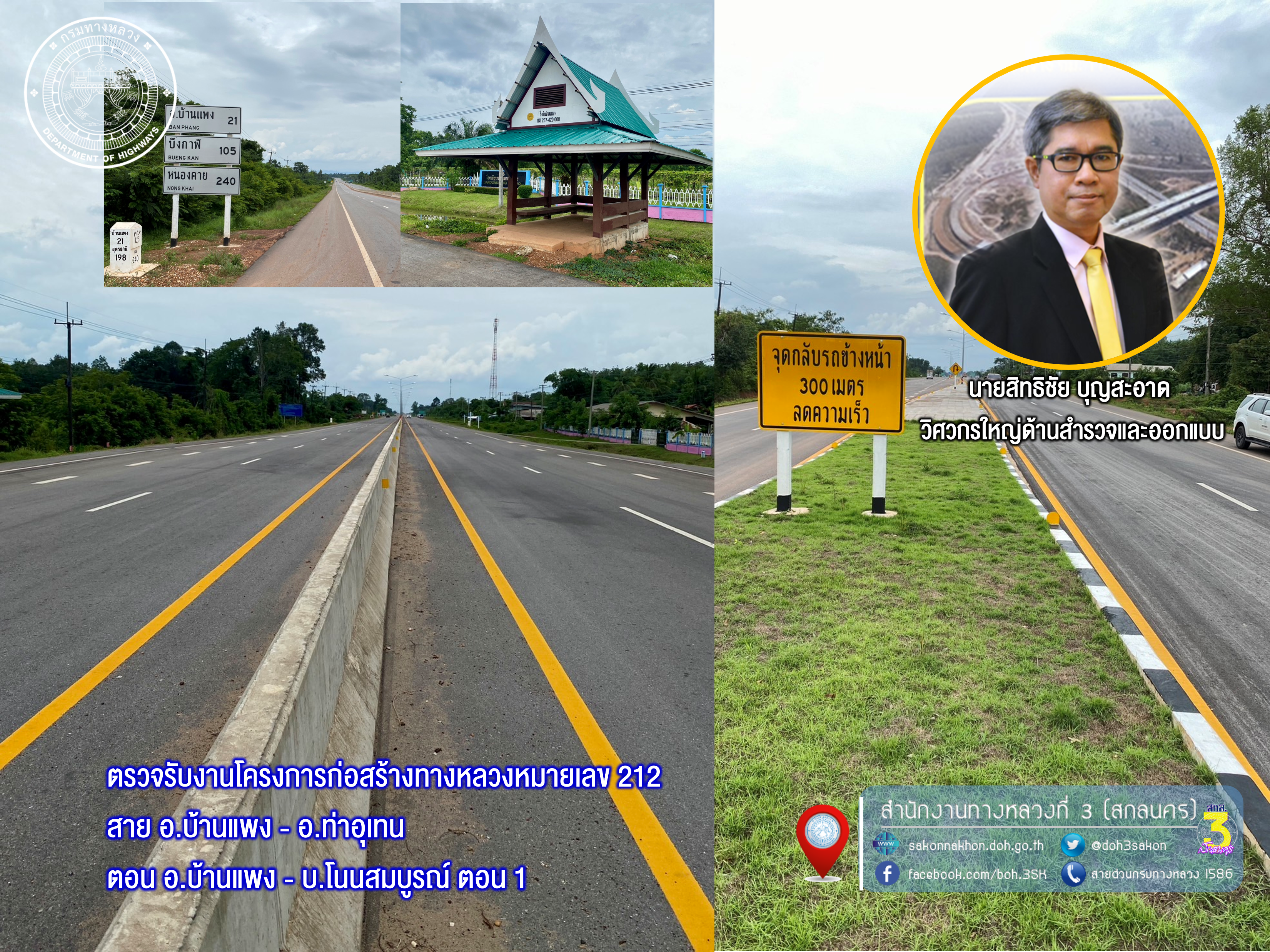 วันที่ 7 มิถุนายน 2567 เวลา 11.00 น. นายสิทธิชัย บุญสะอาด วิศวกรใหญ่ด้านสำรวจและออกแบบ ประธานกรรมการตรวจรับพัสดุ พร้อมด้วยนายพัลลภ จันทร์งามปภากูล ผู้อำนวยการสำนักงานทางหลวงที่ 3 กรรมการตรวจรับพัสดุ และคณะกรรมการตรวจรับพัสดุ ลงพื้นที่ตรวจรับงานโครงการก่อสร้างทางหลวงหมายเลข 212 ตอน อ.บ้านแพง - บ.โนนสมบูรณ์ ตอน 1 ระหว่าง กม.222+743 - กม.237+000 ระยะทางรวม 14.257 กิโลเมตร วงเงินงบประมาณ 669,440,320.00 บาท (ตรวจรับงานงวดสุดท้าย ) เพื่อให้ได้ตามแบบมาตรฐานก่อสร้างทางหลวงแผ่นดินของกรมทางหลวง กระทรวงคมนาคม โดยมี บริษัท กิจรุ่งเรืองก่อสร้าง จำกัด เป็นผู้รับจ้าง ควบคุมการก่อสร้างโดยสำนักก่อสร้างทางที่ 2 พร้อมรับฟังบรรยายสรุปผลการดำเนินงานของโครงการฯ ณ ห้องประชุมสำนักงานชั่วคราวของโครงการฯ