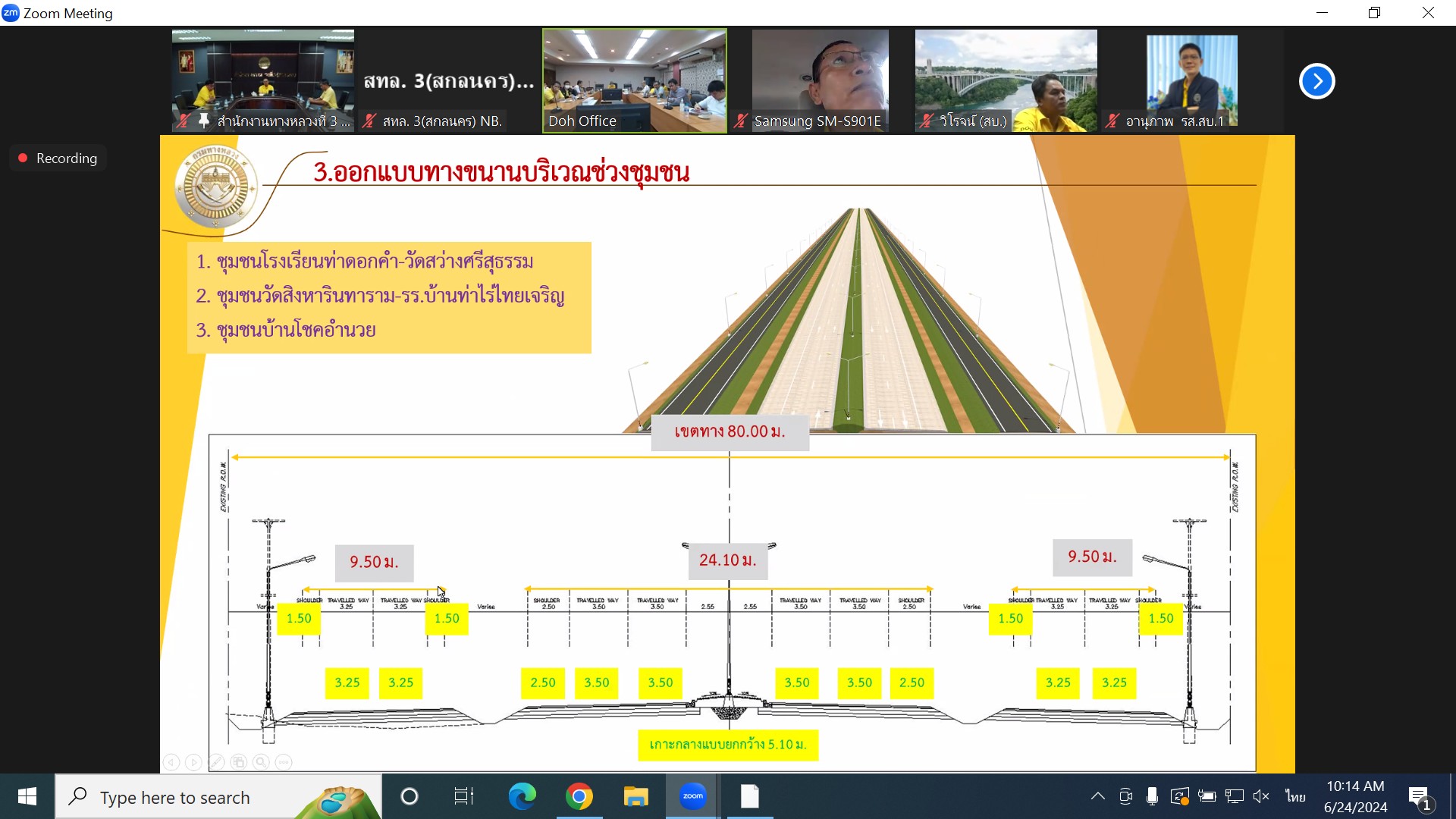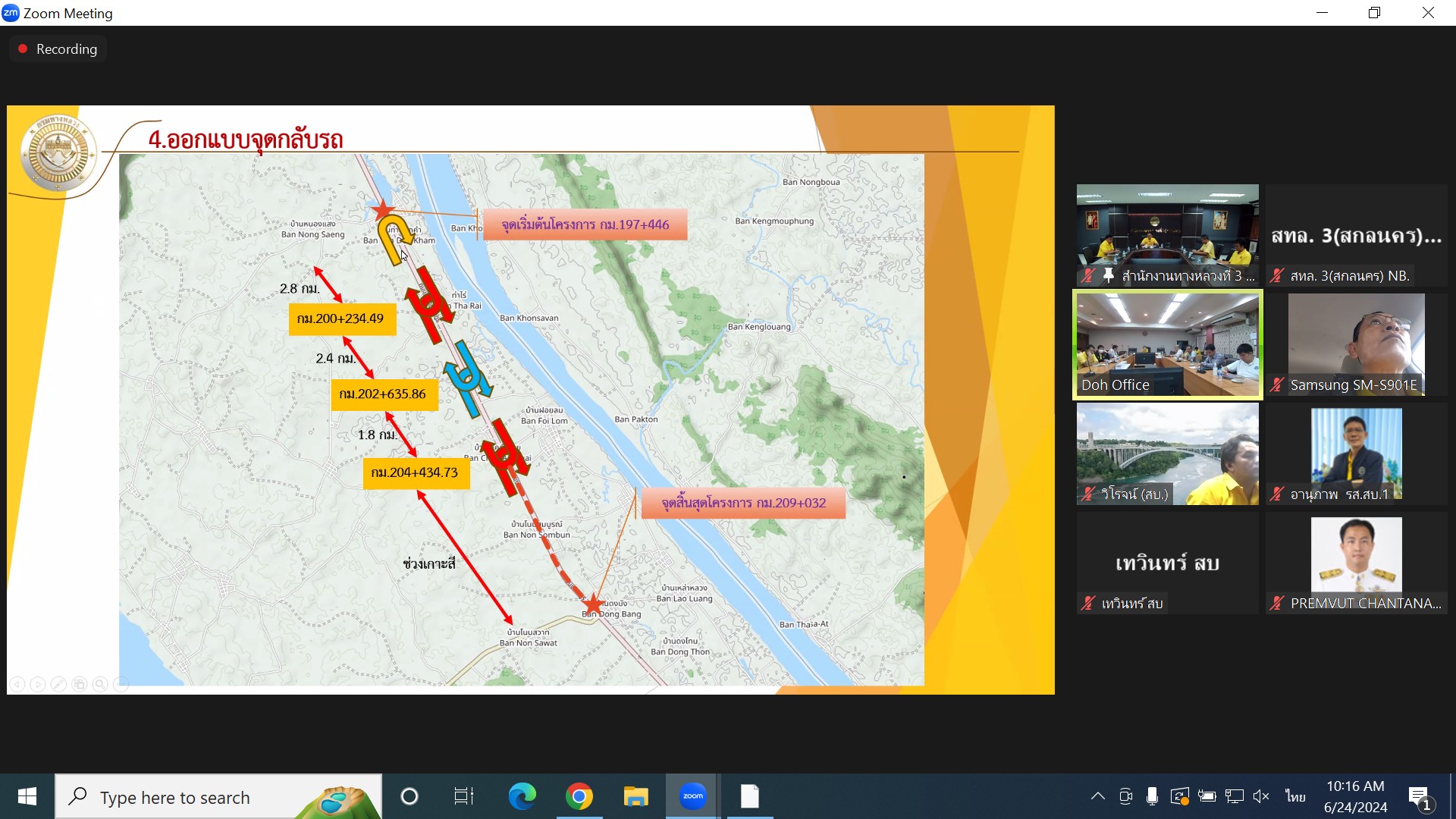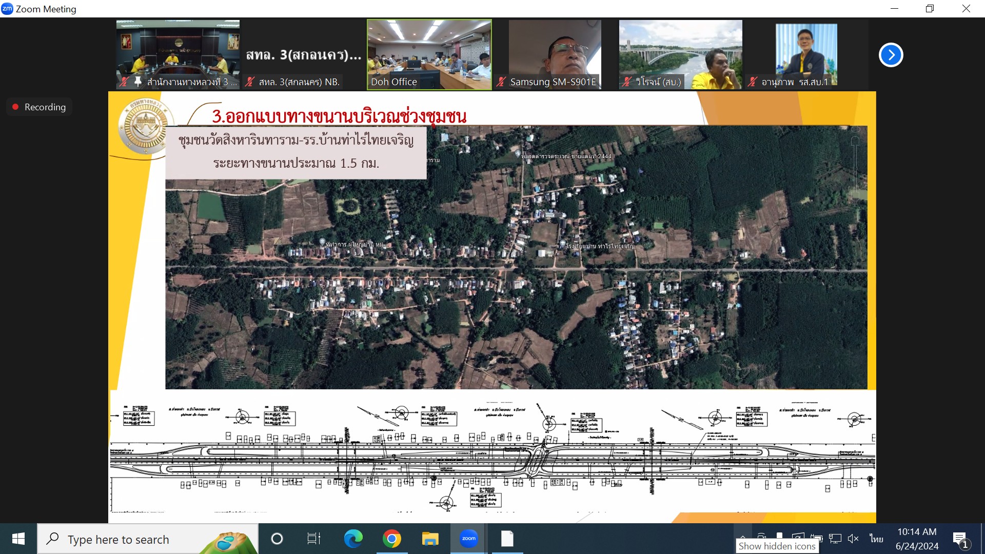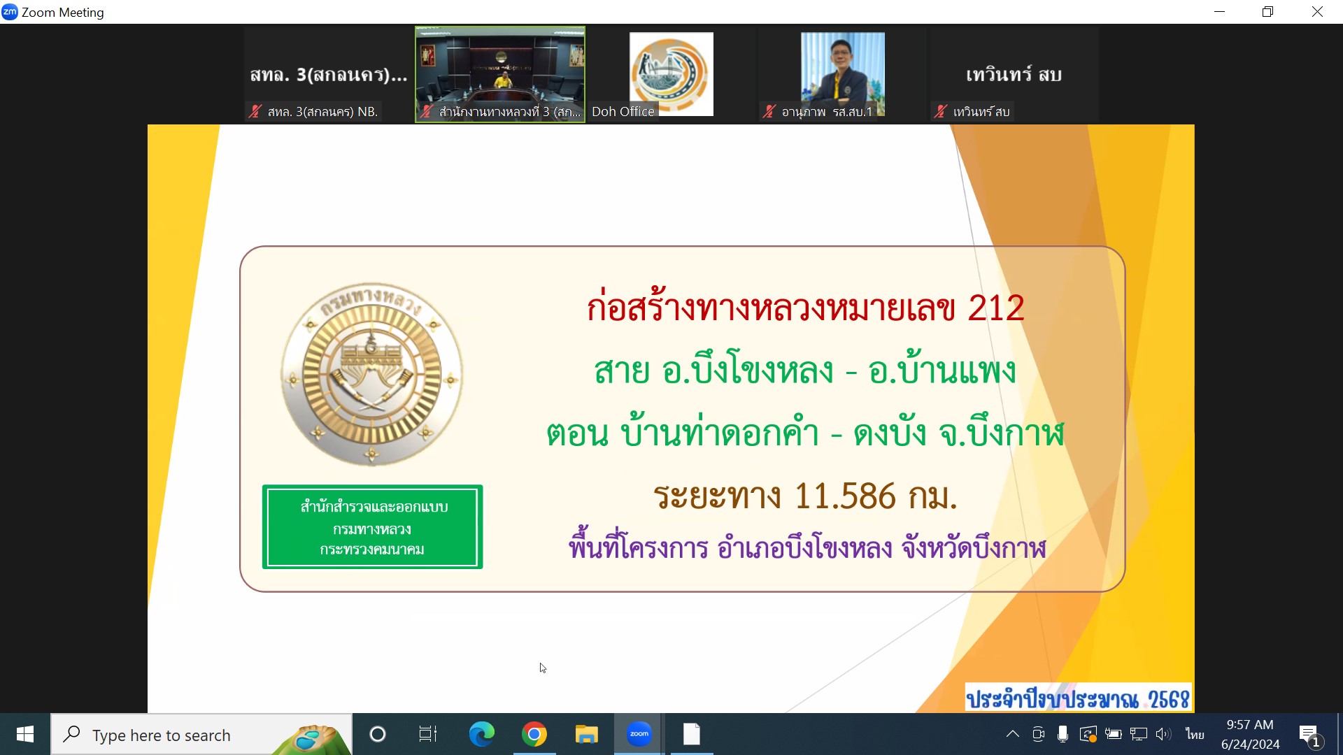 วันที่ 24 มิถุนายน 2567 เวลา 10.00 น.นายพัลลภ จันทร์งามปภากูล ผู้อำนวยการสำนักงานทางหลวงที่ 3 (สกลนคร) พร้อมด้วยนายชินนพัทธ์ มุลทาทอง ผู้อำนวยการส่วนแผนงาน นายพงษ์ศักดิ์ อาจลา ผู้อำนวยการส่วนสำรวจและออกแบบ และนายผดุง ศรีโคตา วิศวกรโยธาชำนาญการ ร่วมประชุมพิจารณาแนวทางออกแบบให้เหมาะสม (Conceptual Design) โครงการปีงบประมาณ 2568 ของทางหลวงหมายเลข 212 สาย อ.บึงโขงหลง - อ.บ้านแพง ตอน บ้านท่าดอกคำ - ดงบัง ระหว่าง กม.197+446 - กม.209+032 เพื่อพิจารณาแนวทางออกแบบให้เหมาะสม (Conceptual Design)และให้เกิดประโยชน์สูงสุดการโครงการฯ ผ่านระบบ Zoom Cloud Meeting ณ ห้องประชุม ชั้น 3 อาคารหลังใหม่ สำนักงานทางหลวงที่ 3 (สกลนคร) โดยมีนายสิทธิชัย บุญสะอาด วิศวกรใหญ่ด้านสำรวจและออกแบบ เป็นประธาน จัดโดยสำนักสำรวจและออกแบบ กรมทางหลวง