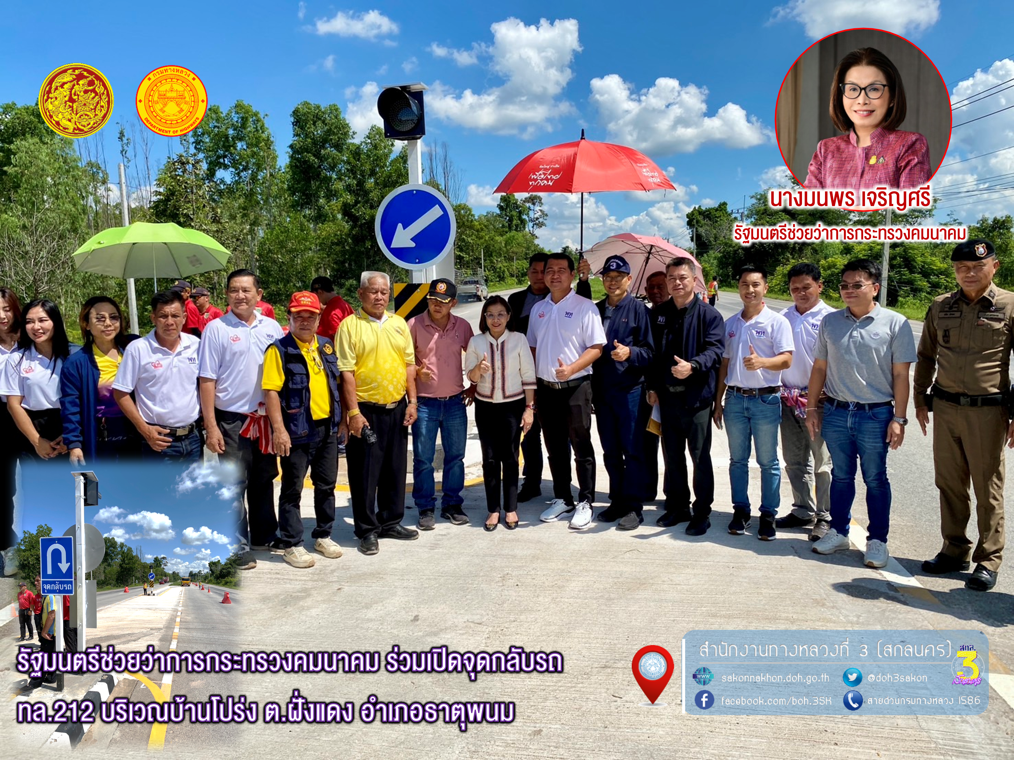 เวลา 14.00 น. ดร.มนพร เจริญศรี รัฐมนตรีช่วยว่าการกระทรวงคมนาคม ร่วมเปิดจุดกลับรถ ทล.212 บริเวณบ้านโปร่ง ต.ฝั่งแดง อำเภอธาตุพนม