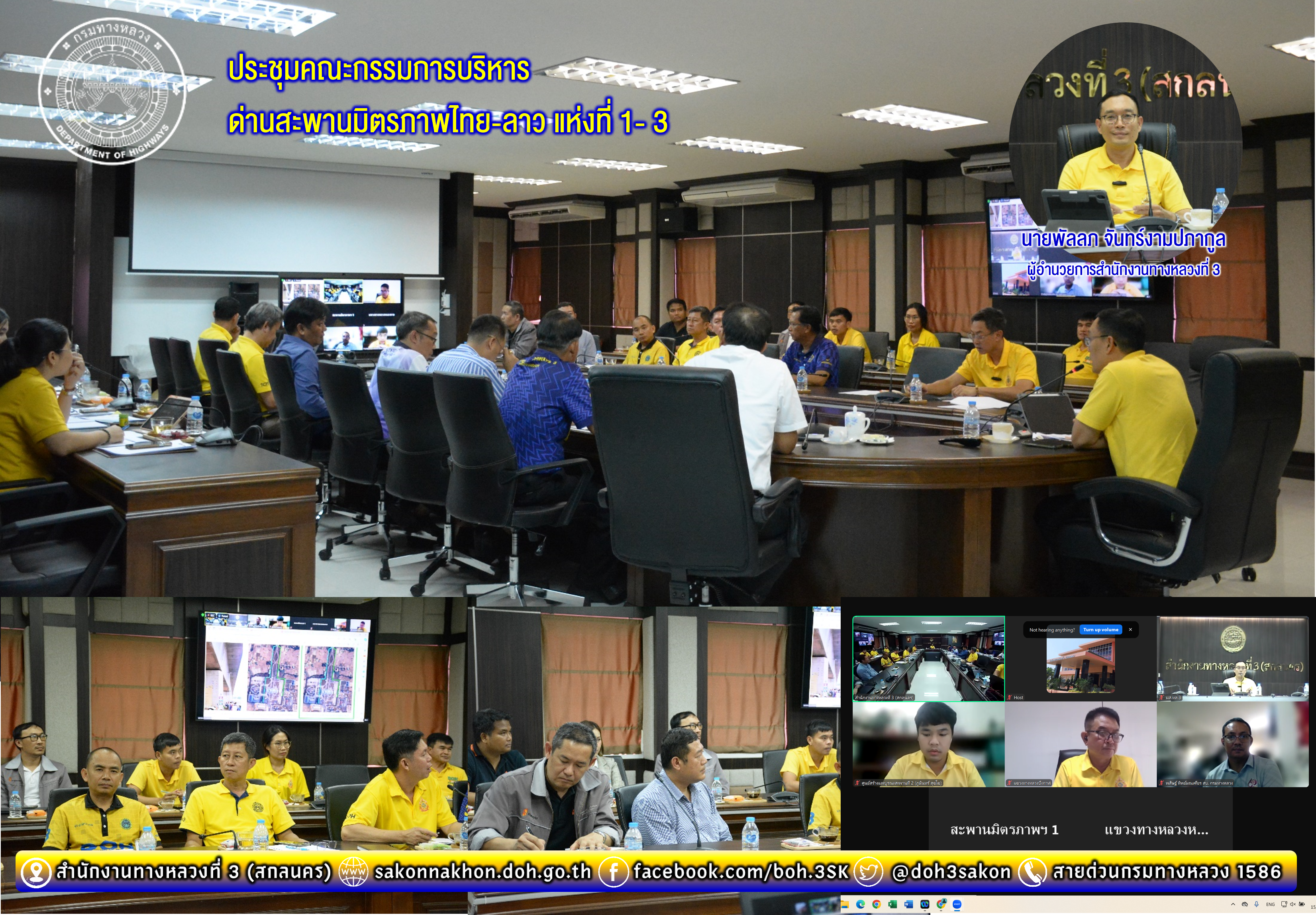 วันที่ 15 สิงหาคม 2567 เวลา 13.30 น. นายพัลลภ จันทร์งามปภากูล ผู้อำนวยการสำนักงานทางหลวงที่ 3 ประธานคณะกรรมการบริหารด่านสะพานมิตรภาพไทย-ลาว พร้อมด้วย นายประวัติ เสวตวงษ์ รองผู้อำนวยการสำนักงานทางหลวงที่ 3 ,นายพิชญ รุ่งเรืองวิโรจน์ ผู้อำนวยการแขววงทางหลวงนครพนม ,นายหนูกาญ เจริญไชย อำนวยการส่วนกฎหมายและกรรมสิทธิ์ที่ดิน, ผู้จัดการด่านสะพานมิตรภาพไทย-ลาว ทั้ง 3 แห่ง คือแห่งที่ 1 (หนองคาย-เวียงจันทน์) แห่งที่ 2 (มุกดาหาร-สะหวันนะเขต) และแห่งที่ 3(นครพนม-คำม่วน) และเจ้าหน้าที่ที่เกี่ยวข้อง ส่วนแผนงาน ส่วนอำนวยความปลอดภัย ส่วนกฎหมายและกรรมสิทธิ์ที่ดิน และนิติกร เข้าร่วมประชุมคณะกรรมการบริหารด่านสะพานมิตรภาพไทย-ลาว (ในเขตพื้นที่ควบคุมของ สำนักงานทางหลวงที่ 3 (สกลนคร) เพื่อพิจารณาการขออนุญาตติดตั้งสายเคเบิลใยแก้วนำแสงบริเวณสะพานมิตรภาพไทย-ลาว แห่งที่ 1 (หนองคาย - เวียงจันทน์) และ สะพานมิตรภาพไทย-ลาว แห่งที่ 2 (มุกดาหาร-สะหวันนะเขต) ณ ห้องประชุมทวีพัฒน์ ตินะมาส ชั้น 3 โดยมีแขวงทางหลวงในสังกัด, สำนักสำรวจและออกแบบ และศูนย์สร้างและบูรณะสะพานที่2 (ขอนแก่น) เข้าประชุมออนไลน์ผ่านทาง Zoom Meeting ของสำนักงานทางหลวงที่ 3 (สกลนคร)