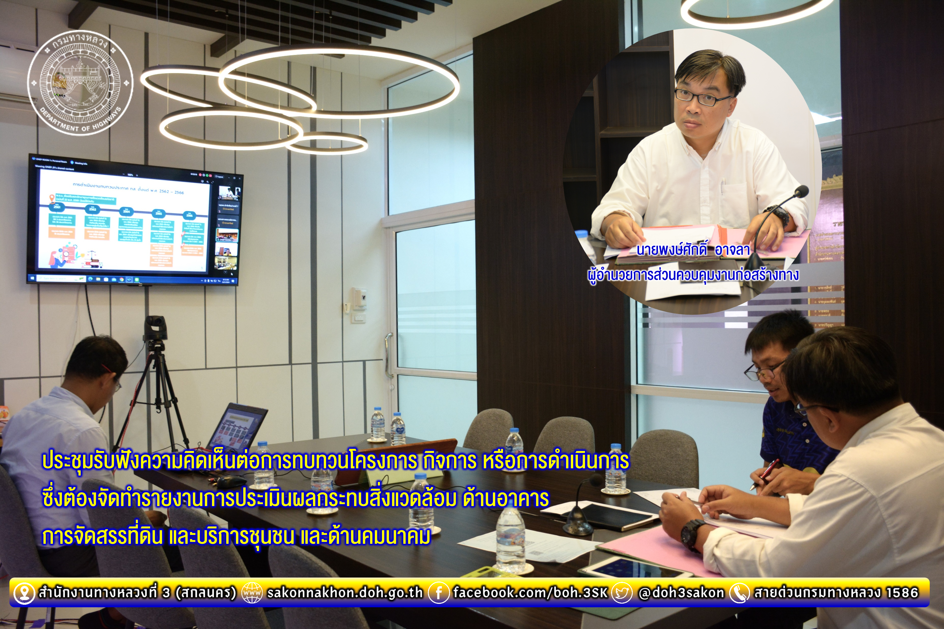 วันที่ 21 สิงหาคม 2567 เวลา 08.00 - 16.00 น. นายพงษ์ศักดิ์ อาจลา ผู้อำนวยการส่วนควบคุมงานก่อสร้างทาง พร้อมด้วย นายธนากรณ์ ติยะบุตร วิศวกรโยธาส่วนแผนงาน เข้าร่วมประชุมรับฟังความคิดเห็นต่อการทบทวนโครงการ กิจการ หรือการดำเนินการซึ่งต้องจัดทำรายงานการประเมินผลกระทบสิ่งแวดล้อม ด้านอาคาร การจัดสรรที่ดิน และบริการชุนชน และด้านคมนาคม เพื่อนำข้อมูลมาประกอบการทบทวนโครงการ กิจการ หรือดำเนินการ ซึ่งต้องจัดทำรายงานการประเมินผลกระทบสิ่งแวดล้อม ผ่านระบบ Cisco Webex Meetings ณ ห้องประชุม ชั้น 2 อาคารหลังใหม่ สำนักงานทางหลวงที่ 3 (สกลนคร) จัดโดย สำนักงานนโยบายและแผนทรัพยากรธรรมชาติและสิ่งแวดล้อม