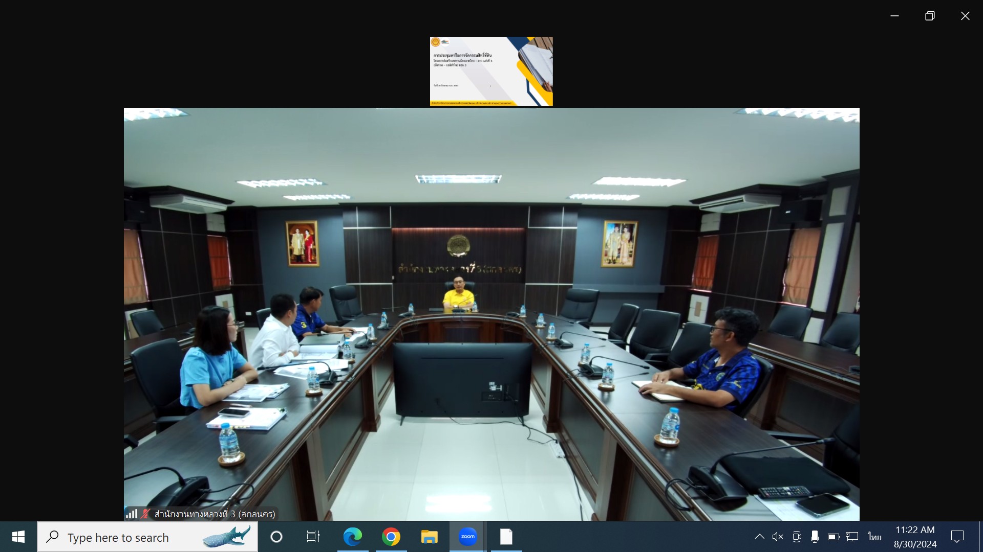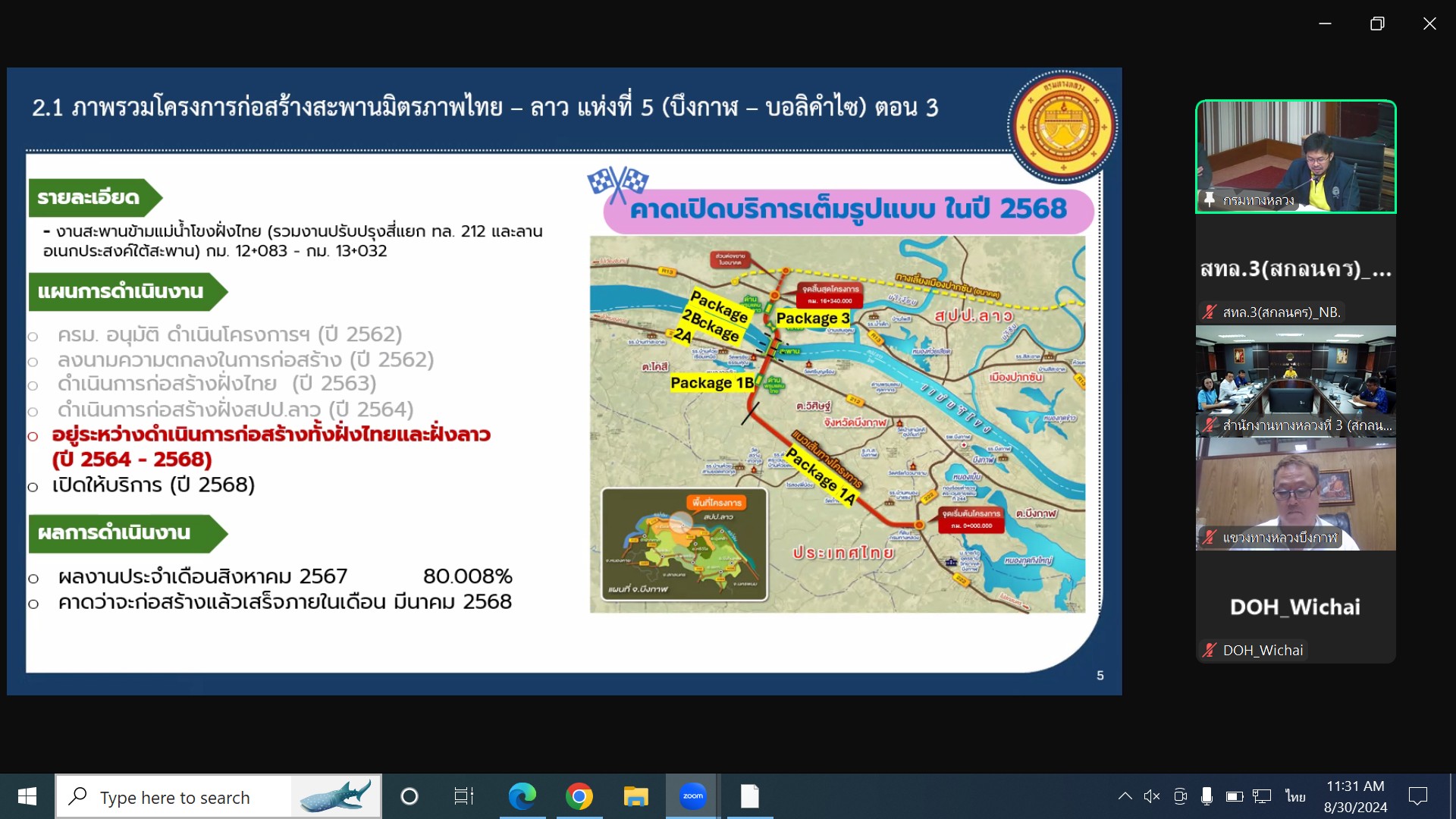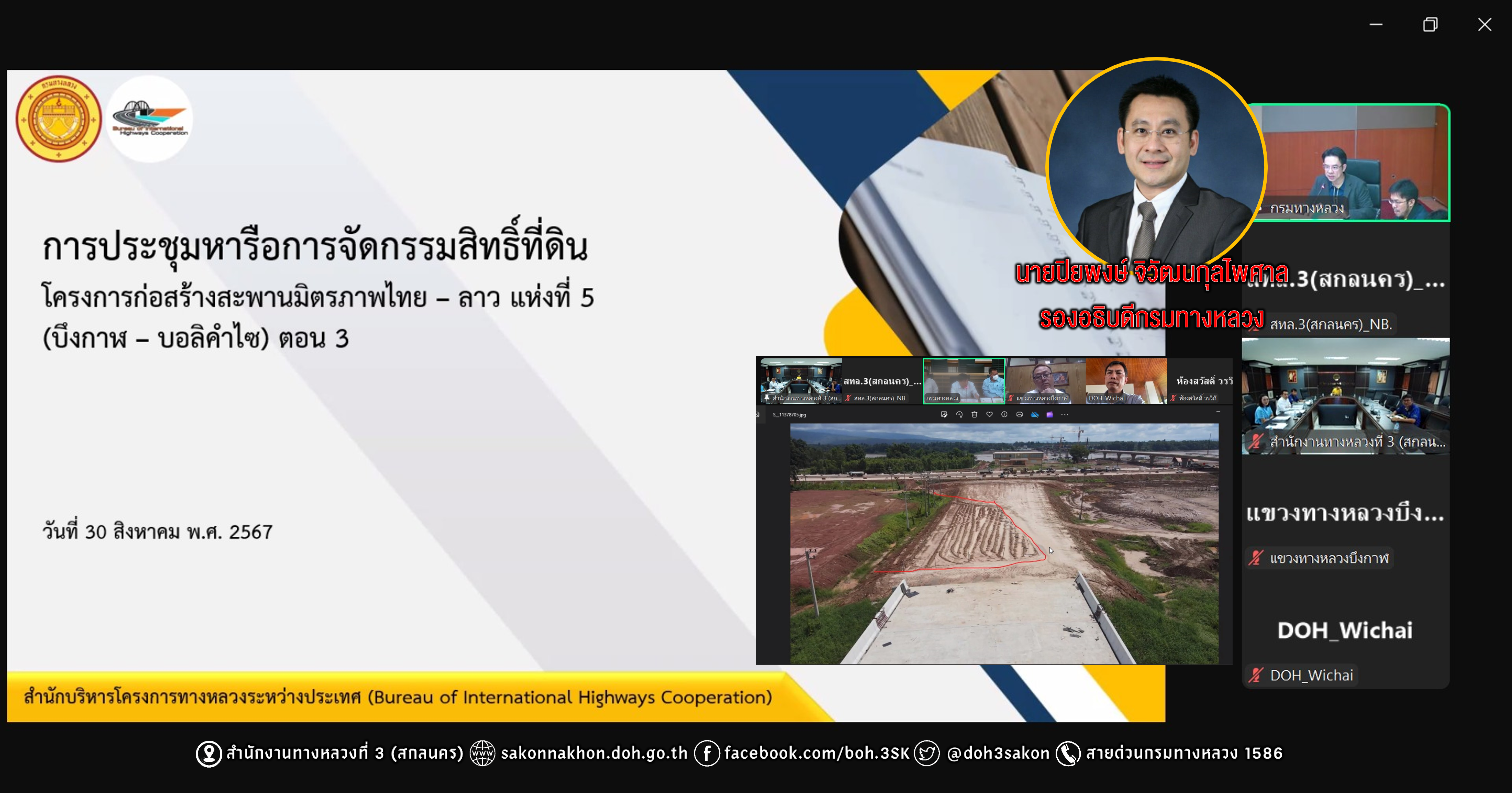 วันที่ 30 สิงหาคม 2567 เวลา 11.00-12.00 น. นายพัลลภ จันทร์งามปภากูล ผู้อำนวยการสำนักงานทางหลวงที่ 3 พร้อมด้วย นายหนูกาญ เจริญไชย ผู้อำนวยการส่วนกฎหมายและกรรมสิทธิ์ที่ดิน และเจ้าหน้าที่ส่วนแผนงาน ส่วนกฎหมายและกรรมสิทธิ์ที่ดิน เข้าร่วมประชุมหารือการจัดกรรมสิทธิ์ที่ดิน โครงการก่อสร้างสะพานมิตรภาพไทย - ลาว แห่งที่ 5 (บึงกาฬ - บอลิคำไซ) ตอน 3 ผ่านสื่ออิเล็กทรอนิกส์ (Zoom Video Conference) ณ ห้องประชุมทวีพัฒน์ ตินะมาส ชั้น 3 อาคารหลังใหม่ จัดโดย สำนักบริหารโครงการทางหลวงระหว่างประเทศ กลุ่มบริหารโครงการเงินกู้และเงินช่วยเหลือ โดยมี นายปิยพงษ์ จิวัฒนกุลไพศาล รองอธิบดีกรมทางหลวง ฝ่ายวิชาการ เป็นประธานฯ