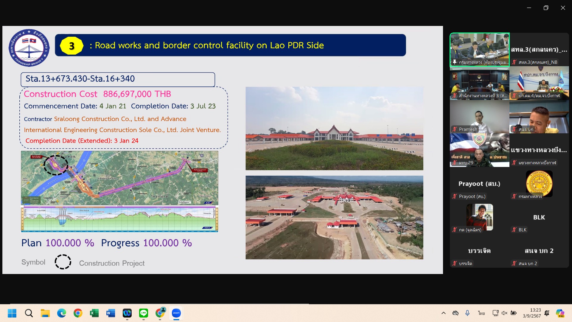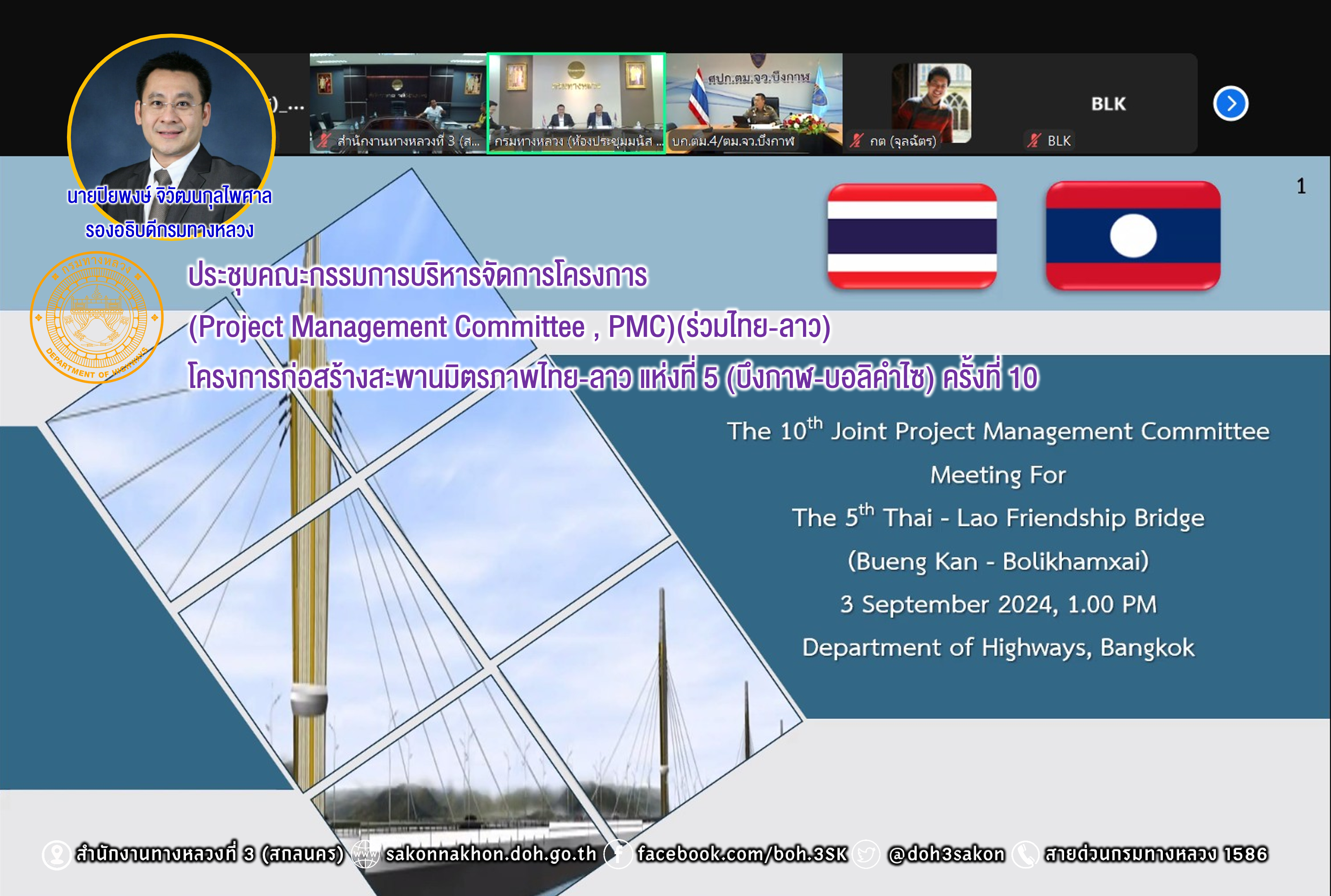 เวลา 13.30 น. นายพัลลภ จันทร์งามปภากูล ผู้อำนวยการสำนักงานทางหลวงที่ 3 มอบหมายให้ นายประวัติ เสวตวงษ์ รองผู้อำนวยการสำนักงานทางหลวงที่ 3 นายชินนพัทธ์ มุลทาทอง ผู้อำนวยการส่วนแผนงาน และนายพงษ์ศักดิ์ อาจลา ผู้อำนวยการส่วนควบคุมงานก่อสร้างทาง ร่วมประชุมคณะกรรมการบริหารจัดการโครงการ(Project Management Committee , PMC)(ร่วมไทย-ลาว) โครงการก่อสร้างสะพานมิตรภาพไทย-ลาว แห่งที่ 5 (บึงกาฬ-บอลิคำไซ) ครั้งที่ 10 ผ่านระบบ Zoom Cloud Meeting ณ ห้องประชุมทวีพัฒน์ ตินะมาส ชั้น 3 สำนักงานทางหลวงที่ 3 (สกลนคร) อาคารหลังใหม่