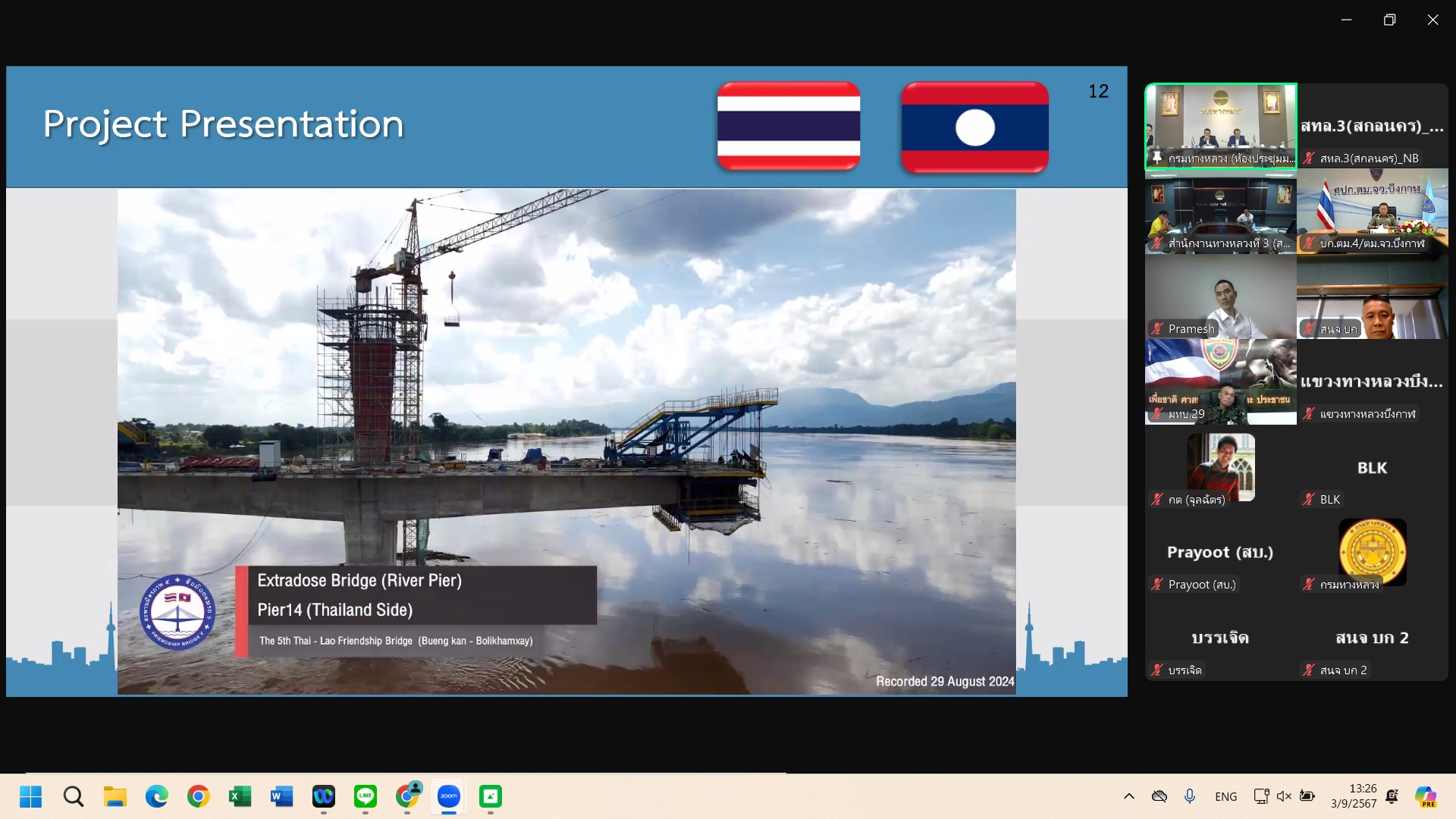 วันที่ 3 กันยายน 2567 นายปิยพงษ์ จิวัฒนกุลไพศาล รองอธิบดีกรมทางหลวง เป็นประธานร่วมฝั่งไทย ประชุมคณะกรรมการบริหารจัดการโครงการ(Project Management Committee , PMC)(ร่วมไทย-ลาว) โครงการก่อสร้างสะพานมิตรภาพไทย-ลาว แห่งที่ 5 (บึงกาฬ-บอลิคำไซ) ครั้งที่ 10 ผ่านระบบ Zoom Cloud Meeting จากห้องประชุมสวัสดิ์วรวิถี ชั้น2 อาคารพลหโยธิน กรมทางหลวง เพื่อติดตามผลการดำเนินงานของโครงการก่อสร้างสะพานมิตรภาพไทย-ลาว แห่งที่ 5 (บึงกาฬ-บอลิคำไซ)