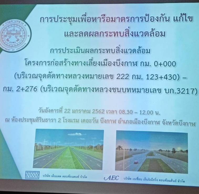 วันที่ 22มกราคม 2562 เวลา08.30น. นายหนูกาญ เจริญไชย และนางสาวกาญจนา แสนโคตร เจ้าหน้าที่ส่วนกฎหมายและกรรมสิทธิ์ที่ดินของสำนักงานทางหลวงที่ 3 (สกลนคร) พร้อมด้วย นายชัสดา พรมนันท์ และ นายณัฐกิตติ์บุญบู้ เจ้าหน้าที่โครงการจัดกรรมสิทธิ์ที่ดินที่ 2 เป็นตัวแทนเข้าร่วมประชุมเพื่อหารือมาตรการป้องกันแก้ไข และลดผลกระทบสิ่งแวดล้อมการประเมินผลกระทบสิ่งแวดล้อม ของโครงการก่อสร้างทางเลี่ยงเมืองบึงกาฬ ณ ห้องประชุมสิรินธารา 2 โรงแรมเดอะวันบึงกาฬ จังหวัดบึงกาฬ