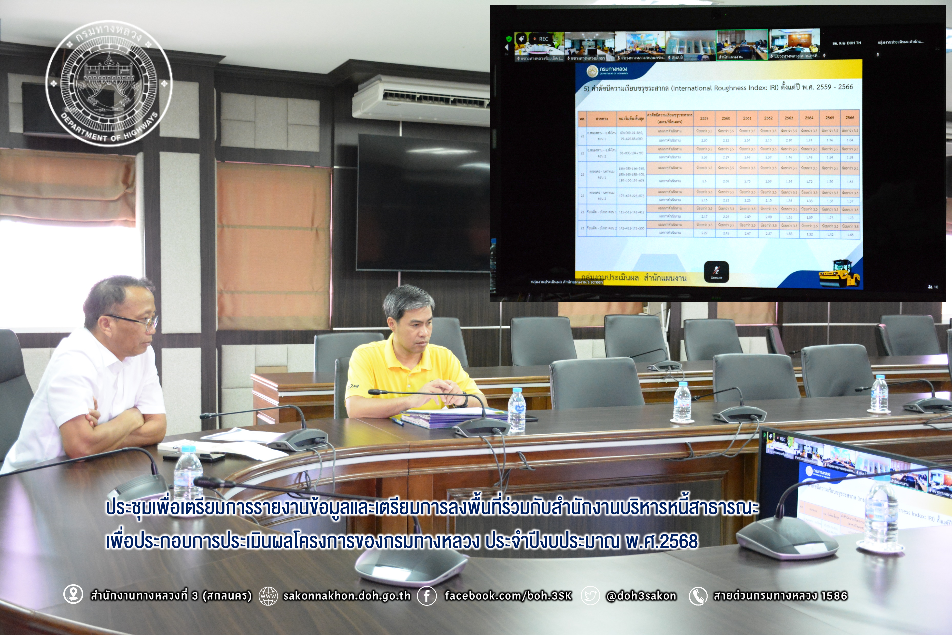วันที่ 18 พฤศจิกายน 2567 เวลา 10.00 - 12.00 น.นายประวัติ เสวตวงษ์ รองผู้อำนวยการสำนักงานทางหลวงที่ 3 ตำแหน่งที่ 2 พร้อมด้วย นายชินนพัทธ์ มุลทาทอง วผ.ทล.3 ได้รับมอบหมายจากผู้อำนวยการสำนักงานทางหลวงที่ 3 (สกลนคร) ให้เข้าร่วมประชุมเพื่อเตรียมการรายงานข้อมูลและเตรียมการลงพื้นที่ร่วมกับสำนักงานบริหารหนี้สาธารณะ เพื่อประกอบการประเมินผลโครงการของกรมทางหลวง ประจำปีงบประมาณ พ.ศ.2568 ผ่านระบบ Zoom Cloud Meeting ณ ห้องประชุมทวีพัฒน์ ตินะมาส ชั้น 3 อาคารหลังใหม่